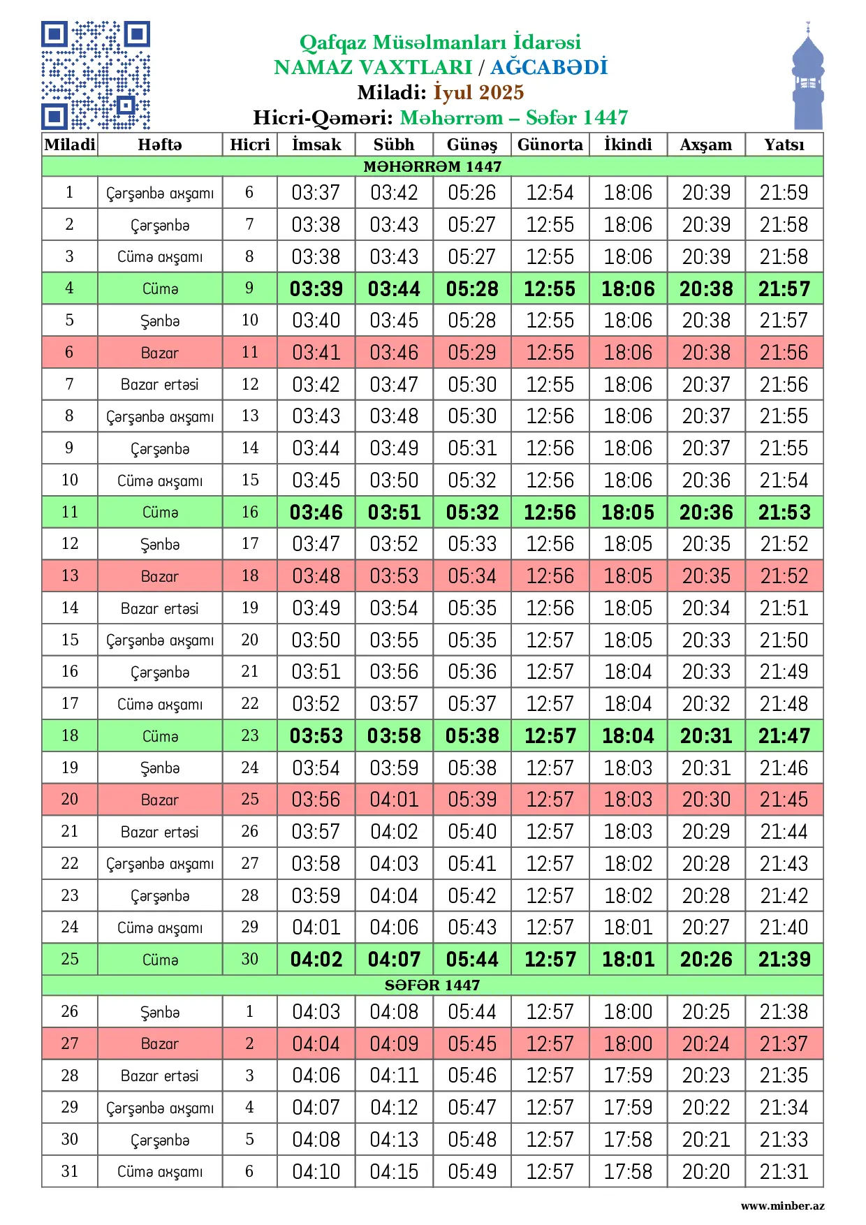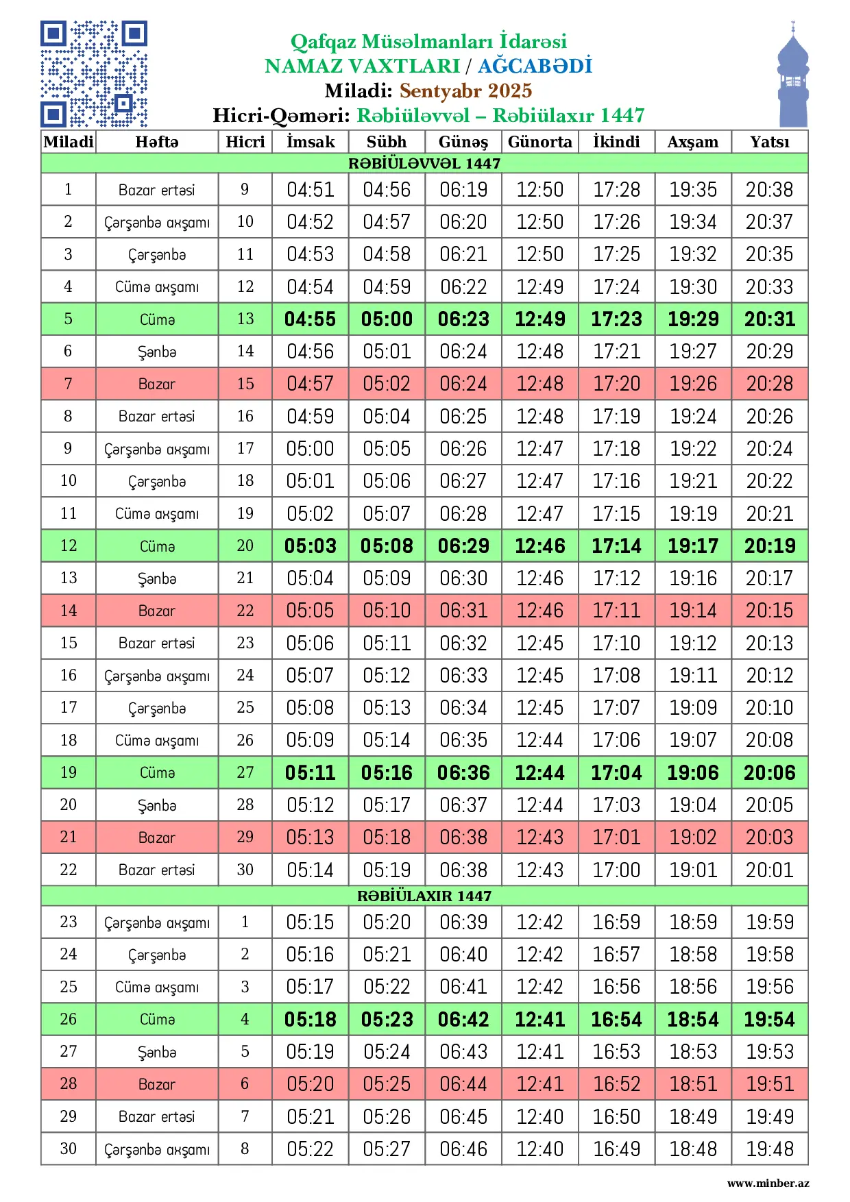 | 17 Noyabr 2025 | Bazar ertəsi | 26 Cəmadiyələvvəl 1447 | 06:10 | 06:15 | 07:38 | 12:35 | 15:53 | 17:48 | 18:51 |