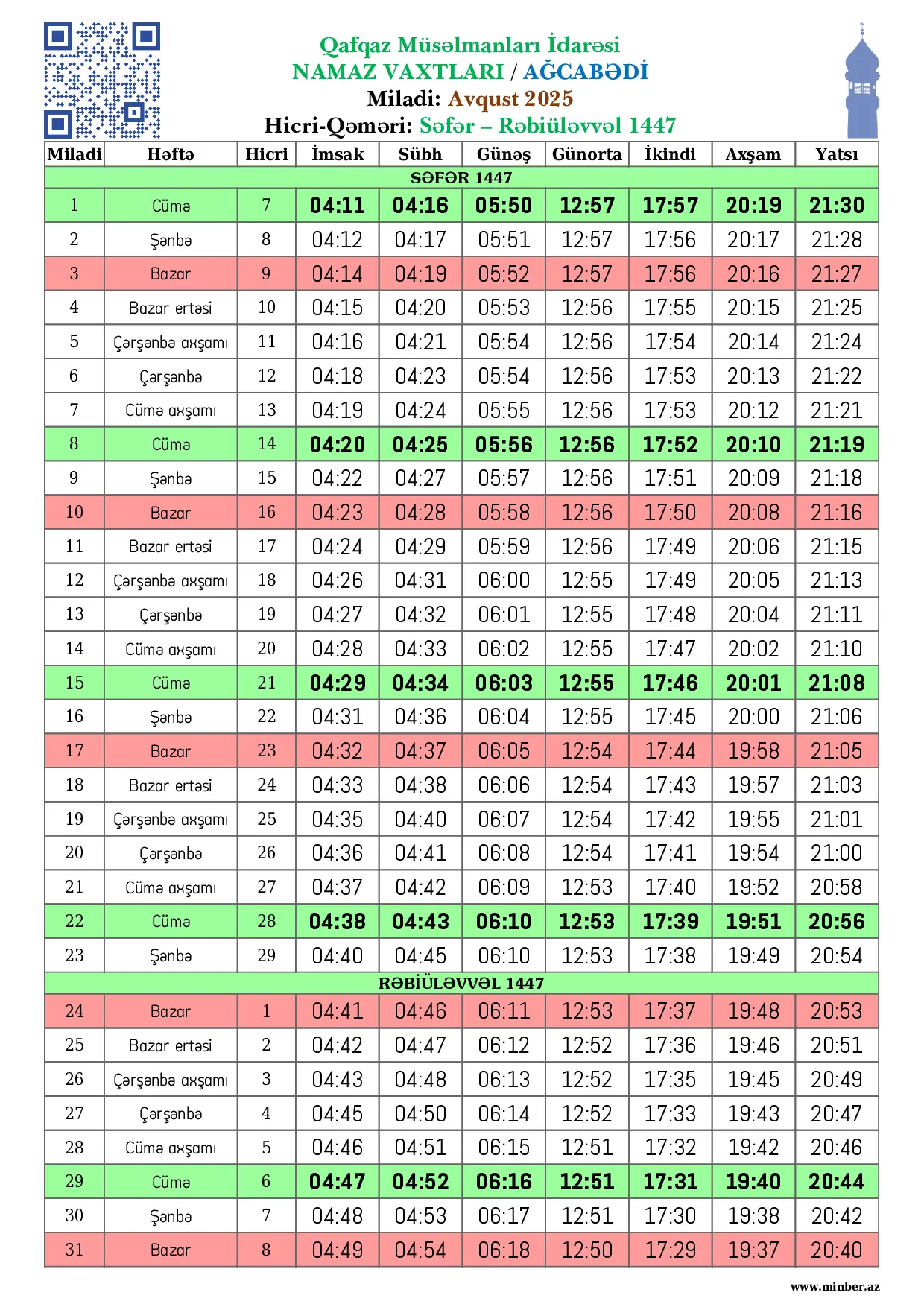| 20 Noyabr 2025 | Cümə axşamı | 29 Cəmadiyələvvəl 1447 | 06:13 | 06:18 | 07:41 | 12:36 | 15:51 | 17:46 | 18:49 |
