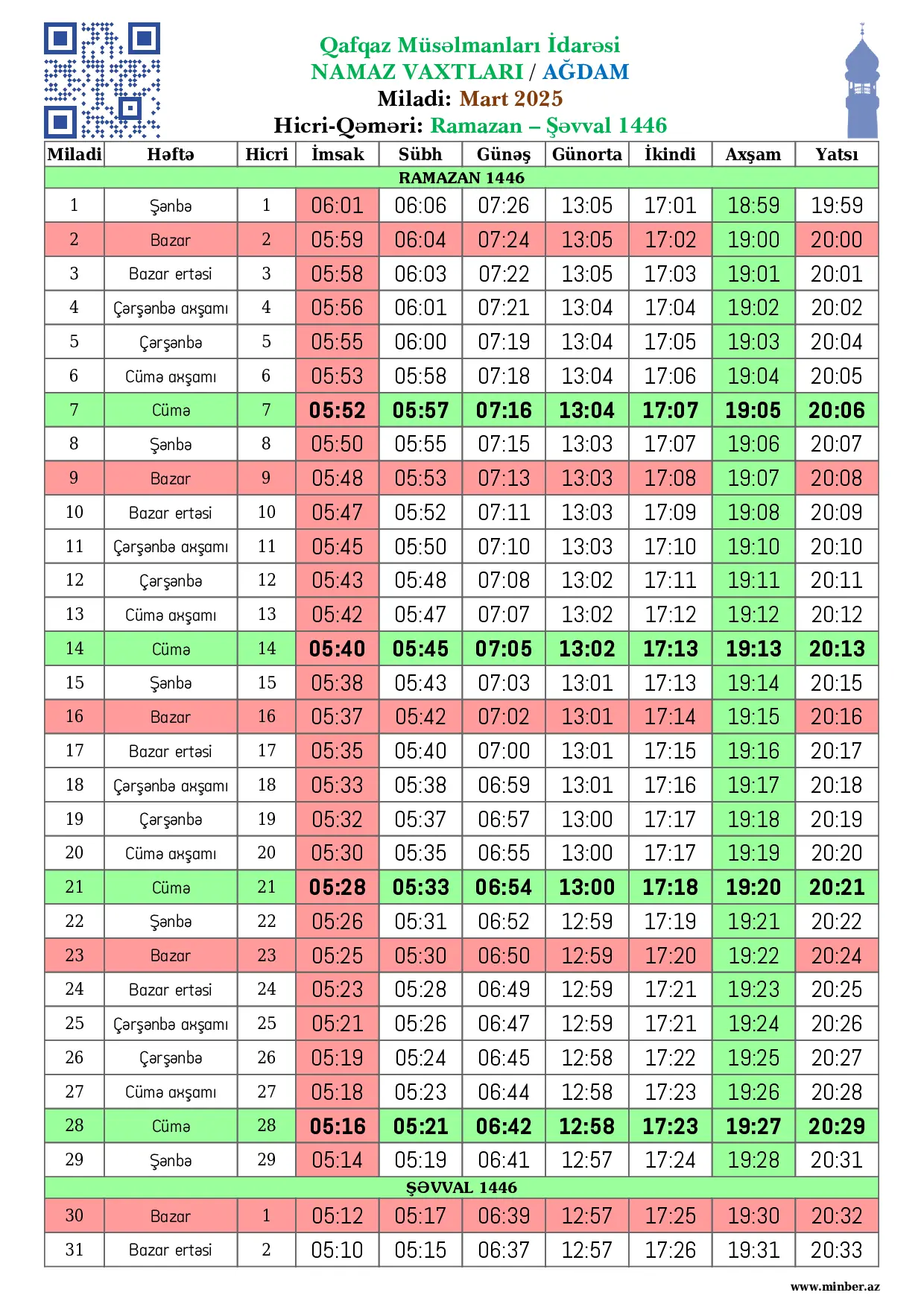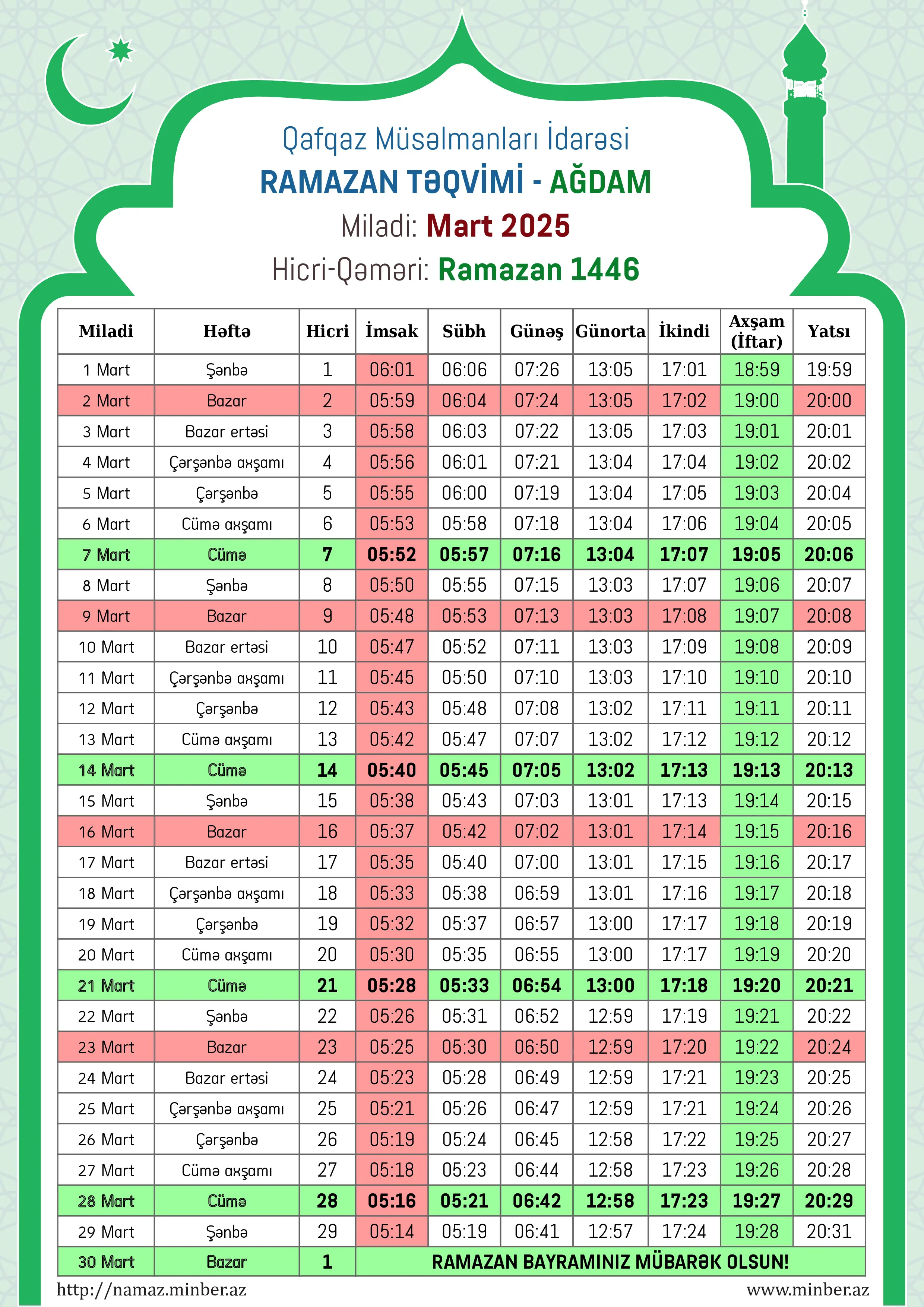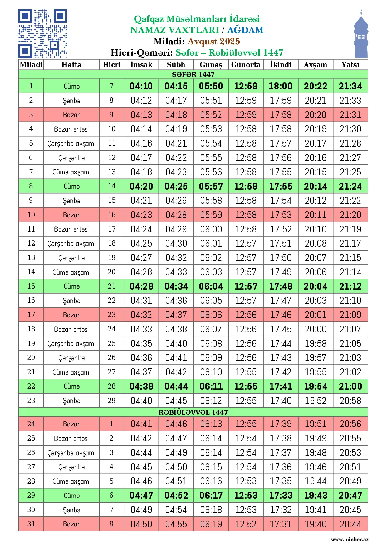 | Miladi | Həftə | Hicri | İmsak | Sübh namazı | Günəş | Günorta namazı | İkindi namazı | Axşam namazı | Yatsı namazı |