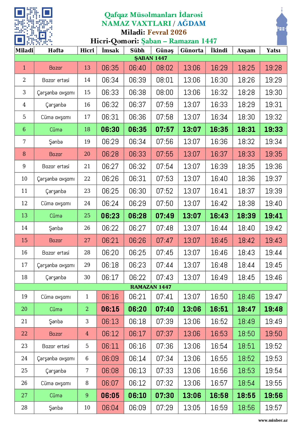 26 Fevral 2026 Cümə axşamı 8 Ramazan 1447 06:07 06:12 07:32 13:06 16:57 18:54 19:55