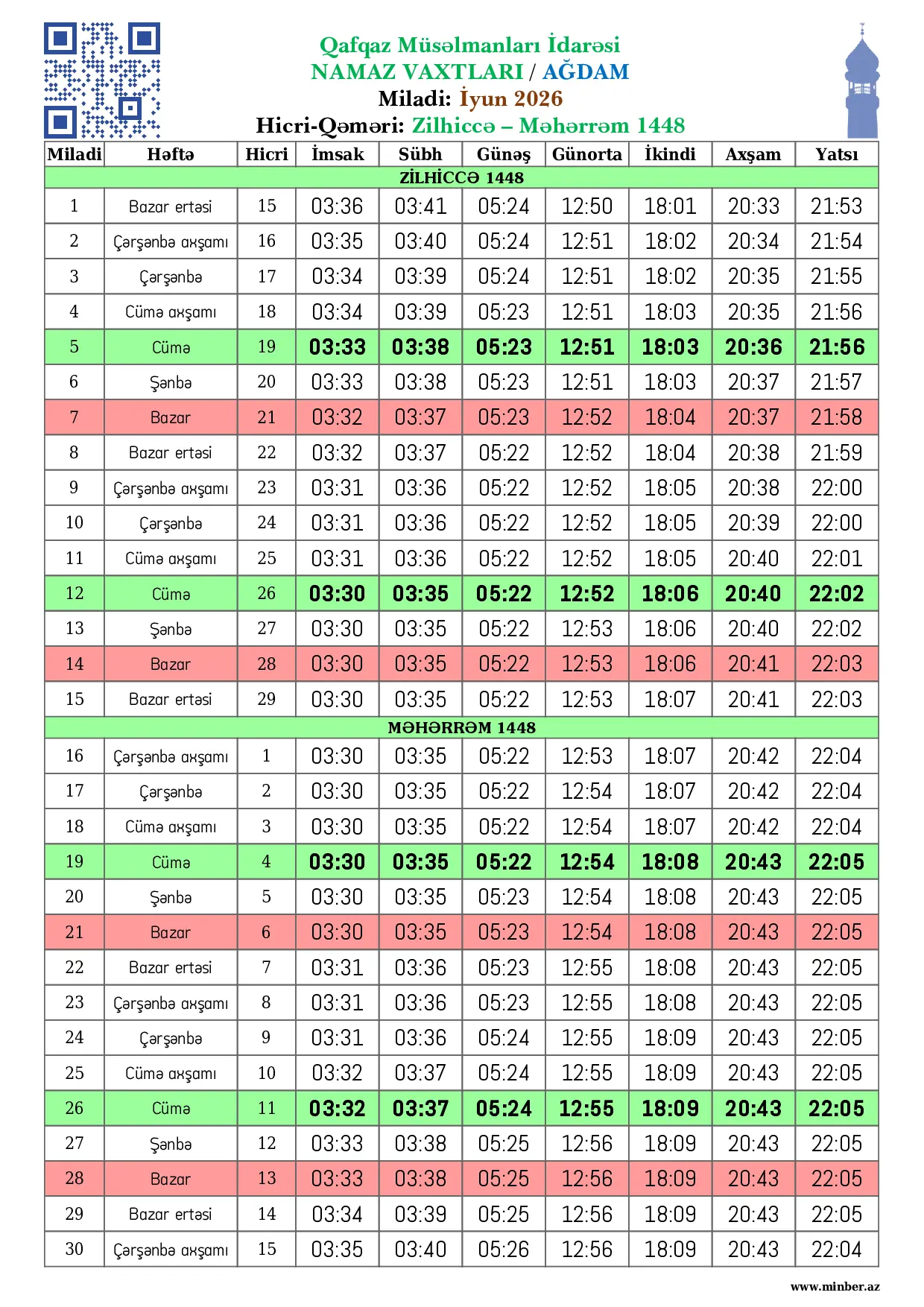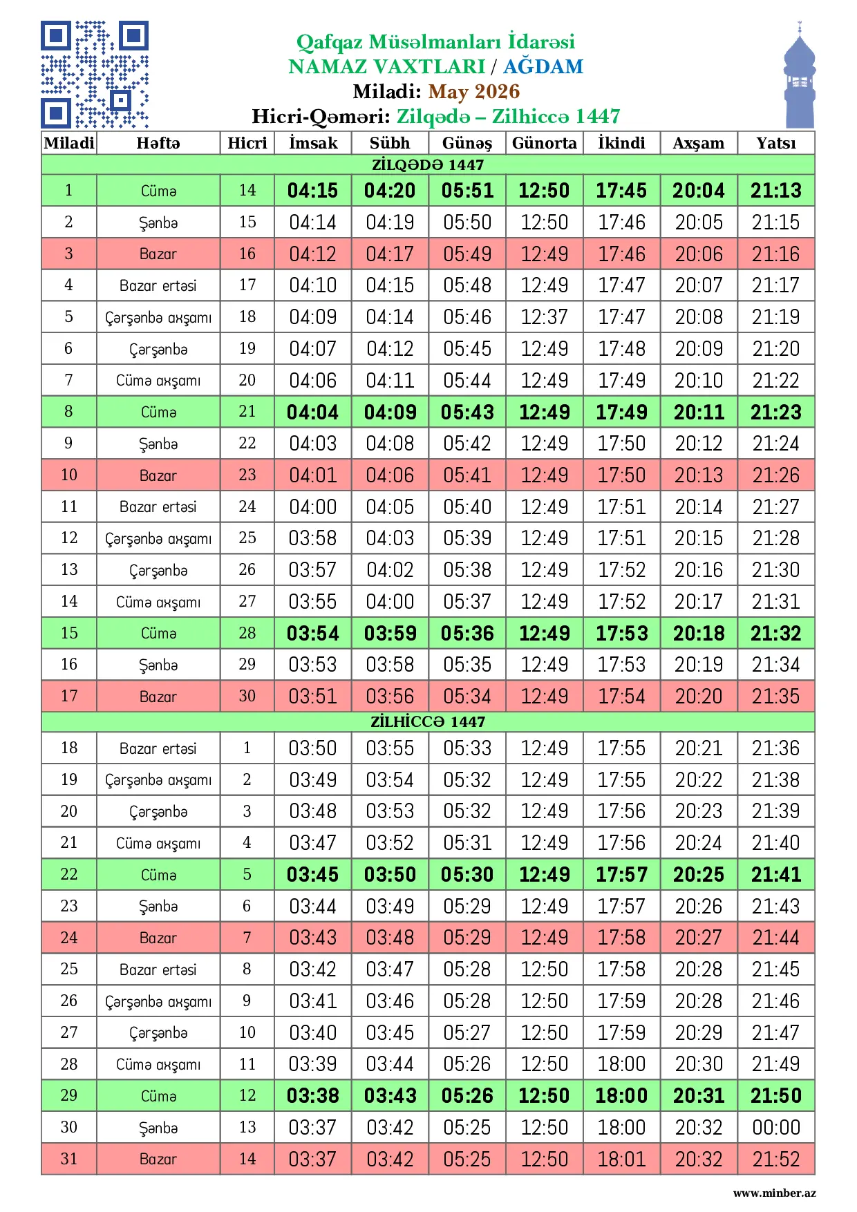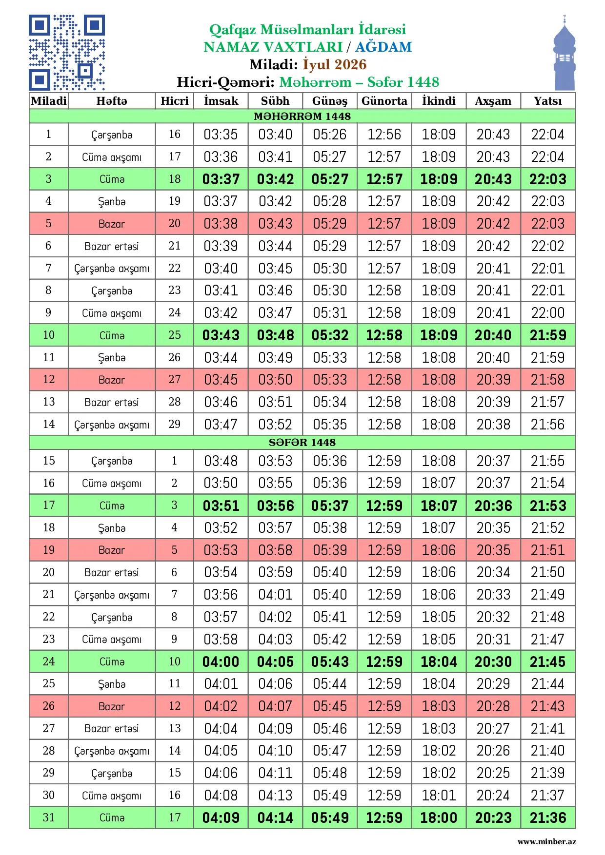 Miladi Həftə Hicri İmsak Sübh namazı Günəş Günorta namazı İkindi namazı Axşam namazı Yatsı namazı