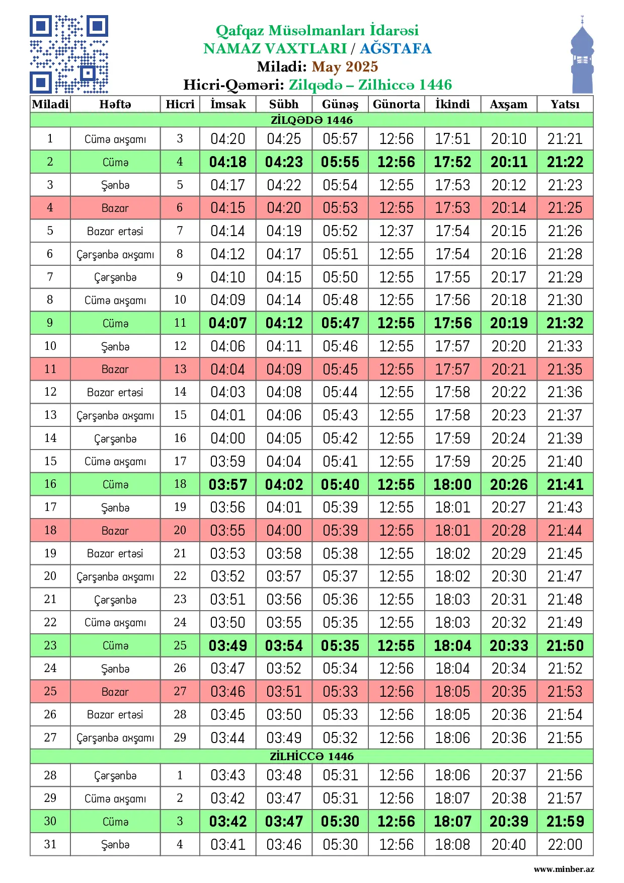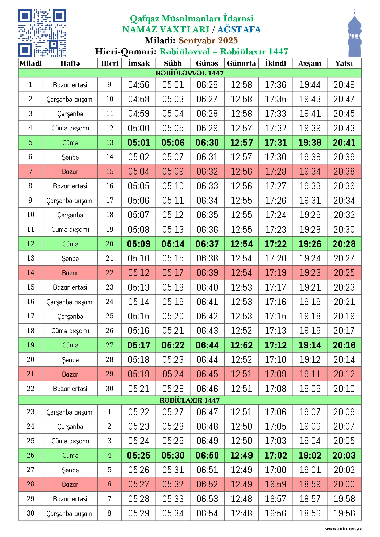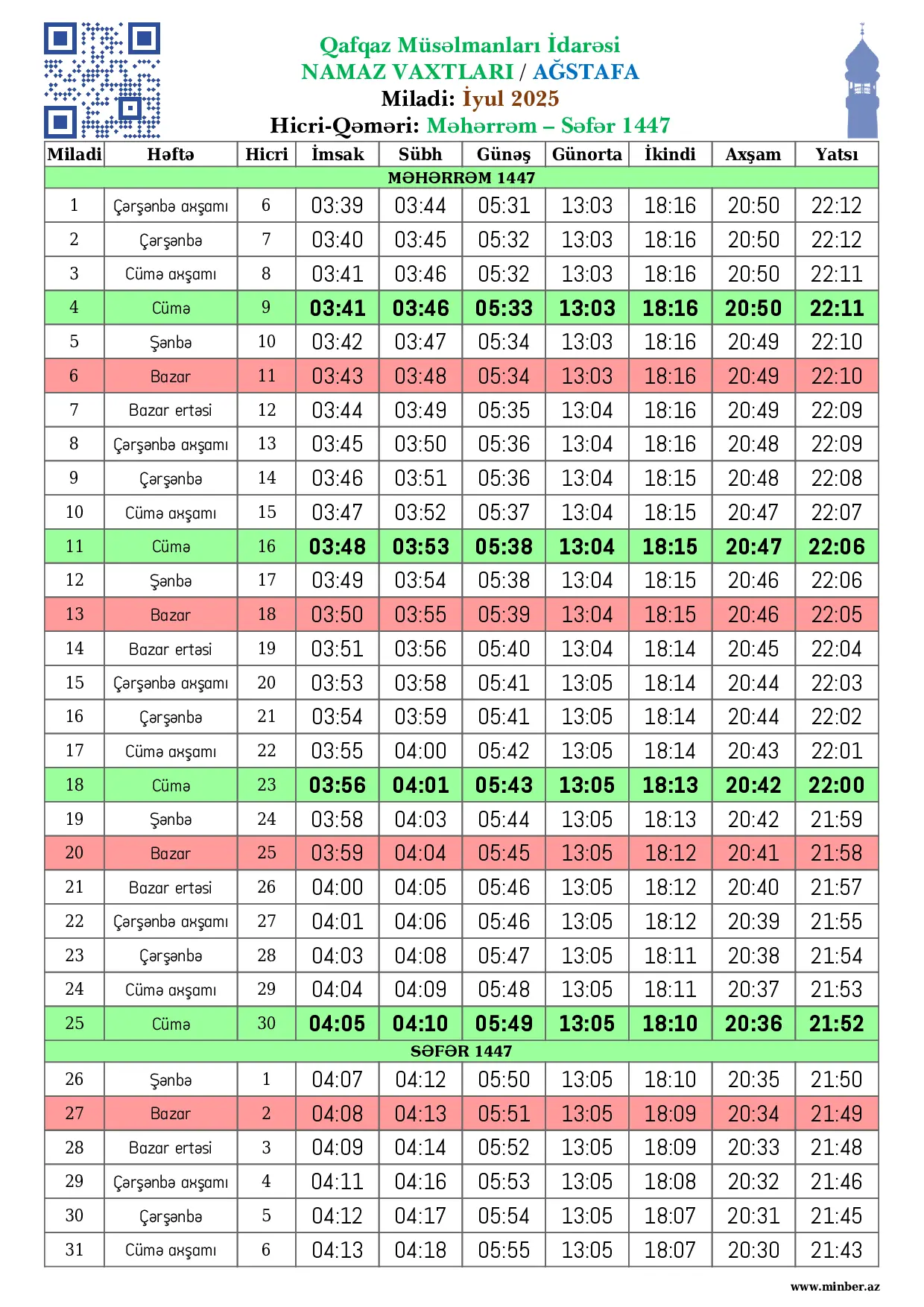 | Miladi | Həftə | Hicri | İmsak | Sübh namazı | Günəş | Günorta namazı | İkindi namazı | Axşam namazı | Yatsı namazı |