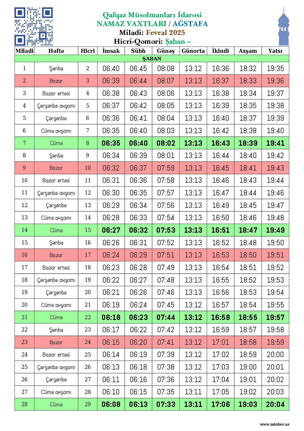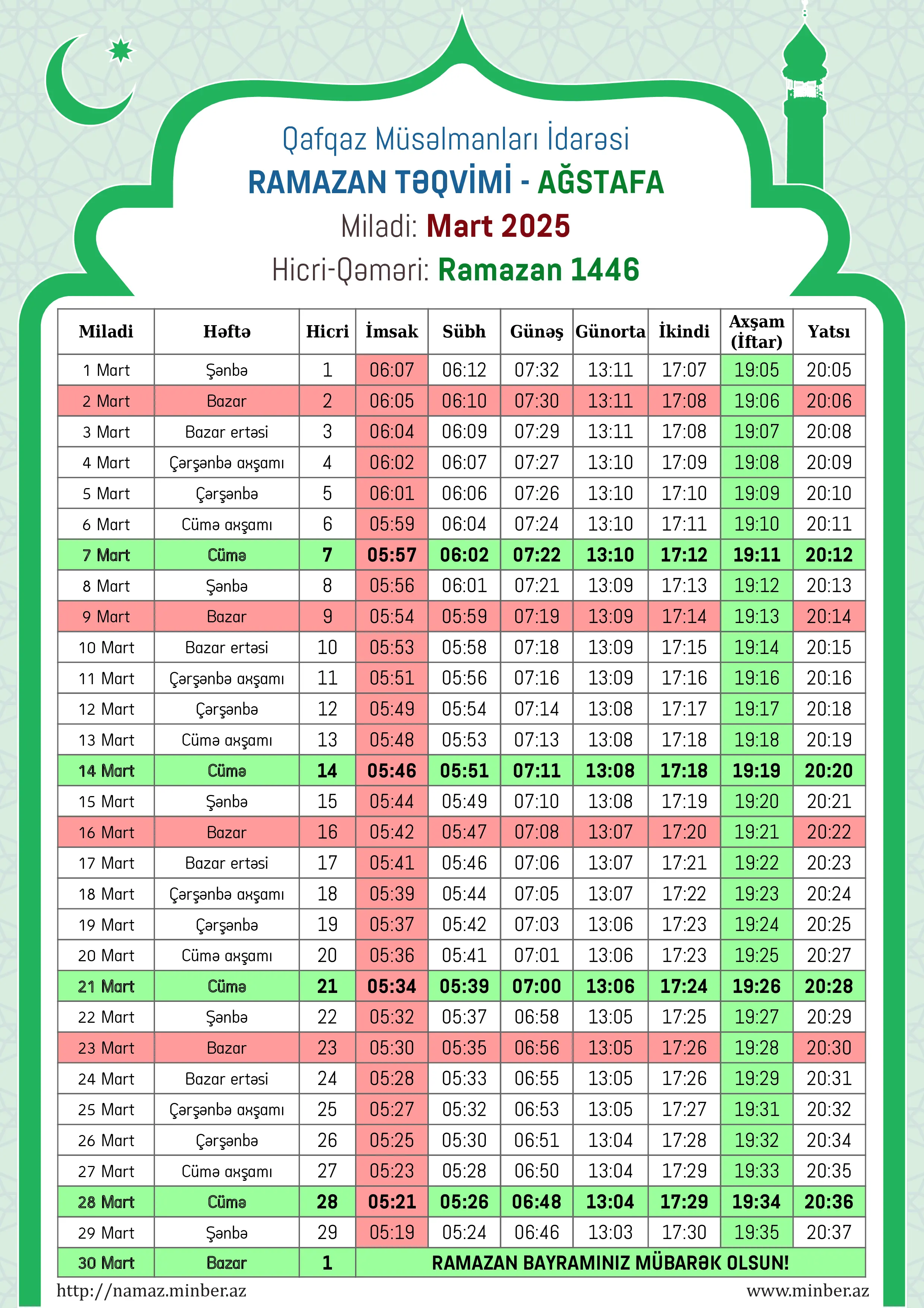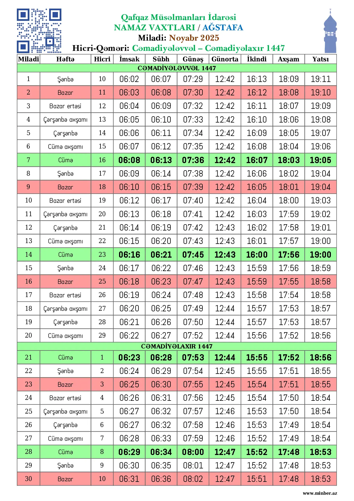 | Miladi | Həftə | Hicri | İmsak | Sübh namazı | Günəş | Günorta namazı | İkindi namazı | Axşam namazı | Yatsı namazı |
