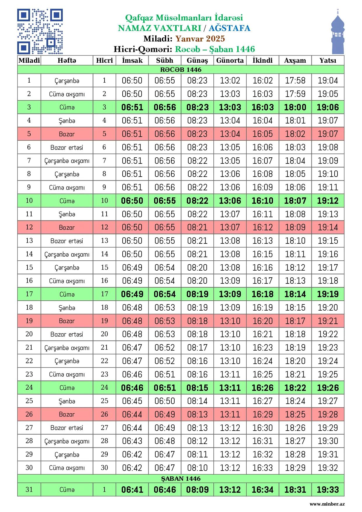 | 31 Dekabr 2025 | Çərşənbə | 11 Rəcəb 1447 | 06:50 | 06:55 | 08:22 | 13:01 | 16:00 | 17:57 | 19:03 |