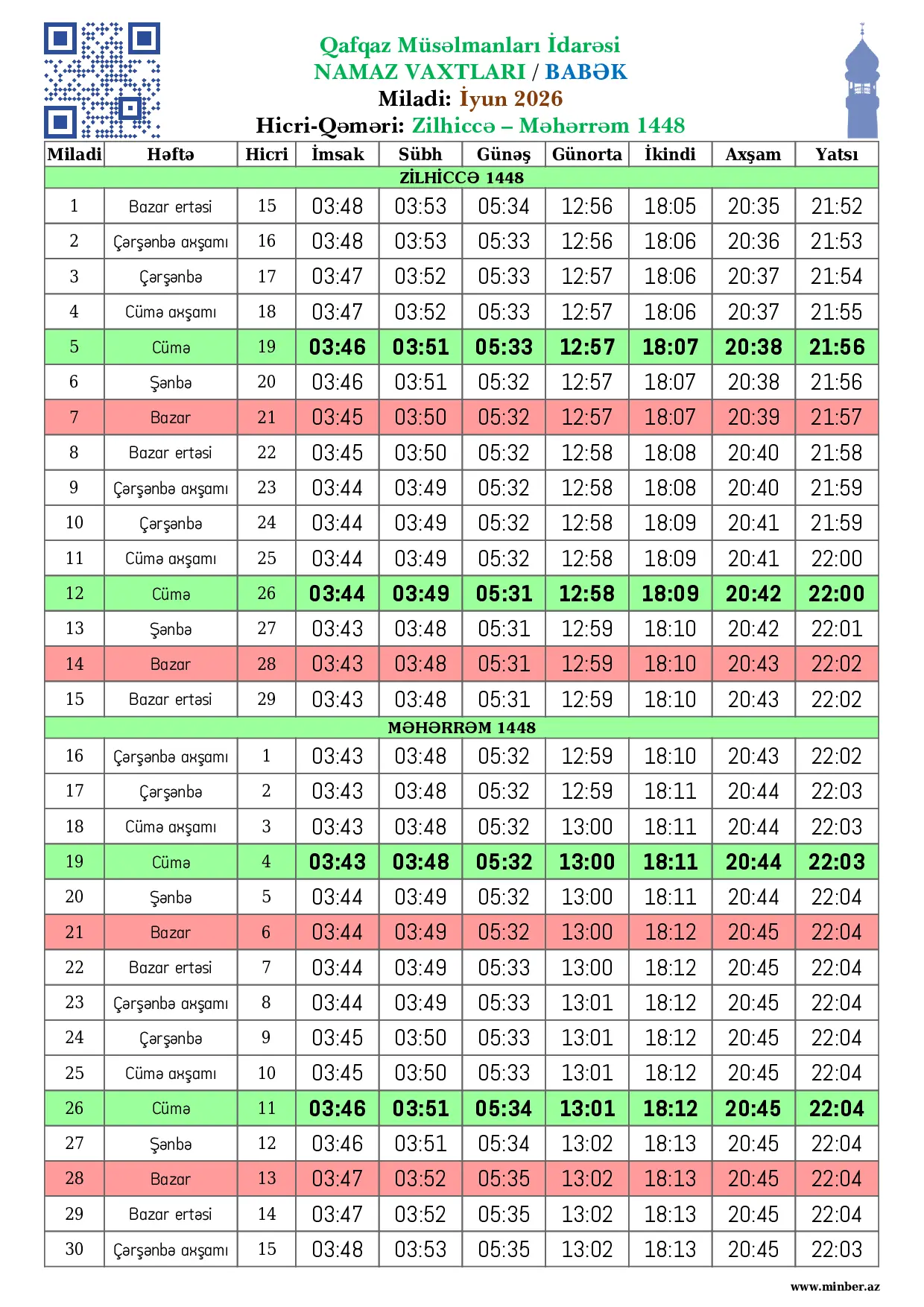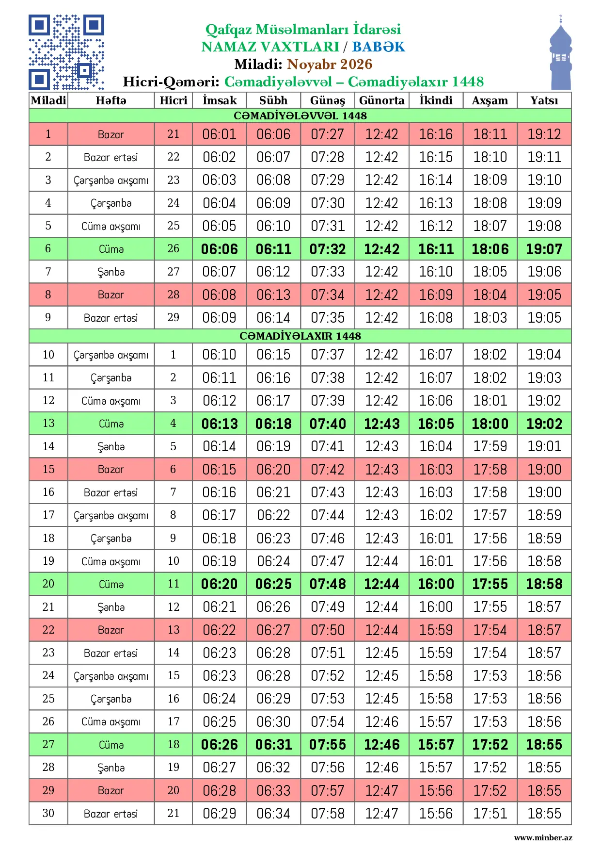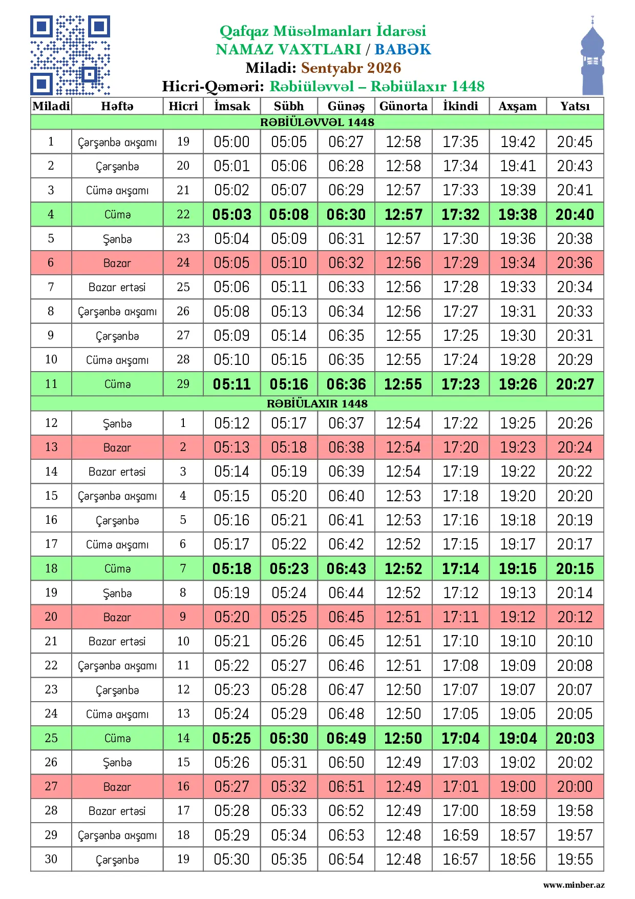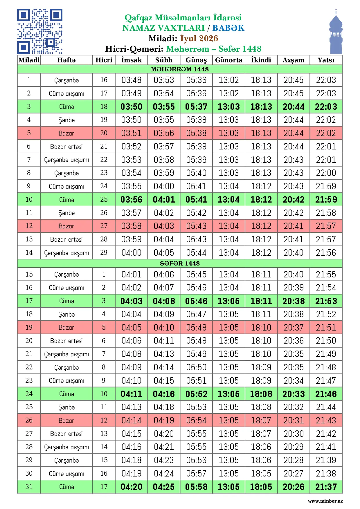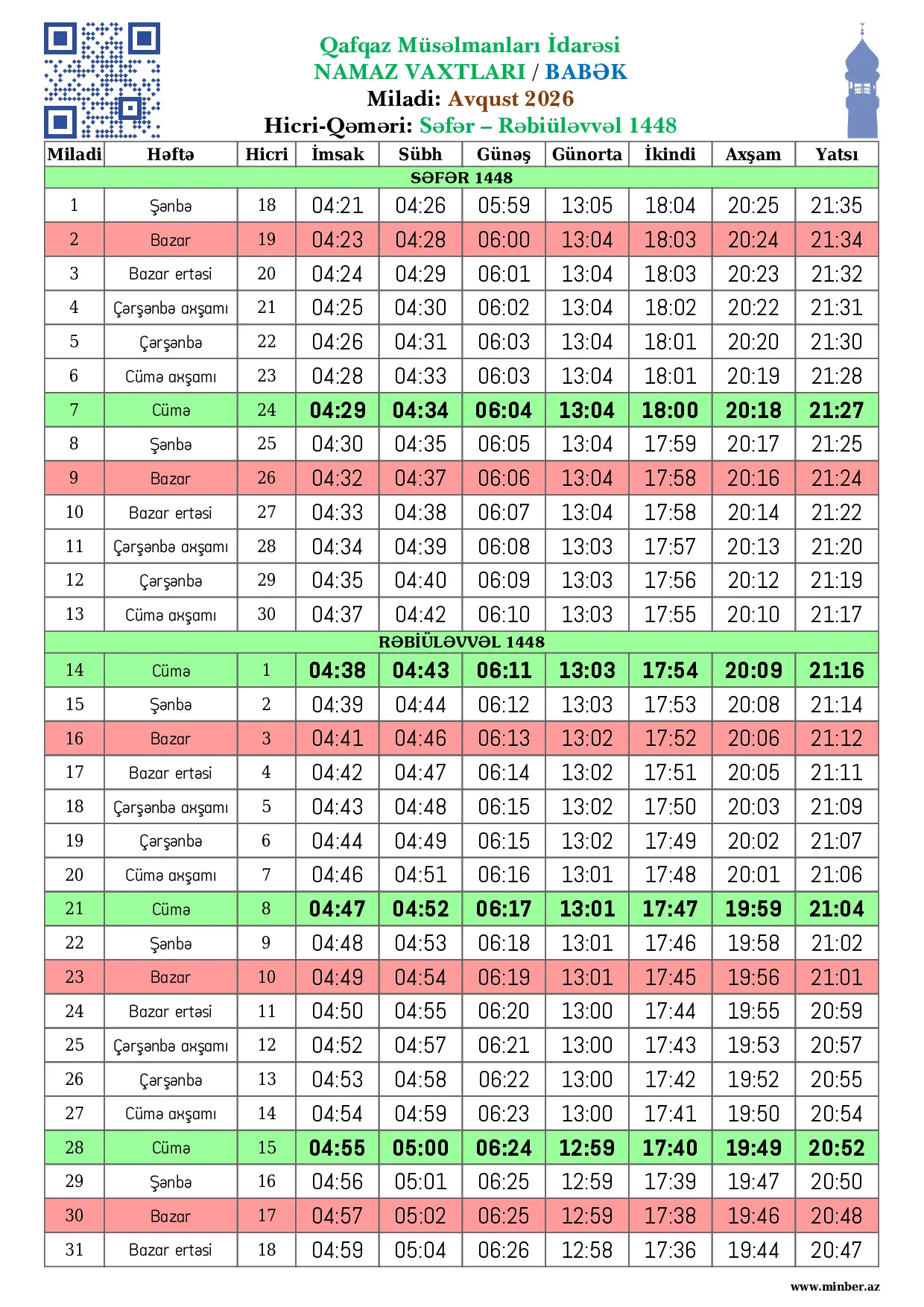 Miladi Həftə Hicri İmsak Sübh namazı Günəş Günorta namazı İkindi namazı Axşam namazı Yatsı namazı
