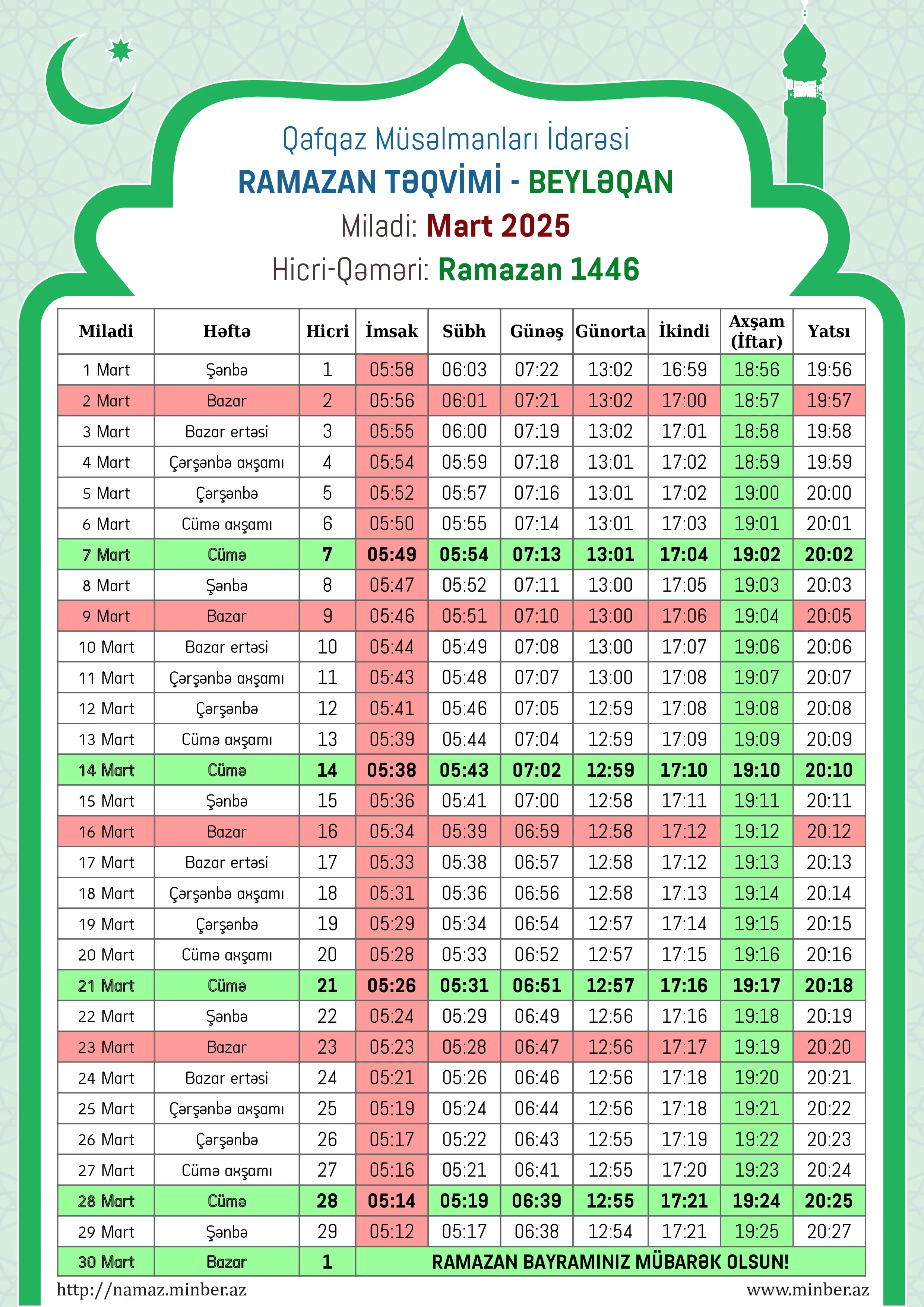 | Miladi | Həftə | Hicri | İmsak | Sübh namazı | Günəş | Günorta namazı | İkindi namazı | Axşam namazı | Yatsı namazı |