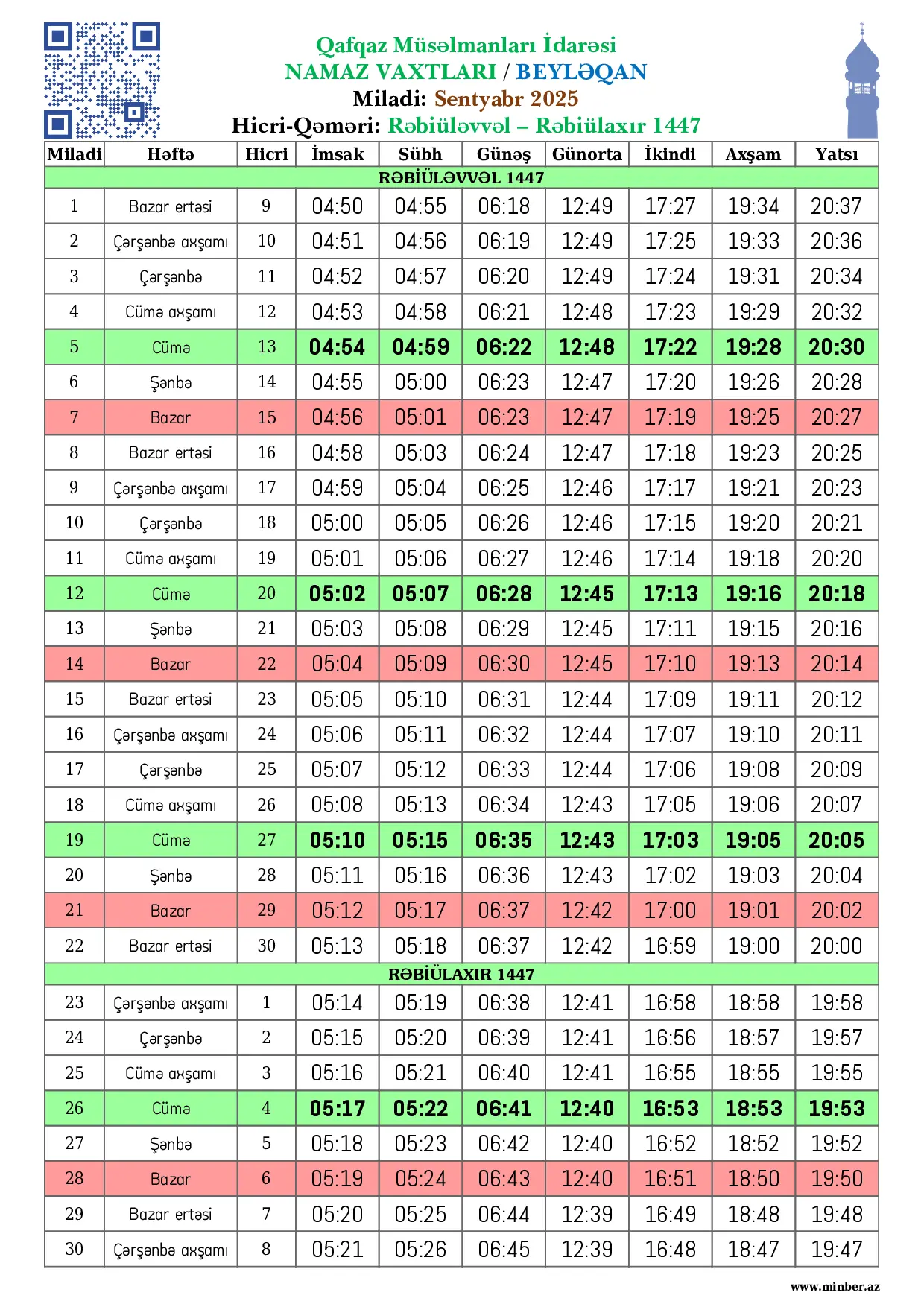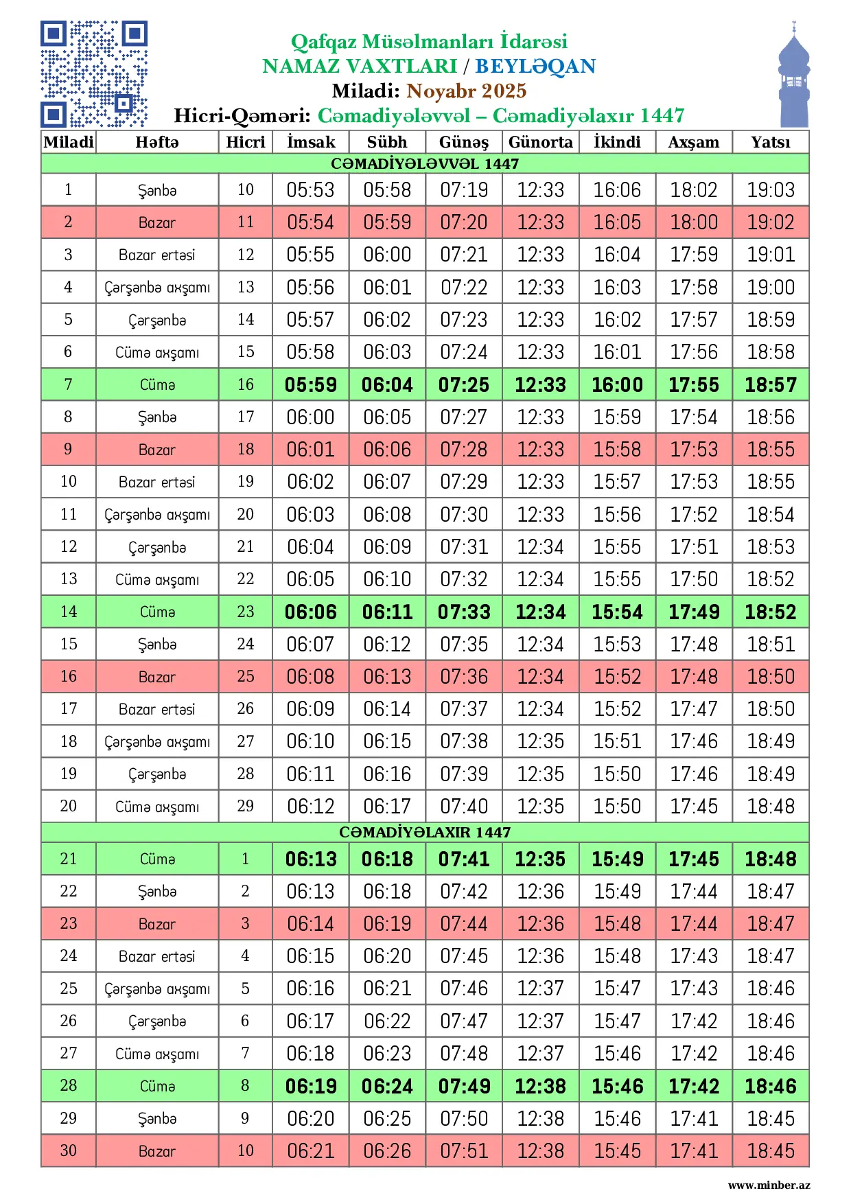 | 7 Noyabr 2025 | Cümə | 16 Cəmadiyələvvəl 1447 | 05:59 | 06:04 | 07:25 | 12:33 | 16:00 | 17:55 | 18:57 |