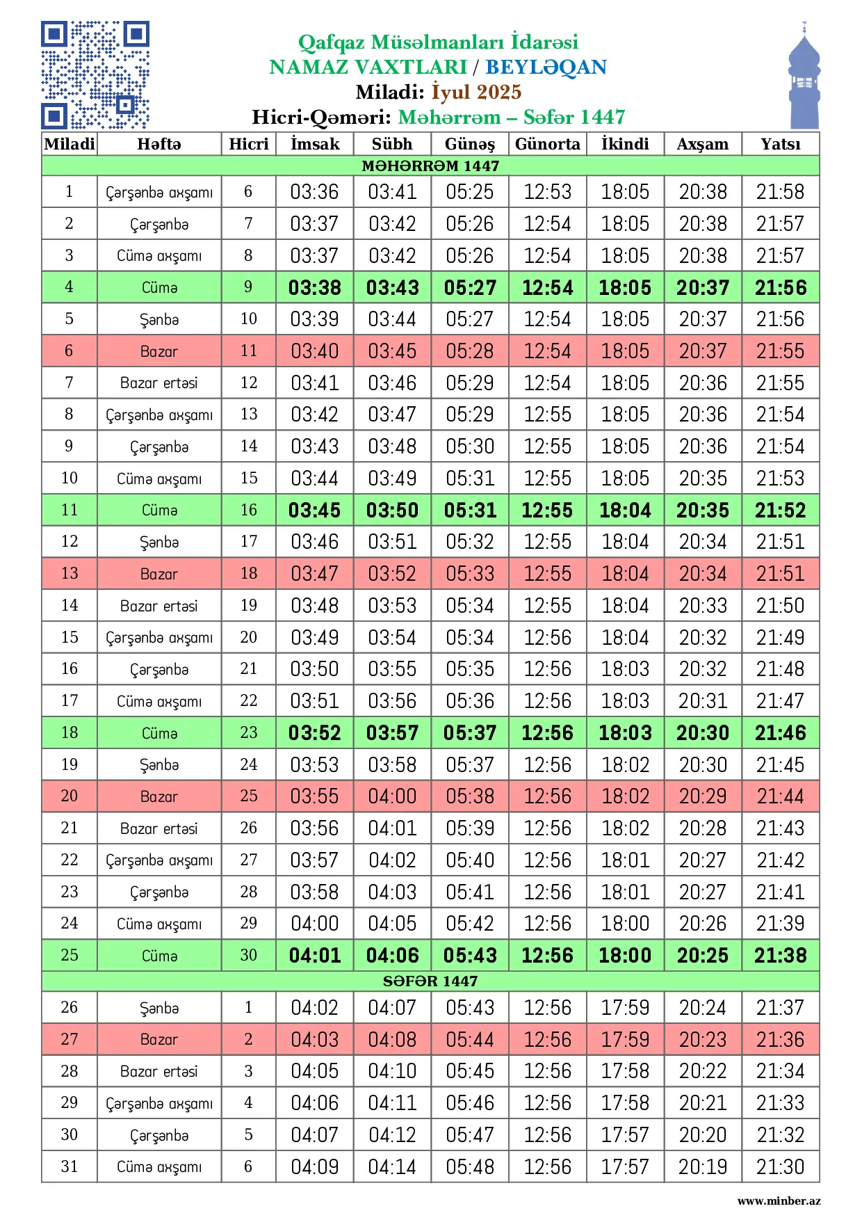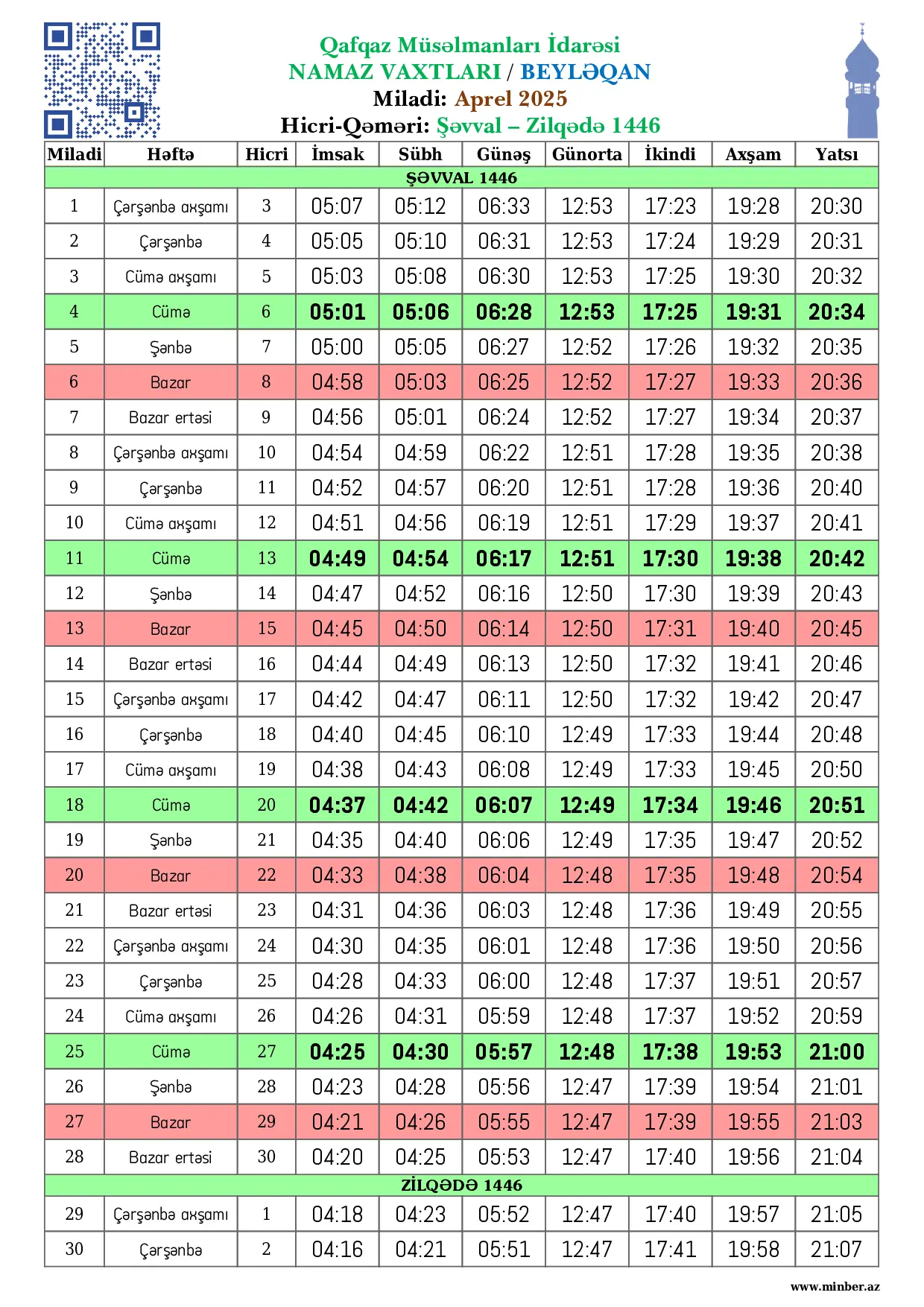 | 6 Noyabr 2025 | Cümə axşamı | 15 Cəmadiyələvvəl 1447 | 05:58 | 06:03 | 07:24 | 12:33 | 16:01 | 17:56 | 18:58 |