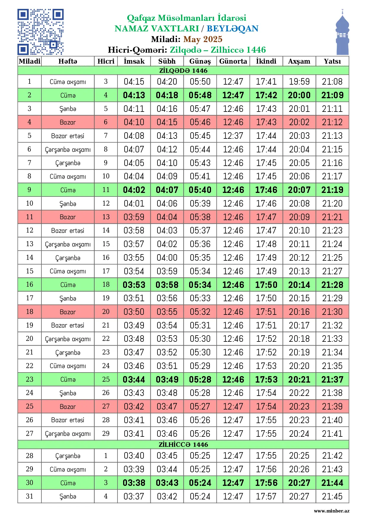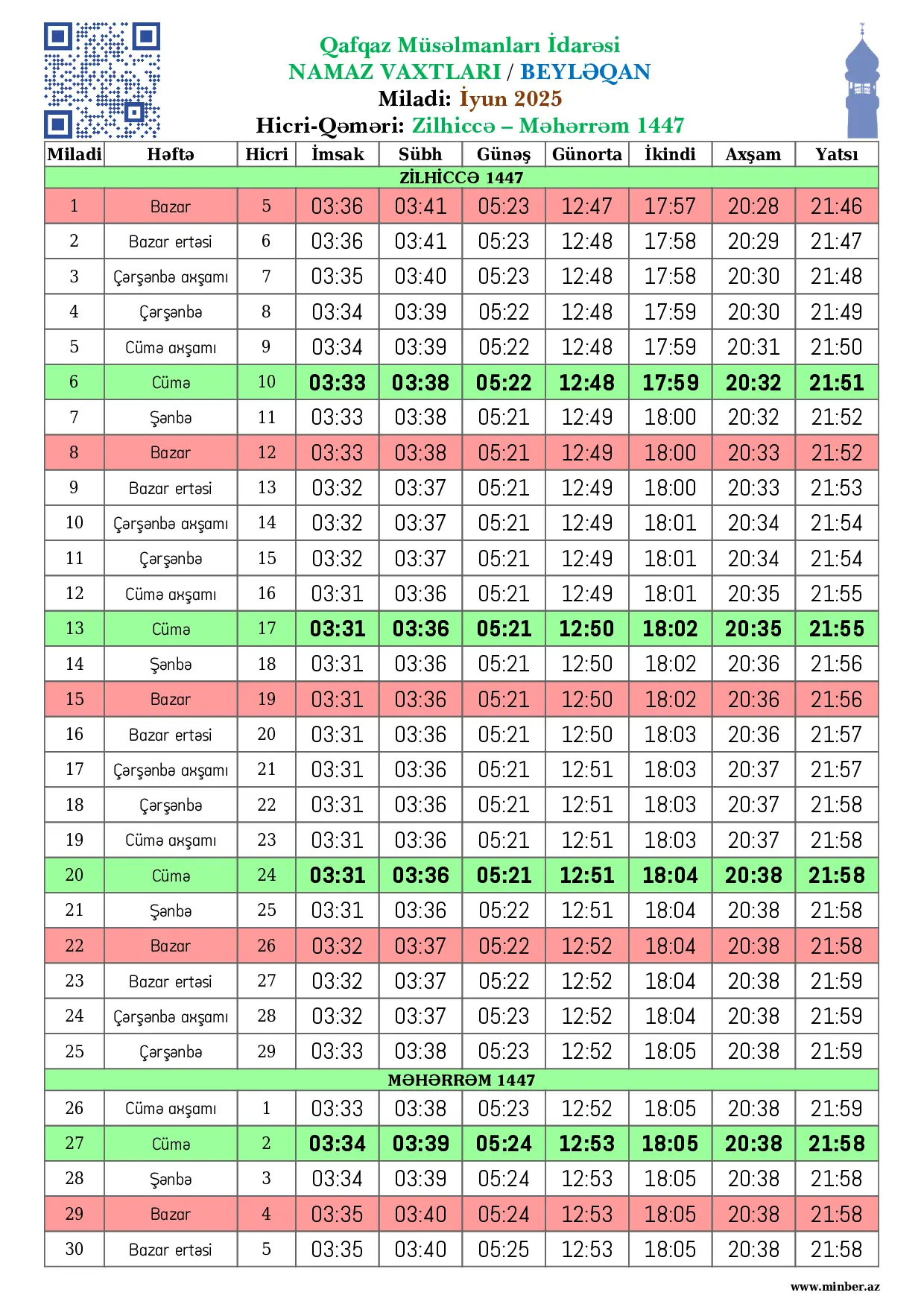 | 9 Noyabr 2025 | Bazar | 18 Cəmadiyələvvəl 1447 | 06:01 | 06:06 | 07:28 | 12:33 | 15:58 | 17:53 | 18:55 |
