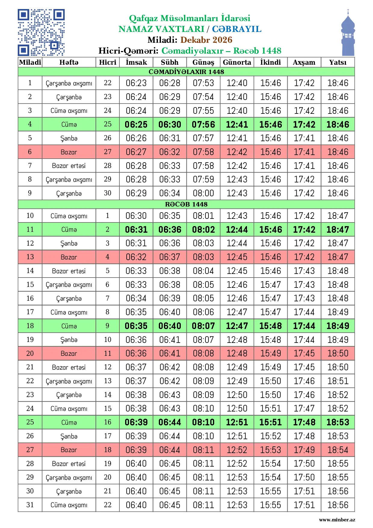 | 28 Fevral 2026 | Şənbə | 10 Ramazan 1447 | 06:02 | 06:07 | 07:26 | 13:03 | 16:58 | 18:55 | 19:55 |