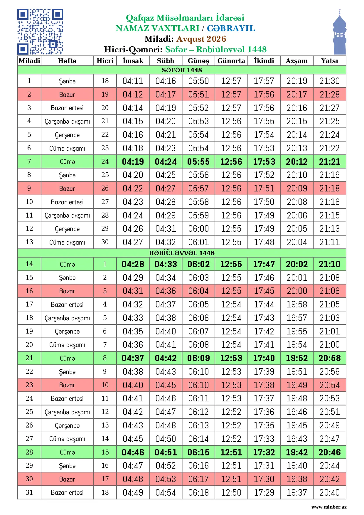| 26 Fevral 2026 | Cümə axşamı | 8 Ramazan 1447 | 06:05 | 06:10 | 07:29 | 13:04 | 16:56 | 18:53 | 19:53 |