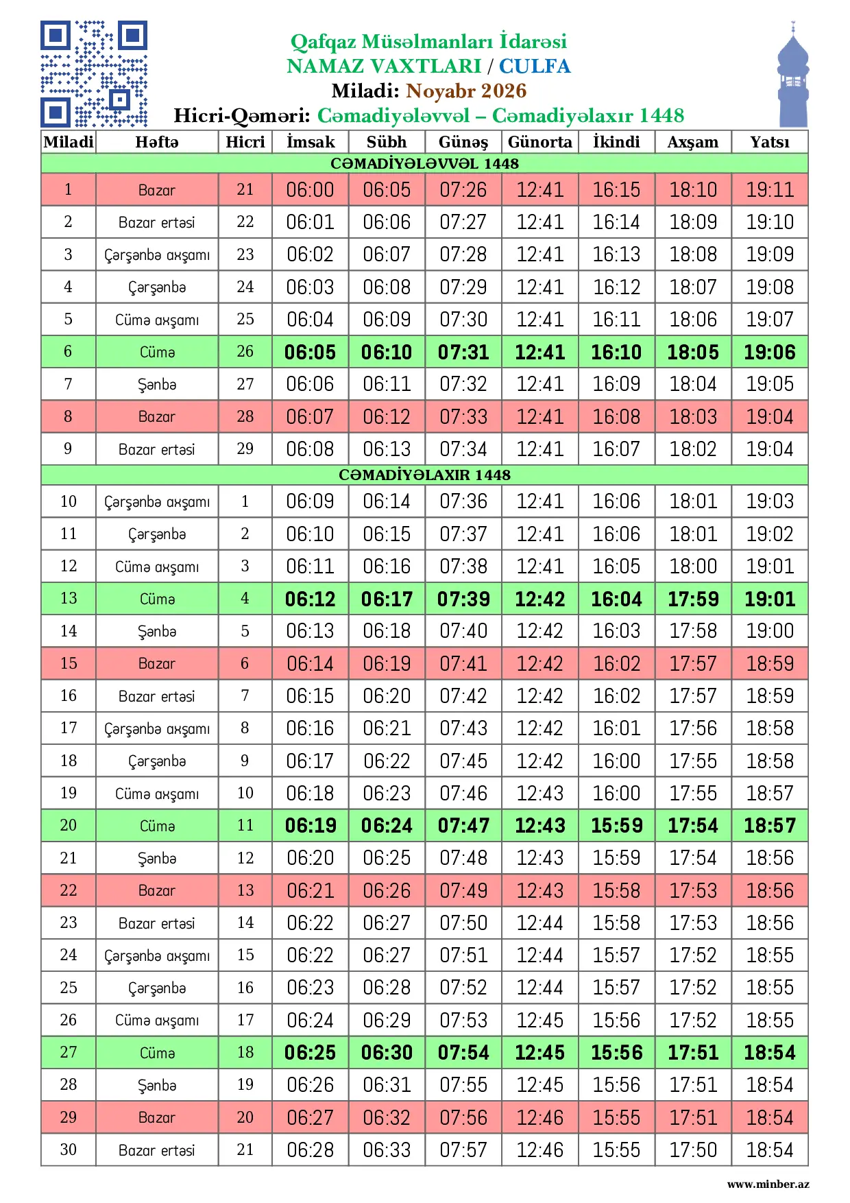 | Miladi | Həftə | Hicri | İmsak | Sübh namazı | Günəş | Günorta namazı | İkindi namazı | Axşam namazı | Yatsı namazı |