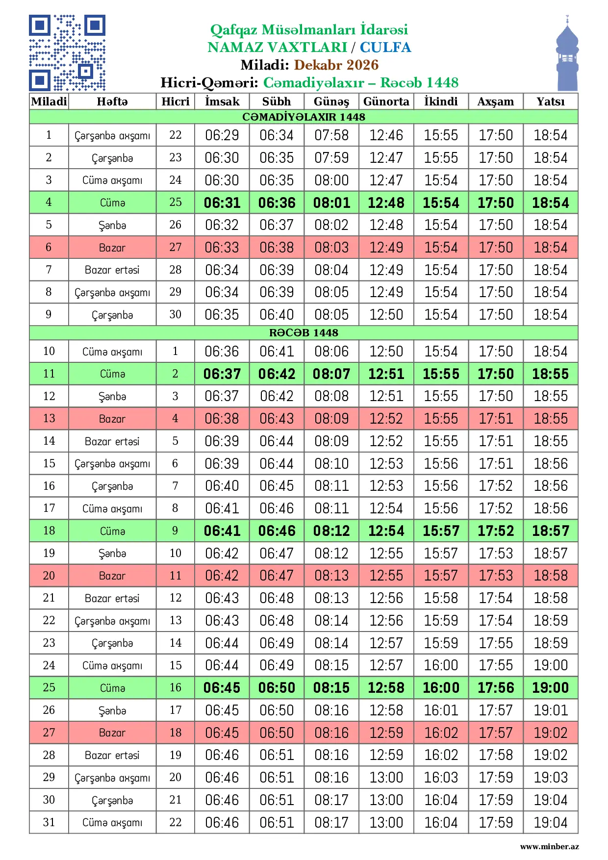 | 11 Yanvar 2026 | Bazar | 22 Rəcəb 1447 | 06:47 | 06:52 | 08:17 | 13:05 | 16:14 | 18:09 | 19:13 |
