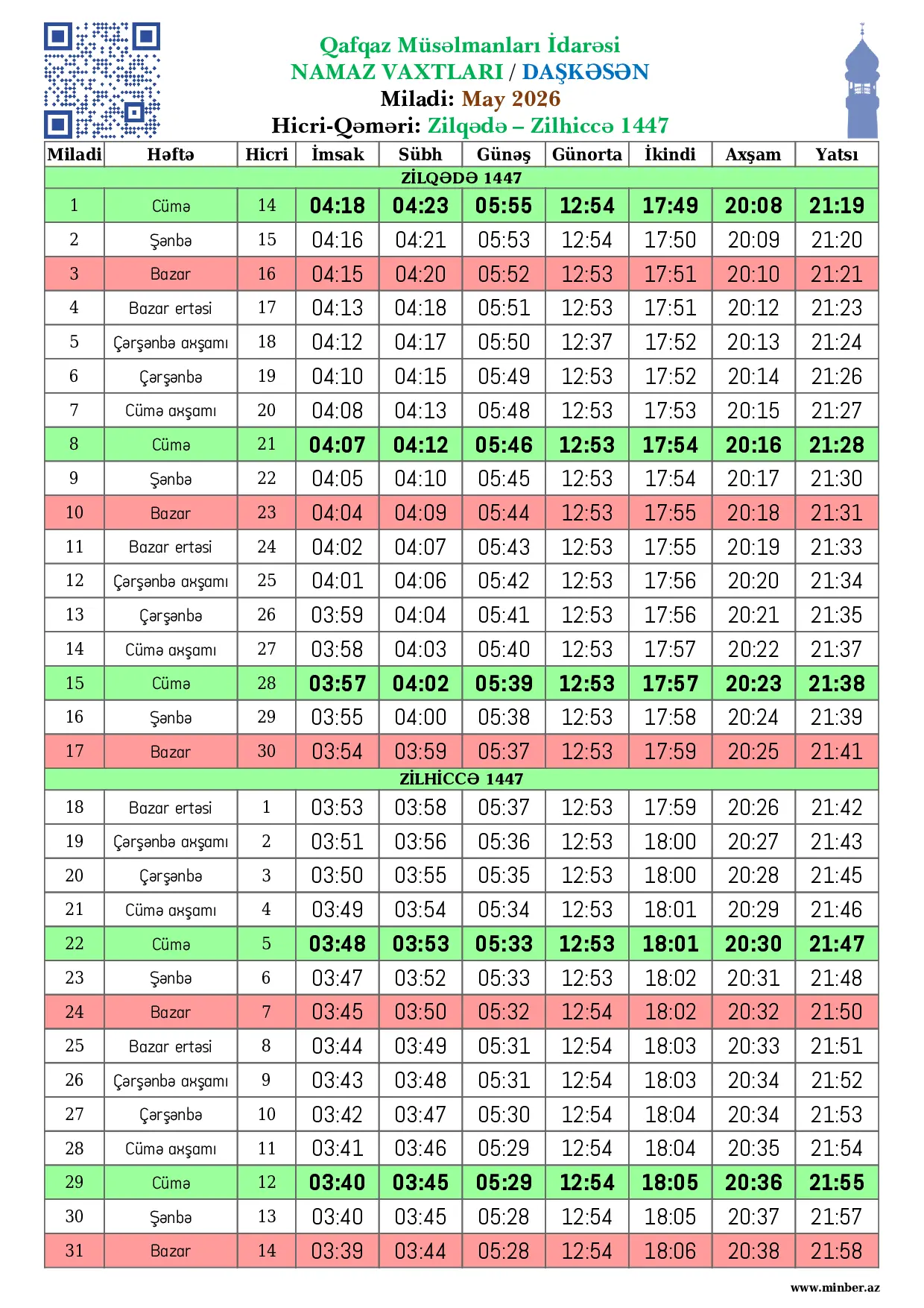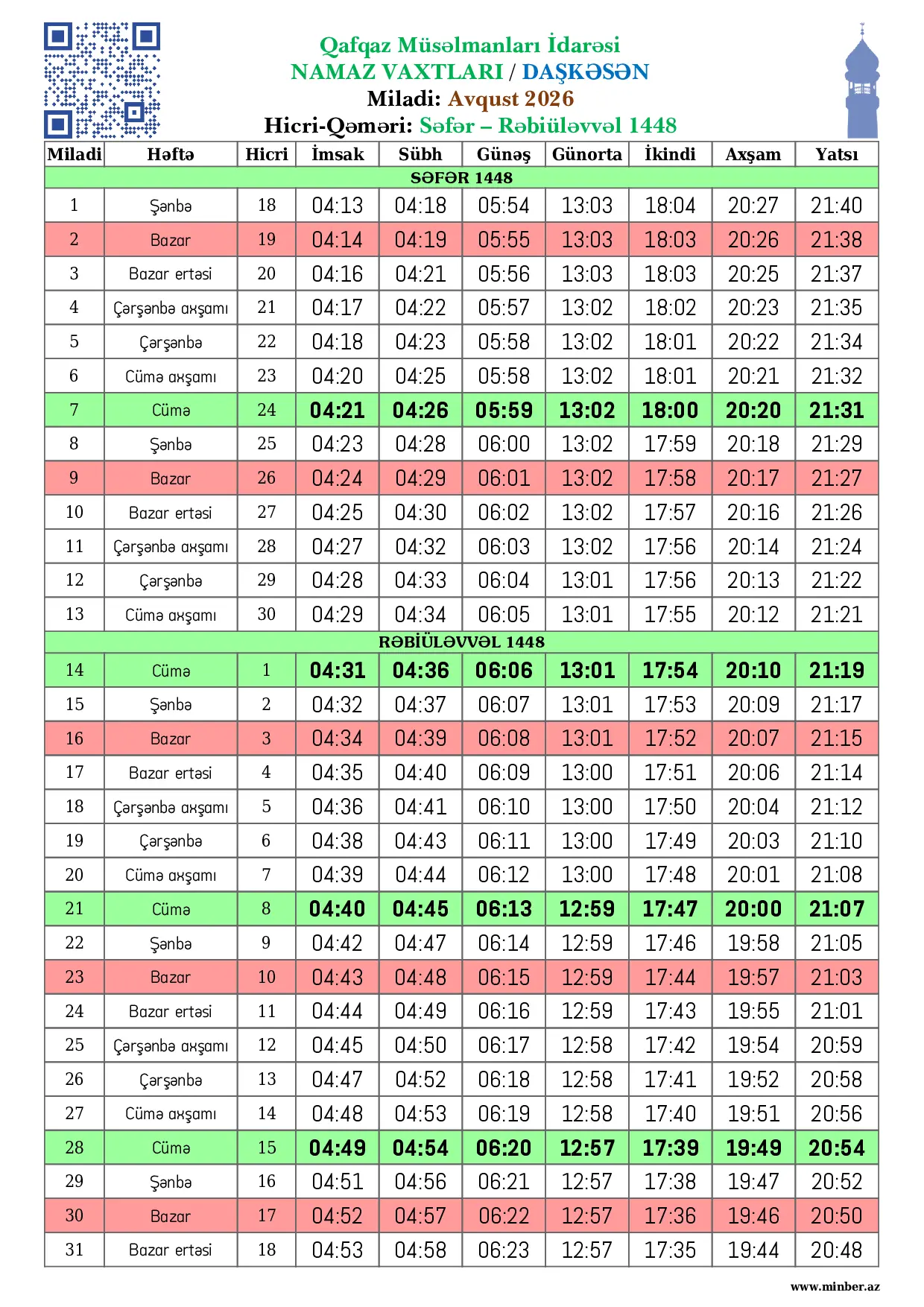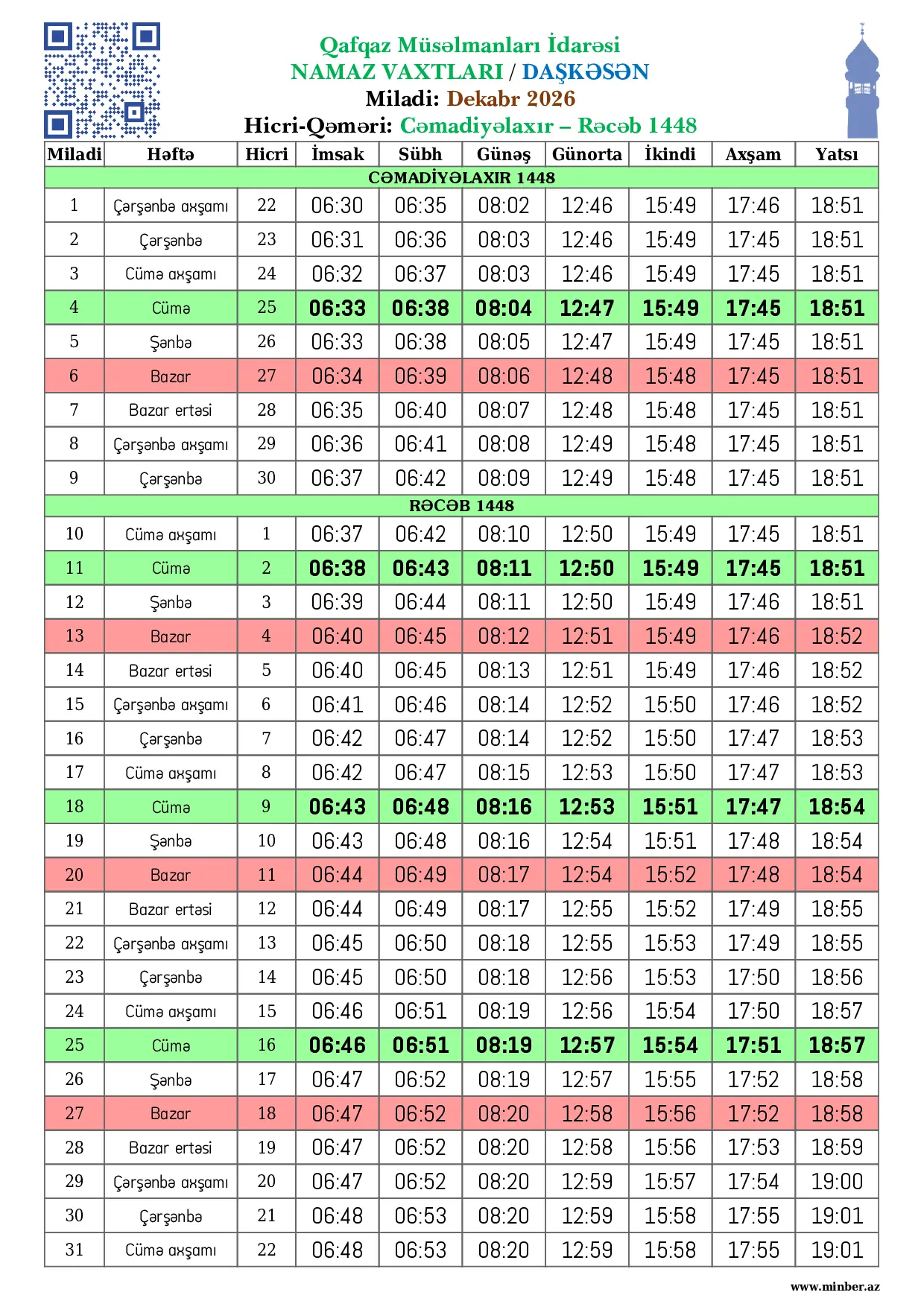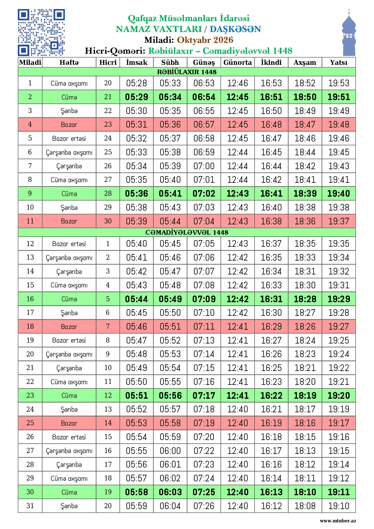 | 28 Fevral 2026 | Şənbə | 10 Ramazan 1447 | 06:08 | 06:13 | 07:33 | 13:09 | 17:03 | 19:00 | 20:01 |
