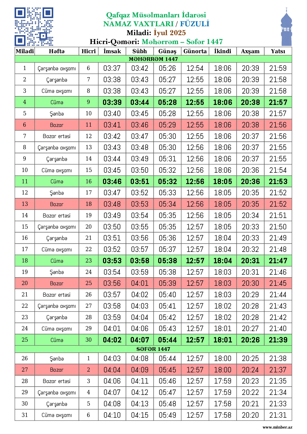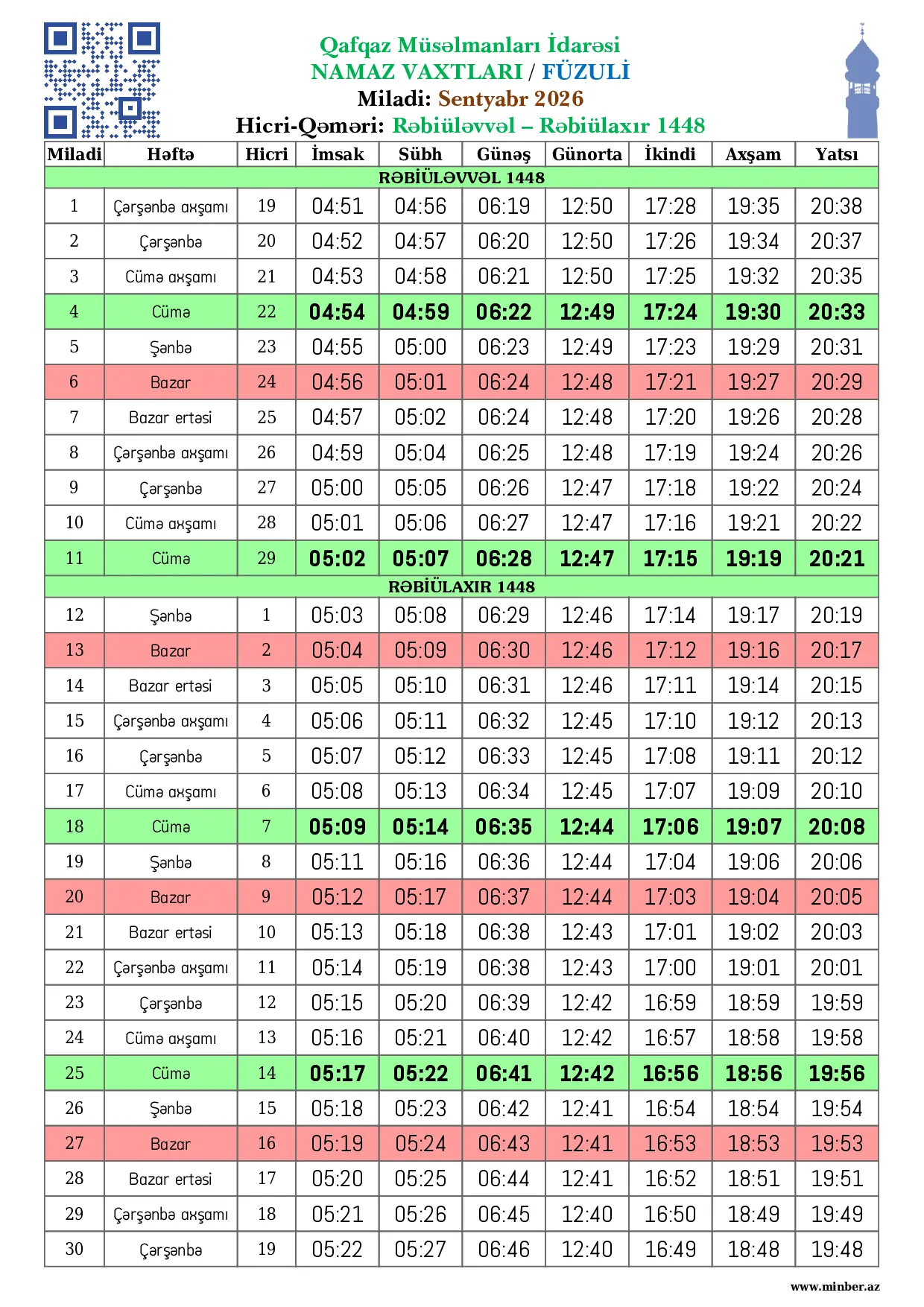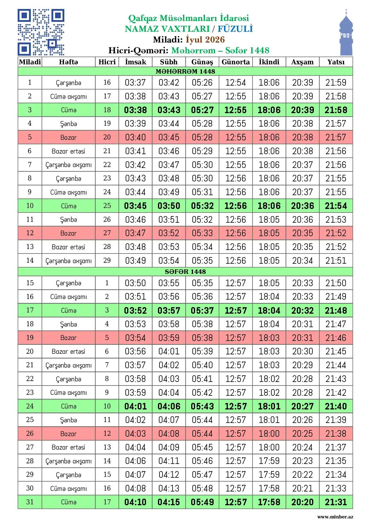 Miladi Həftə Hicri İmsak Sübh namazı Günəş Günorta namazı İkindi namazı Axşam namazı Yatsı namazı