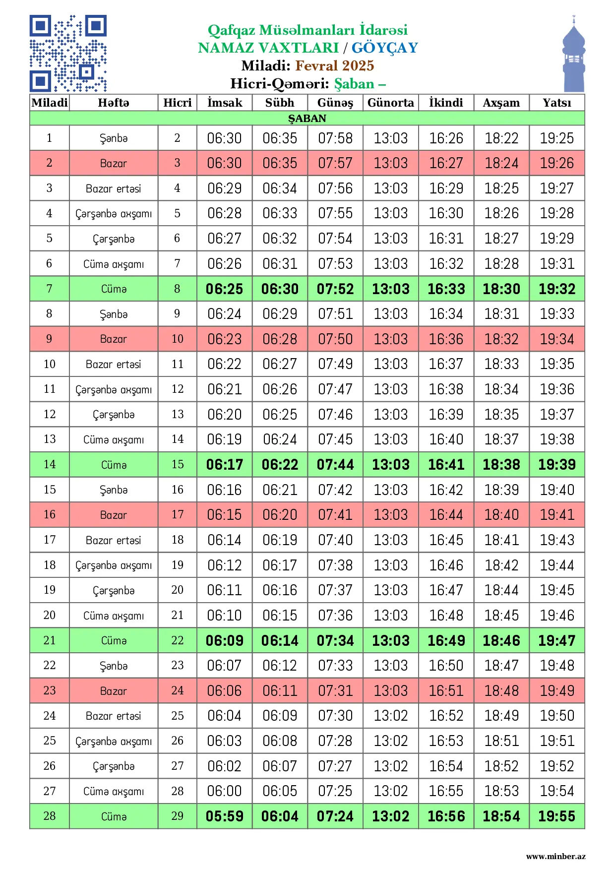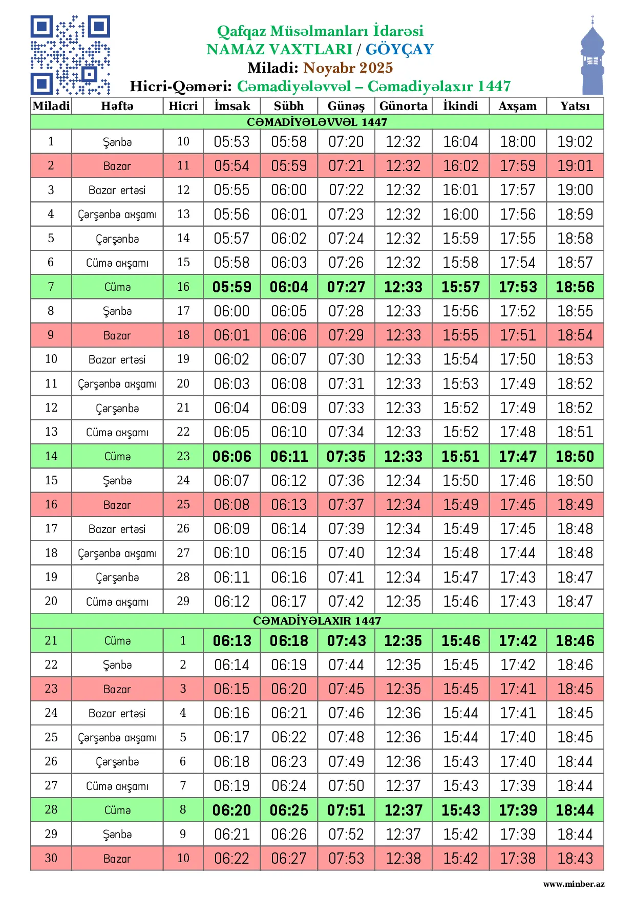 Miladi | Həftə | Hicri | İmsak | Sübh namazı | Günəş | Günorta namazı | İkindi namazı | Axşam namazı | Yatsı namazı |