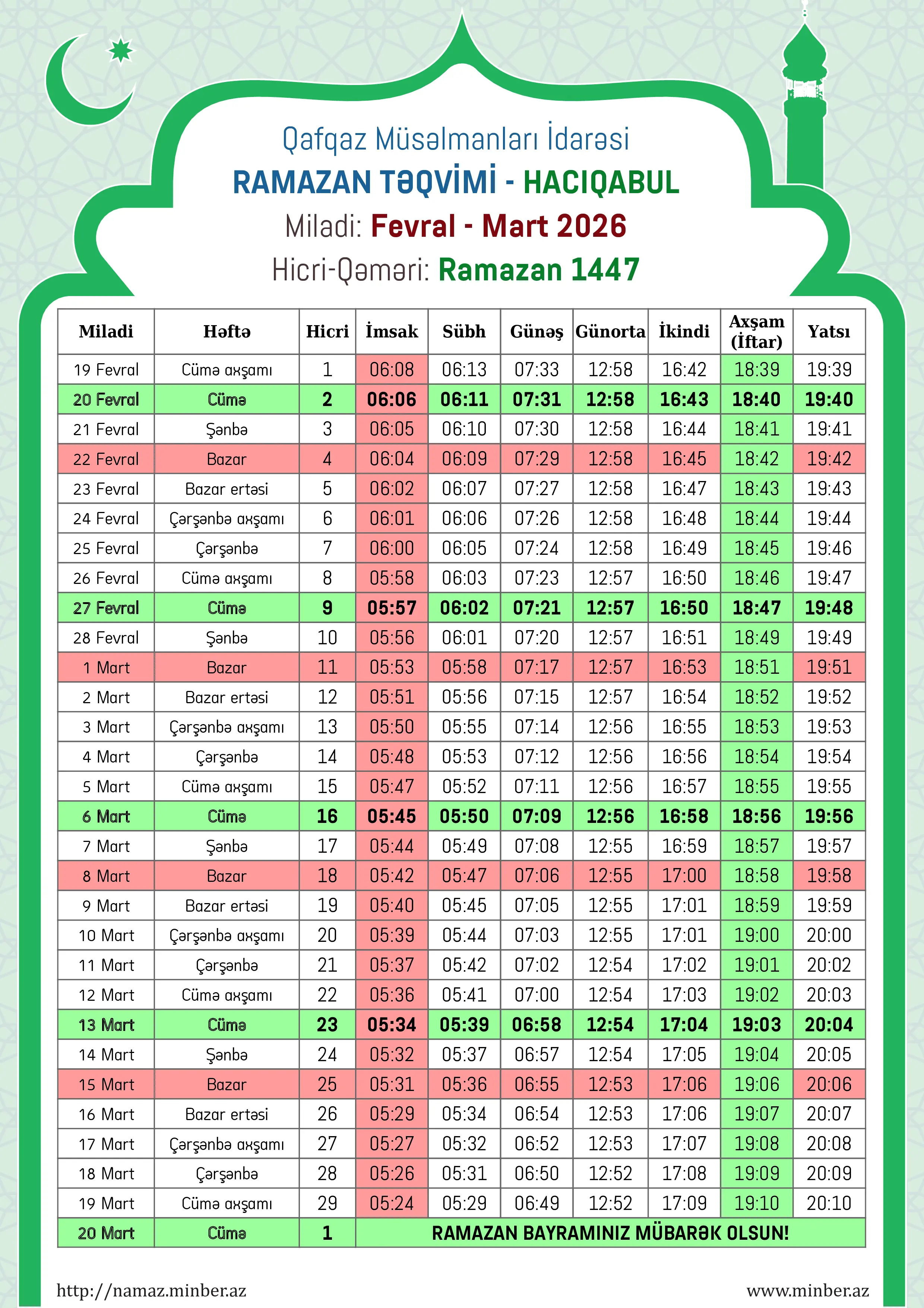 | 8 Fevral 2026 | Bazar | 20 Şaban 1447 | 06:20 | 06:25 | 07:46 | 12:59 | 16:30 | 18:26 | 19:27 |