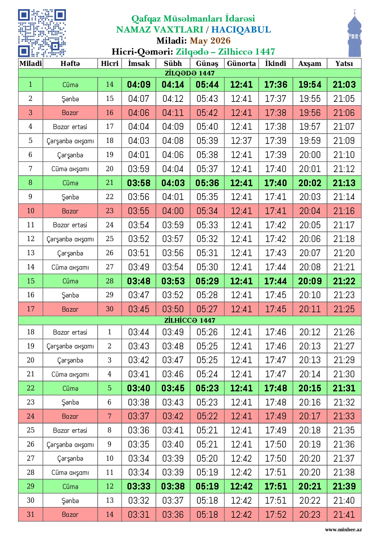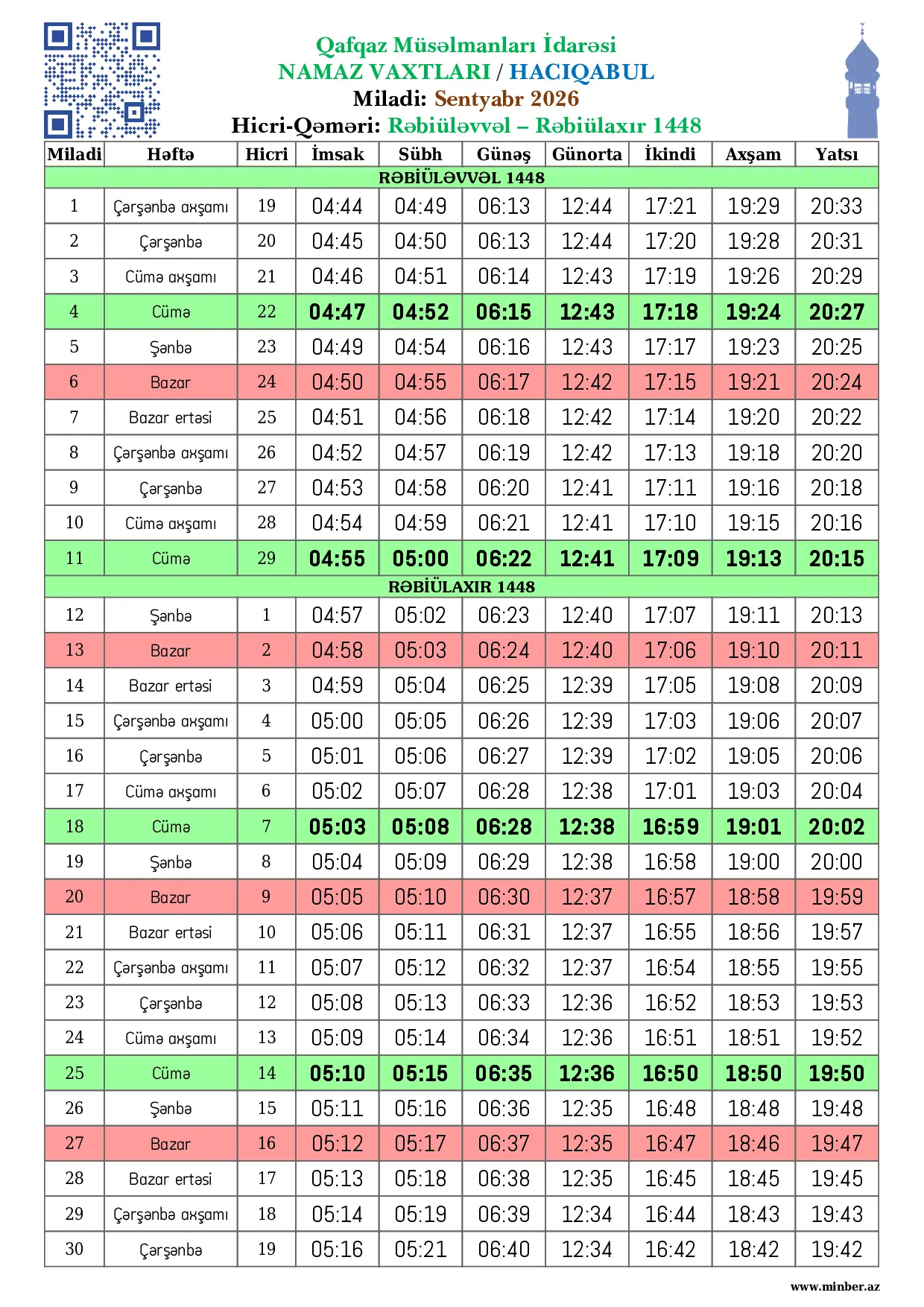 | 5 Fevral 2026 | Cümə axşamı | 17 Şaban 1447 | 06:23 | 06:28 | 07:49 | 12:58 | 16:27 | 18:22 | 19:24 |