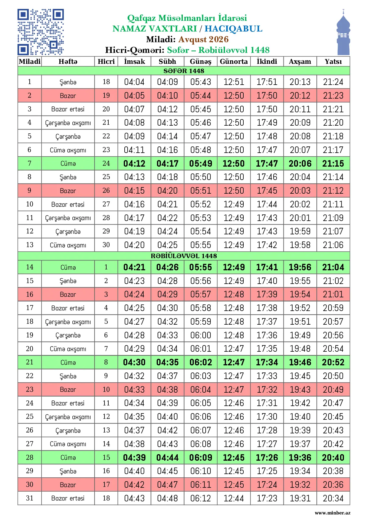 | 7 Fevral 2026 | Şənbə | 19 Şaban 1447 | 06:21 | 06:26 | 07:47 | 12:59 | 16:29 | 18:25 | 19:26 |