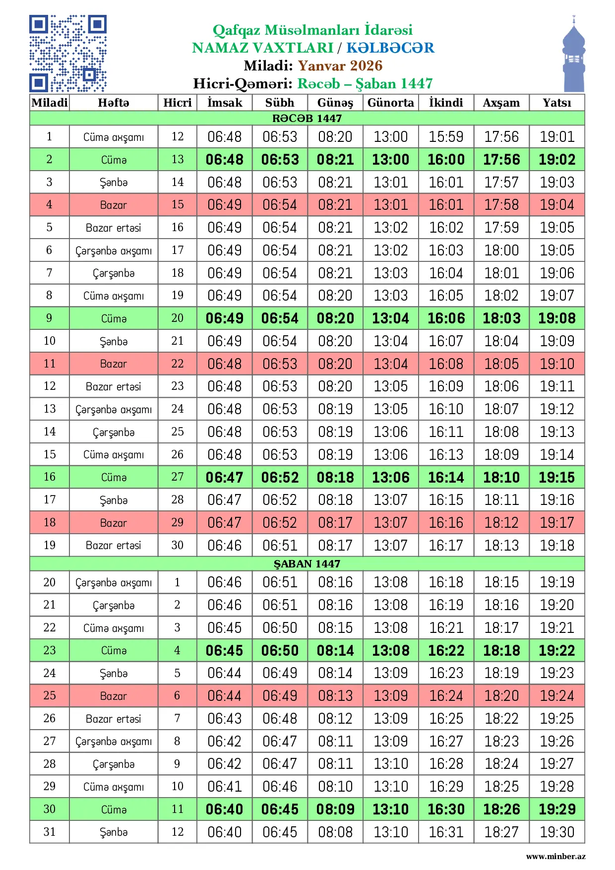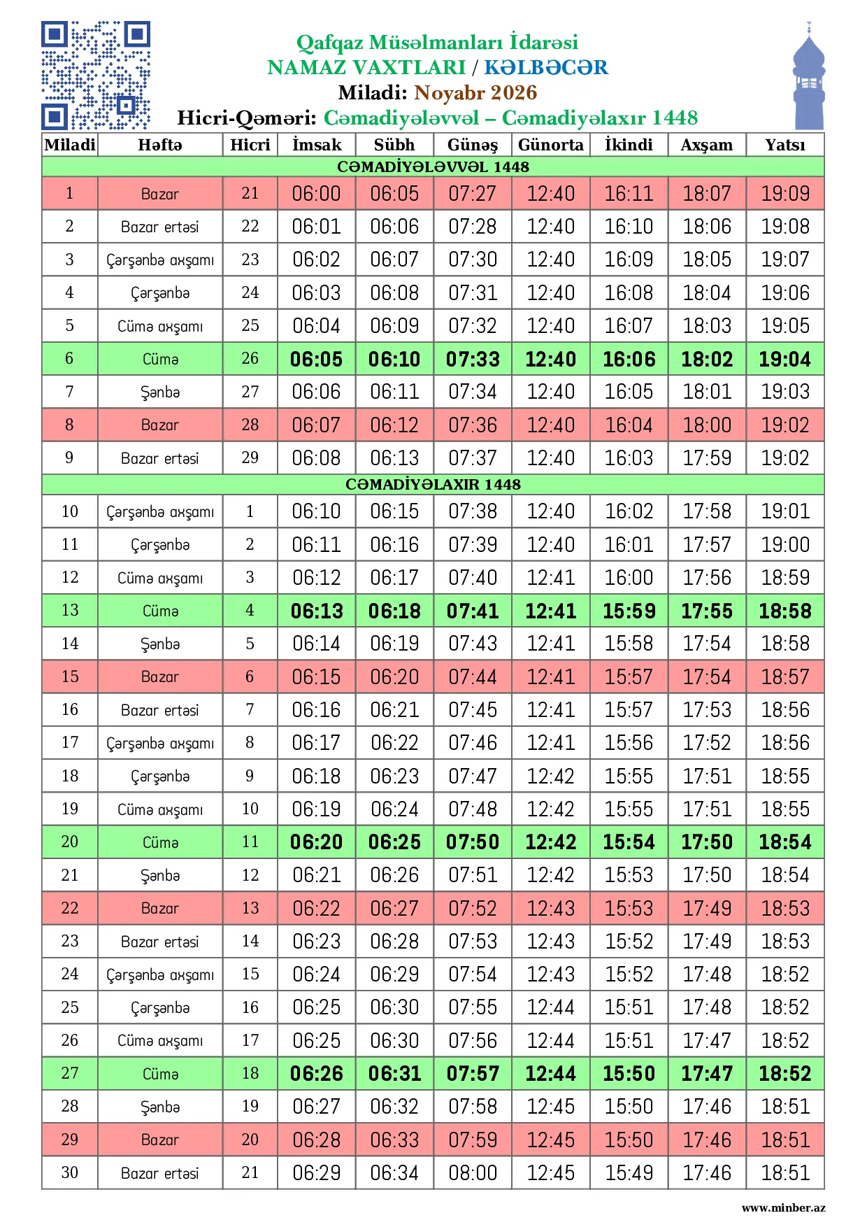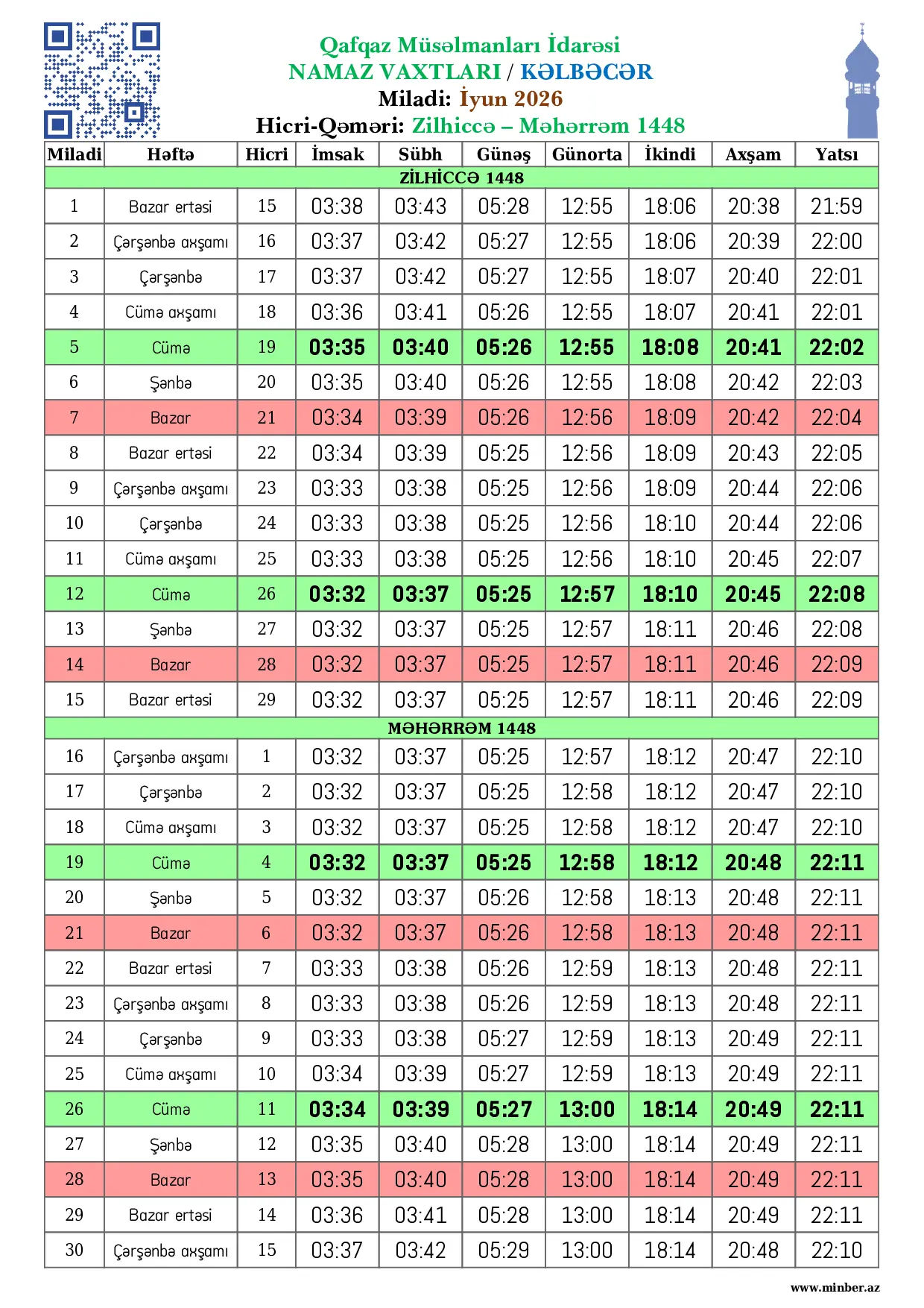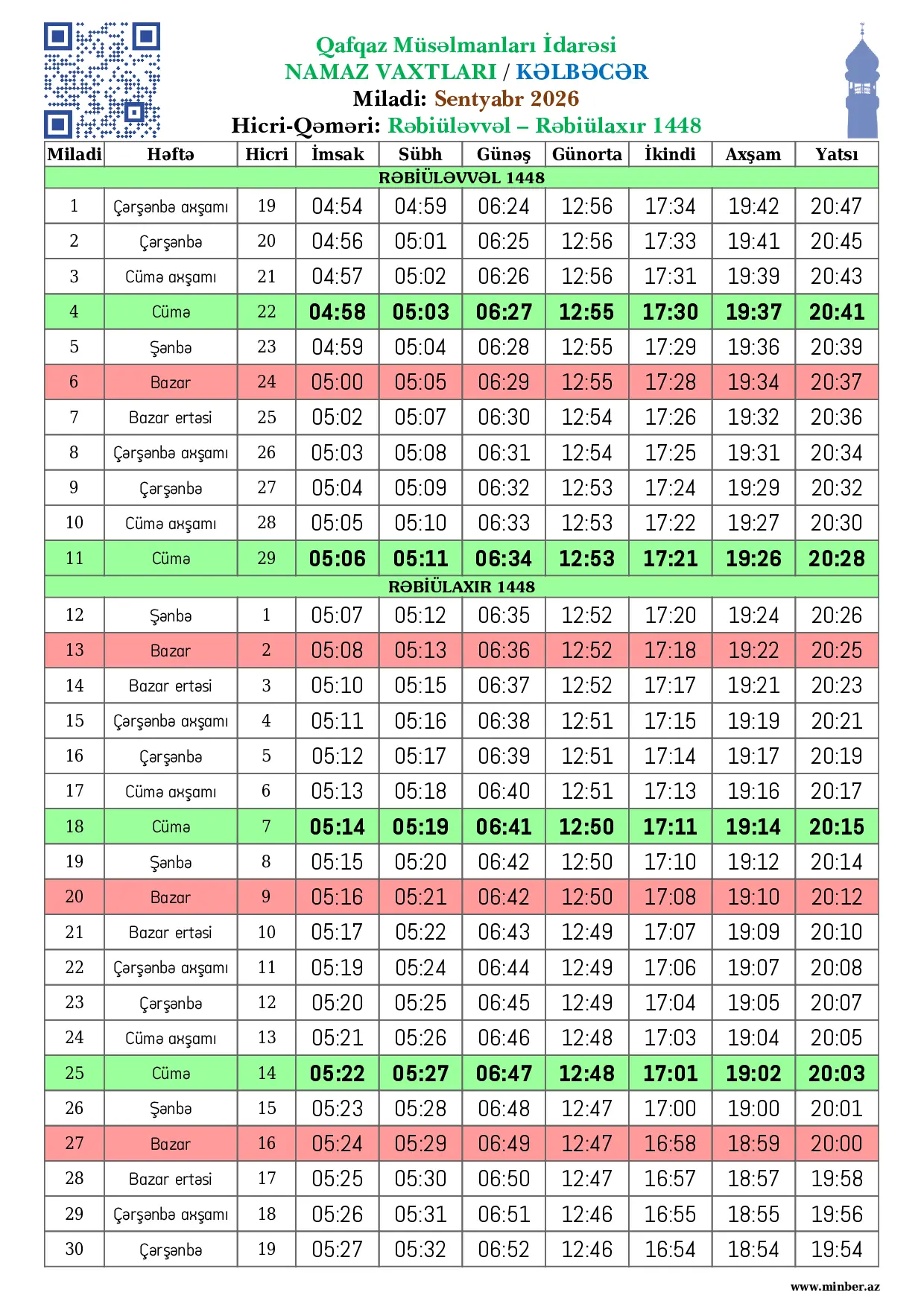 Miladi Həftə Hicri İmsak Sübh namazı Günəş Günorta namazı İkindi namazı Axşam namazı Yatsı namazı