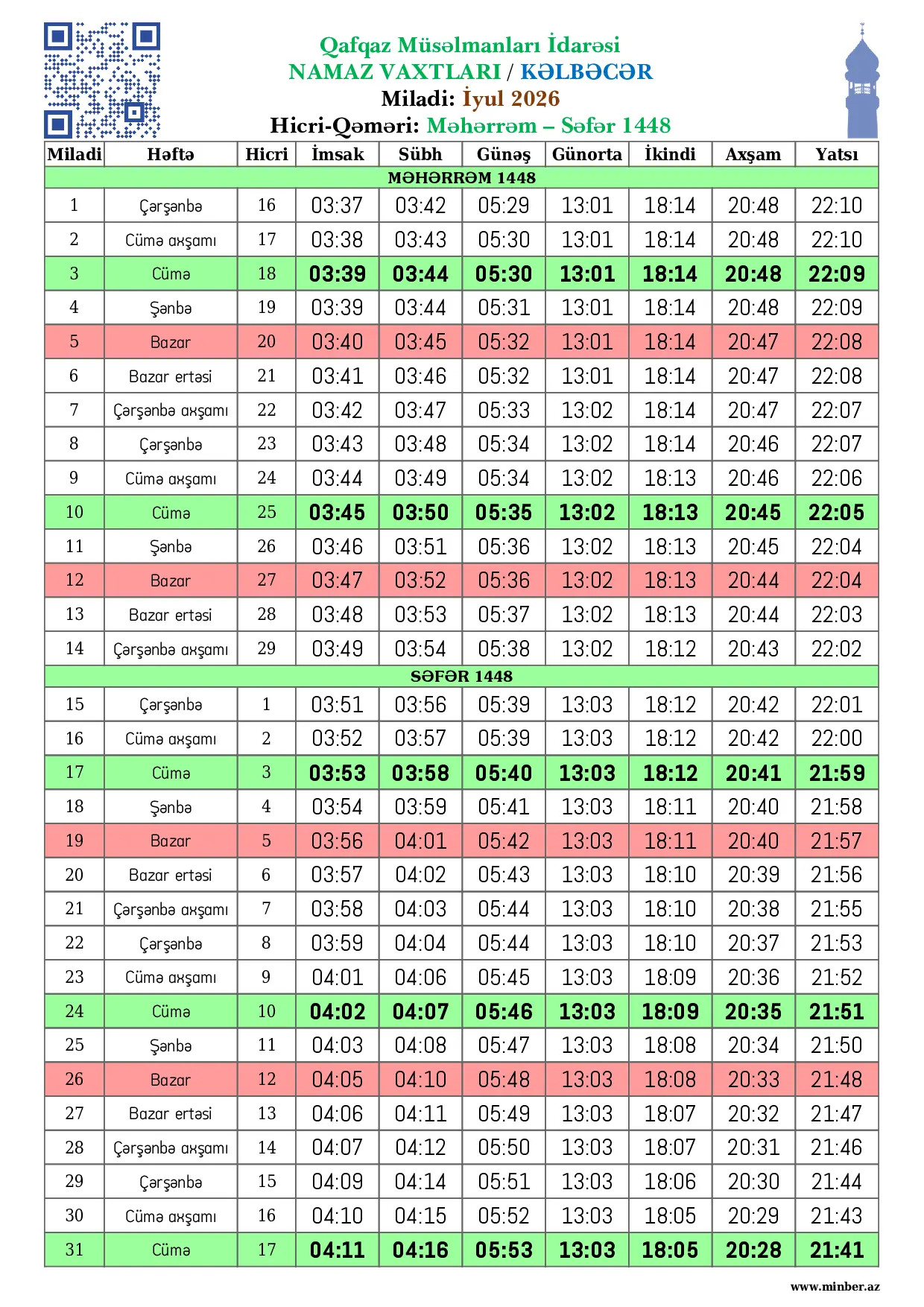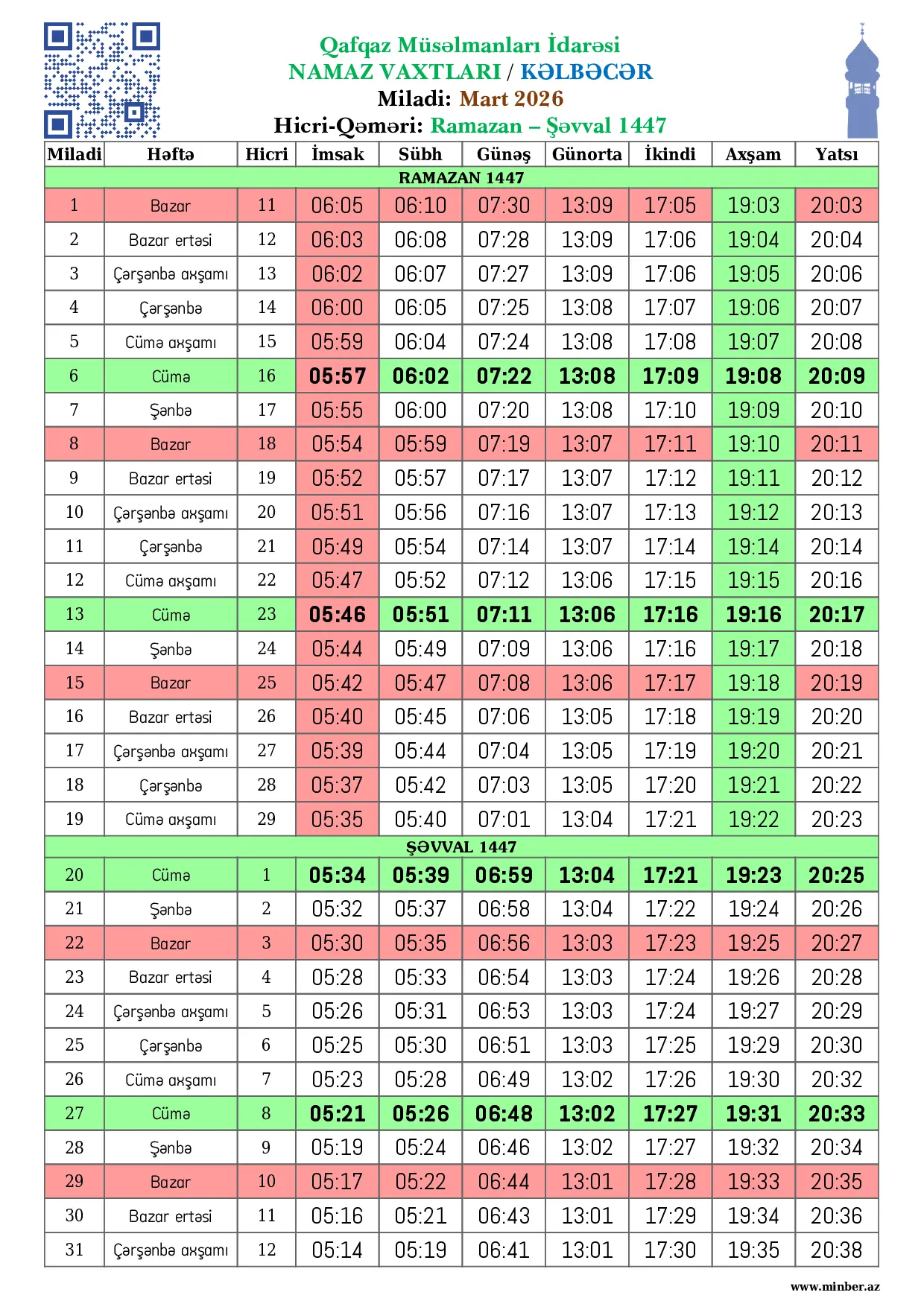 KƏLBƏCƏR üçün NAMAZ VAXTLARI