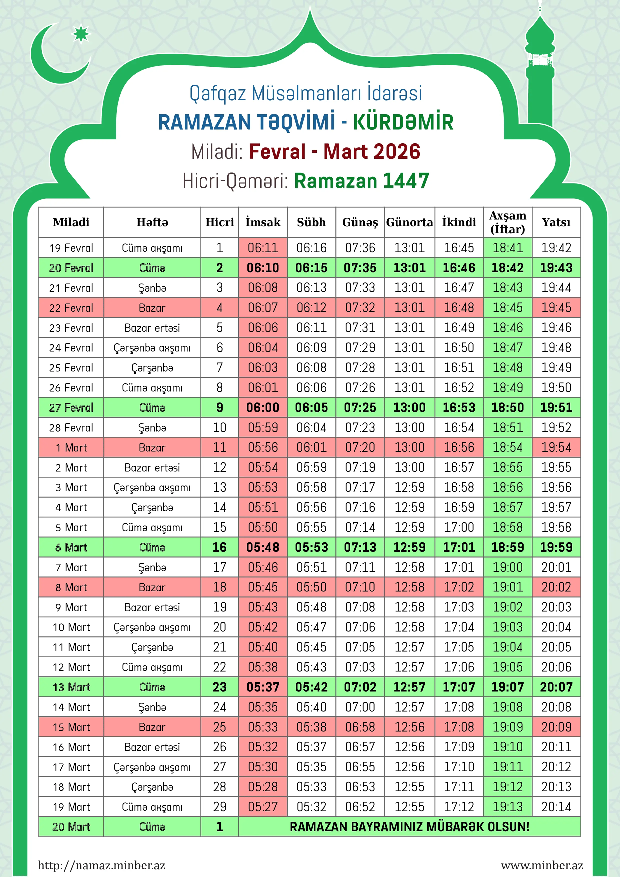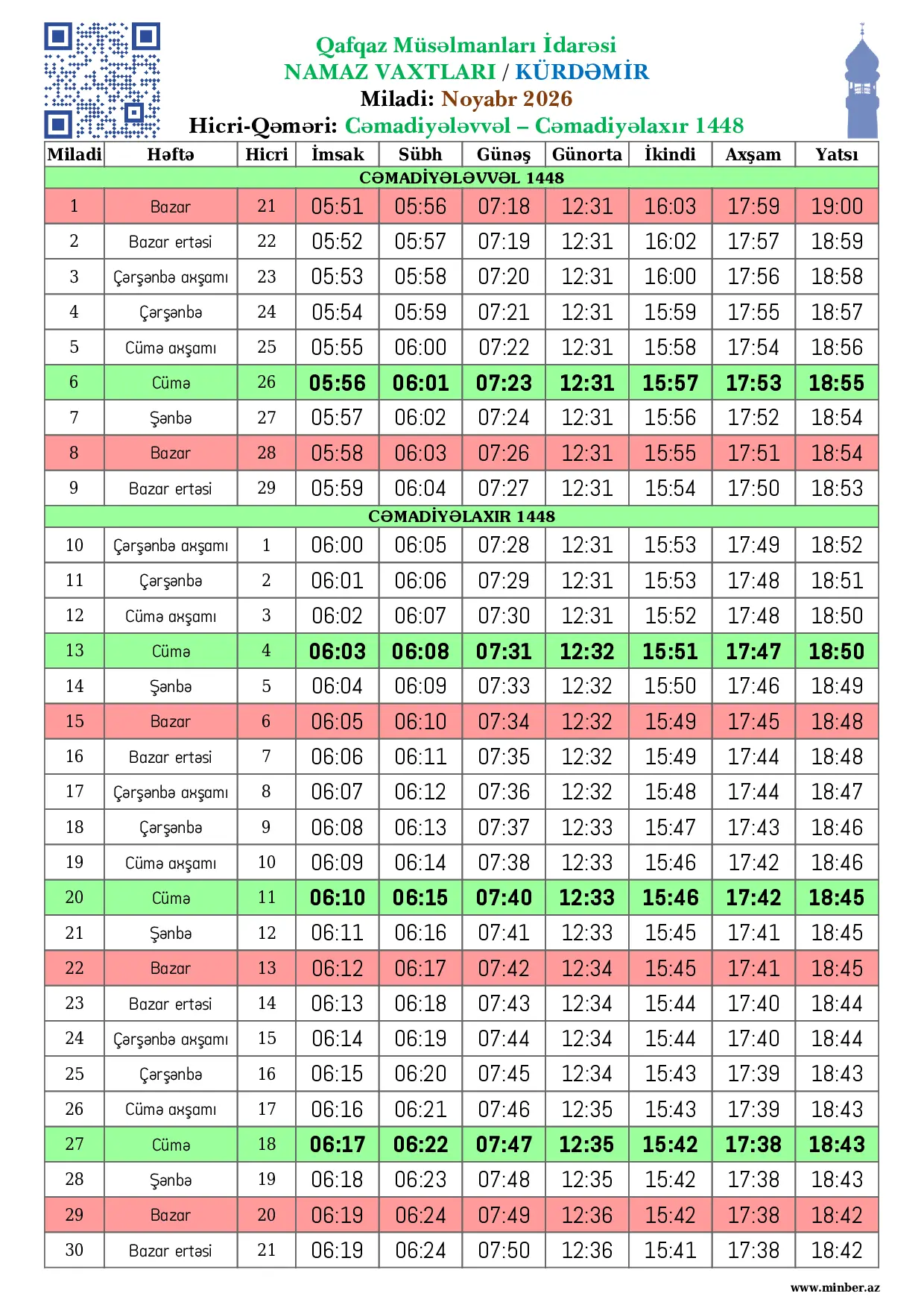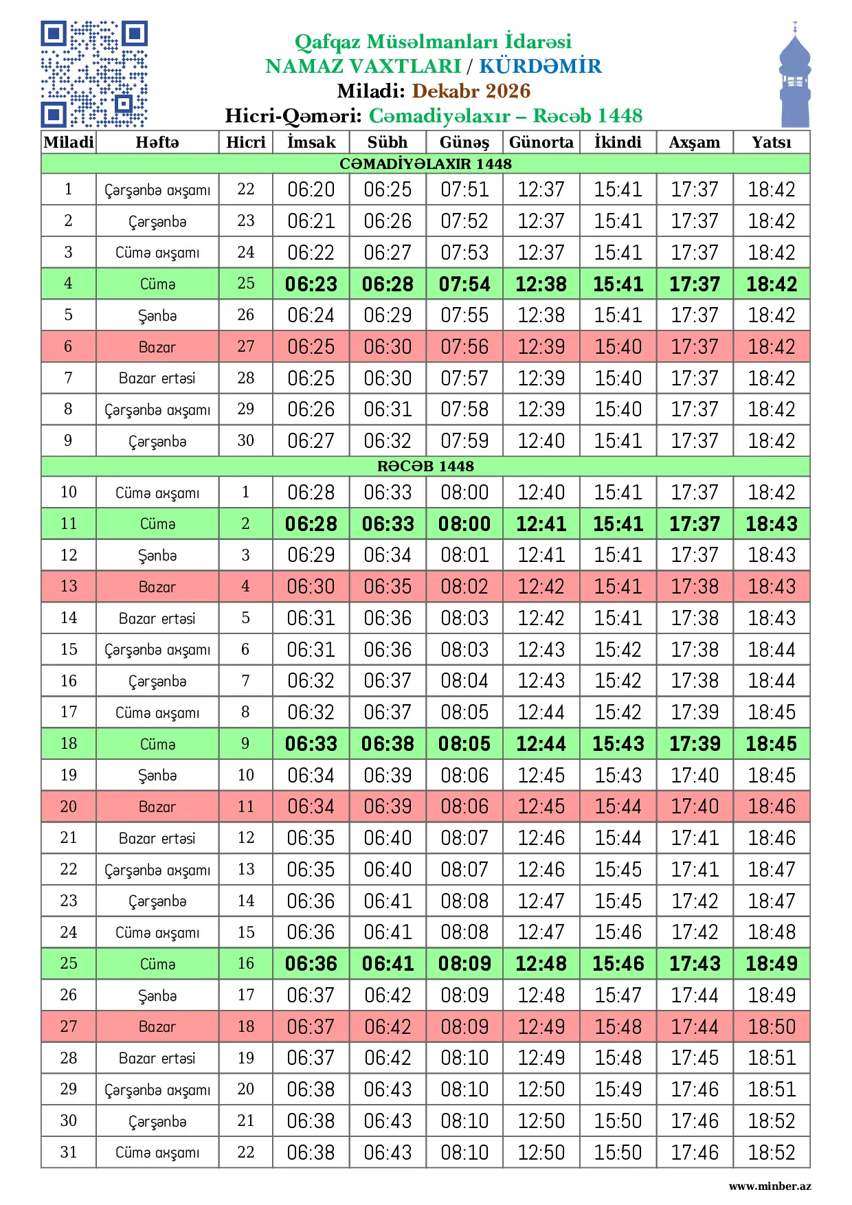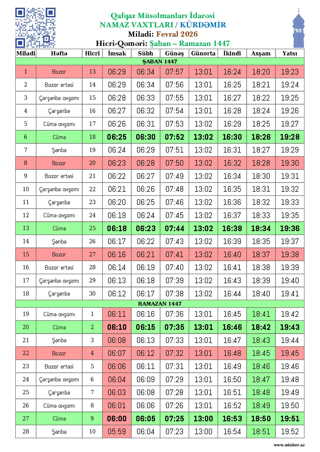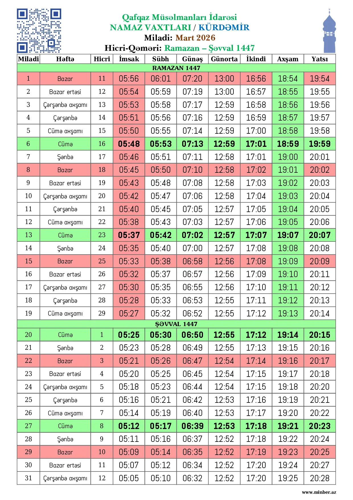 | 25 Aprel 2026 | Şənbə | 8 Zilqədə 1447 | 04:20 | 04:25 | 05:54 | 12:45 | 17:36 | 19:52 | 21:00 |