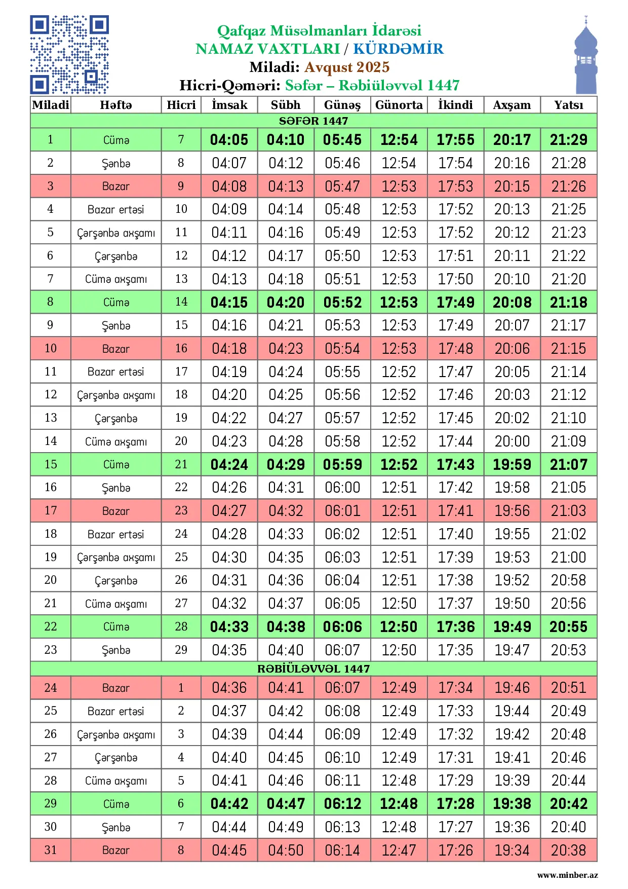 16 Oktyabr 2025 | Cümə axşamı | 24 Rəbiülaxır 1447 | 05:35 | 05:40 | 07:00 | 12:33 | 16:23 | 18:20 | 19:20 |