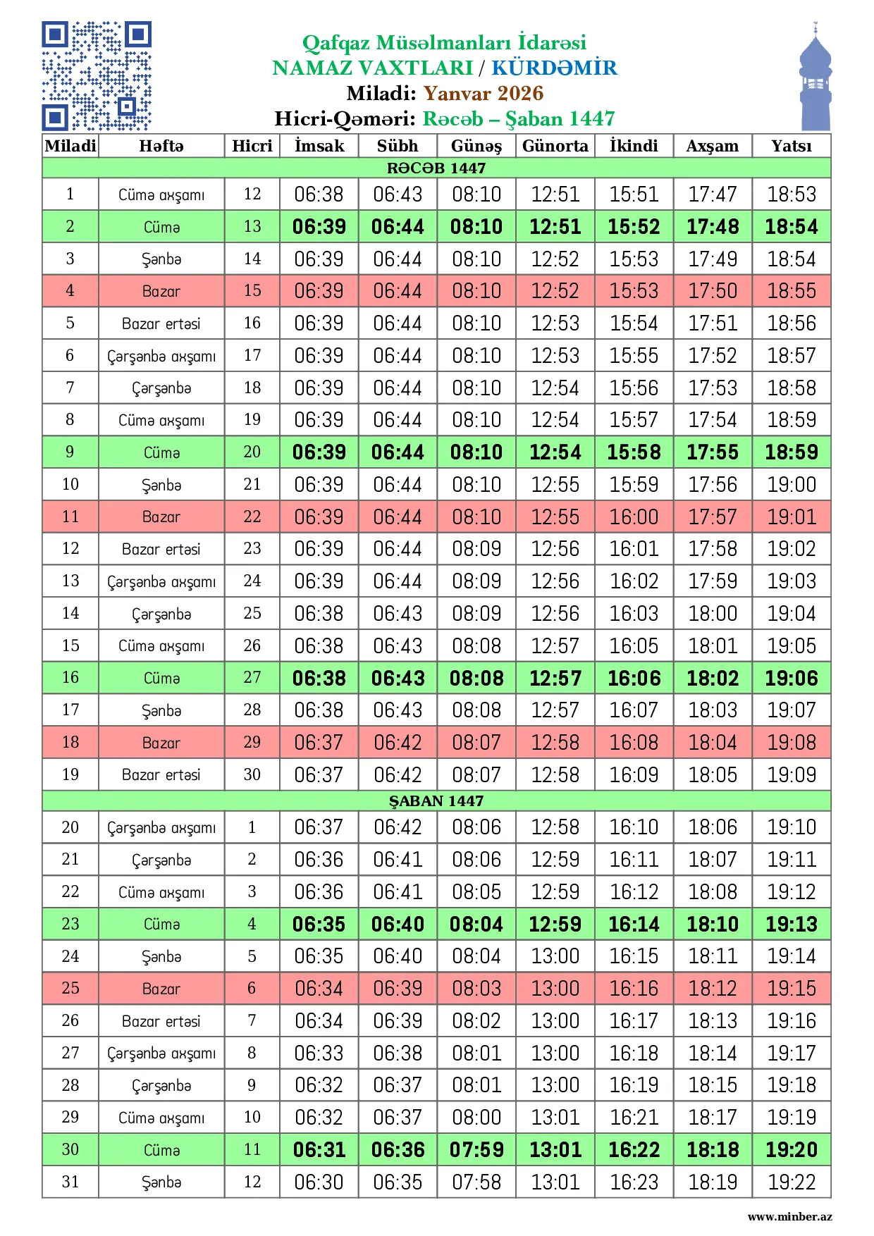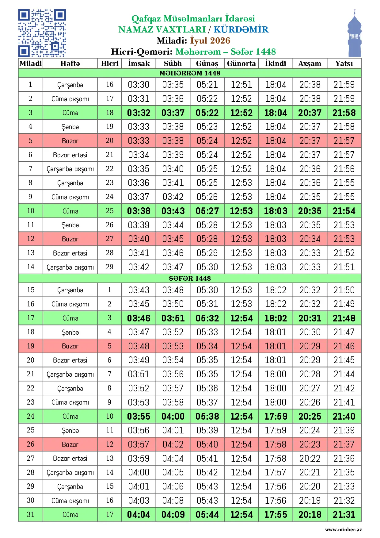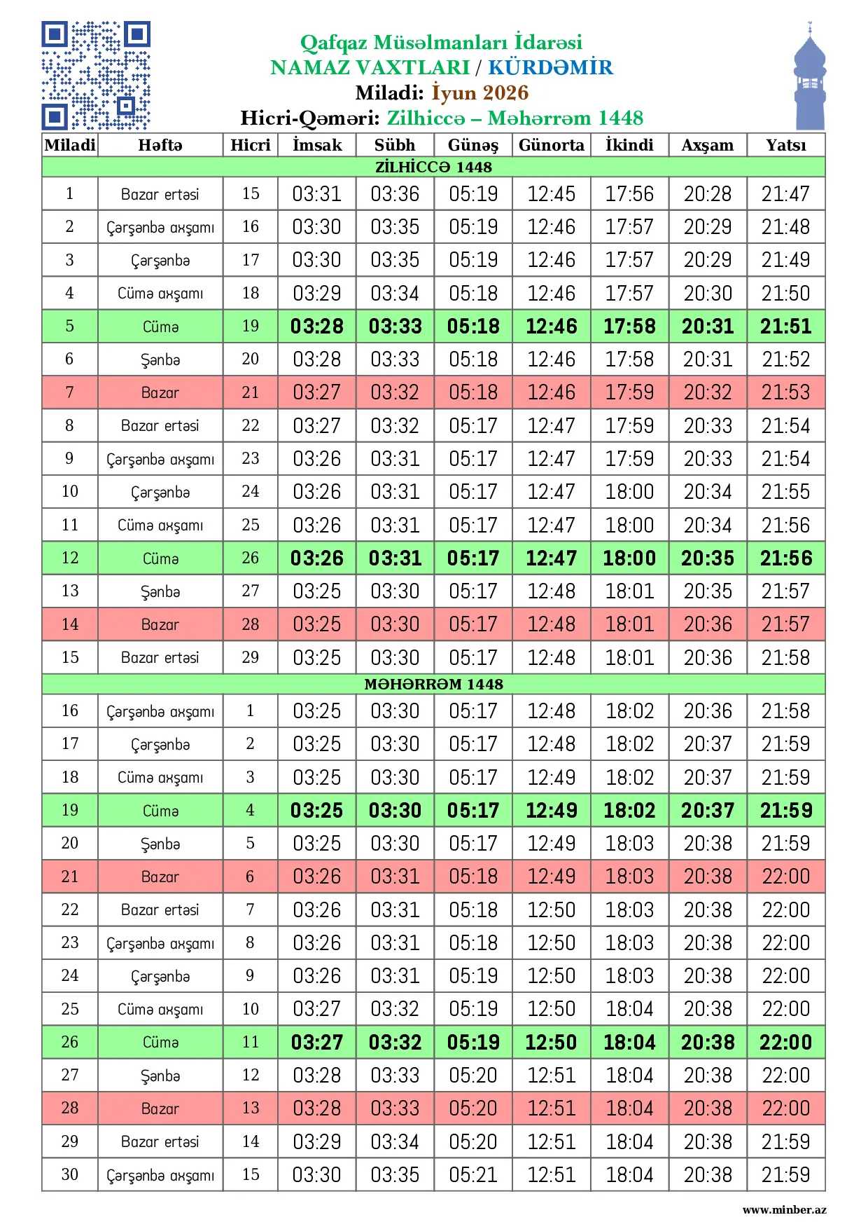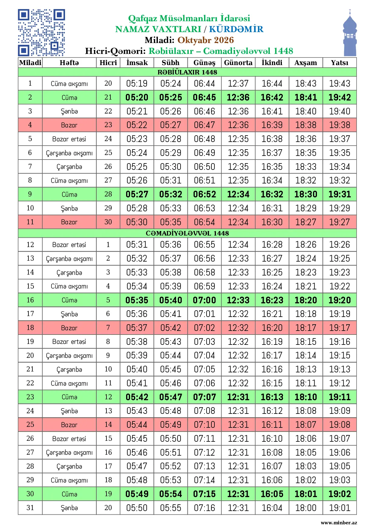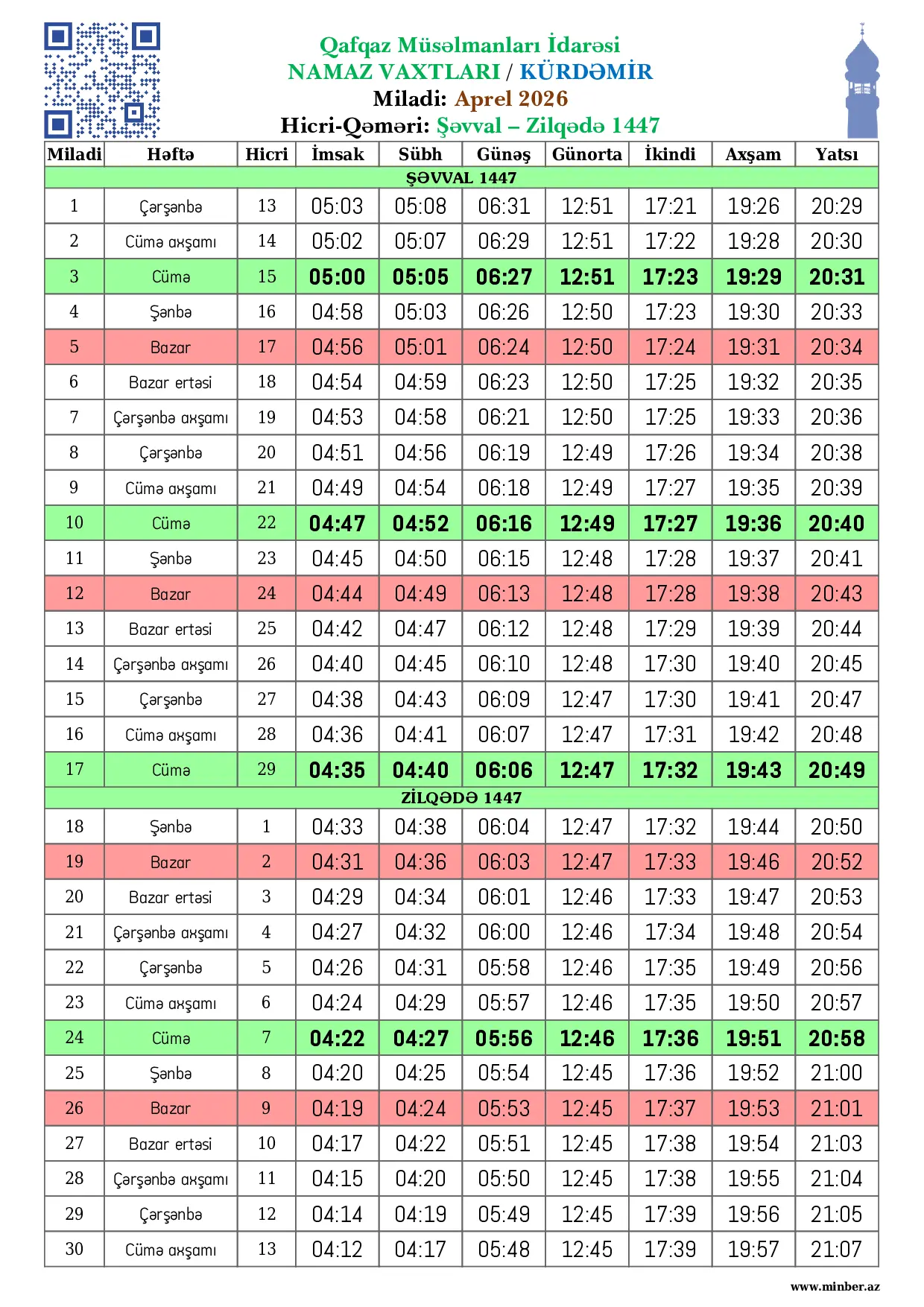 | 26 Aprel 2026 | Bazar | 9 Zilqədə 1447 | 04:19 | 04:24 | 05:53 | 12:45 | 17:37 | 19:53 | 21:01 |