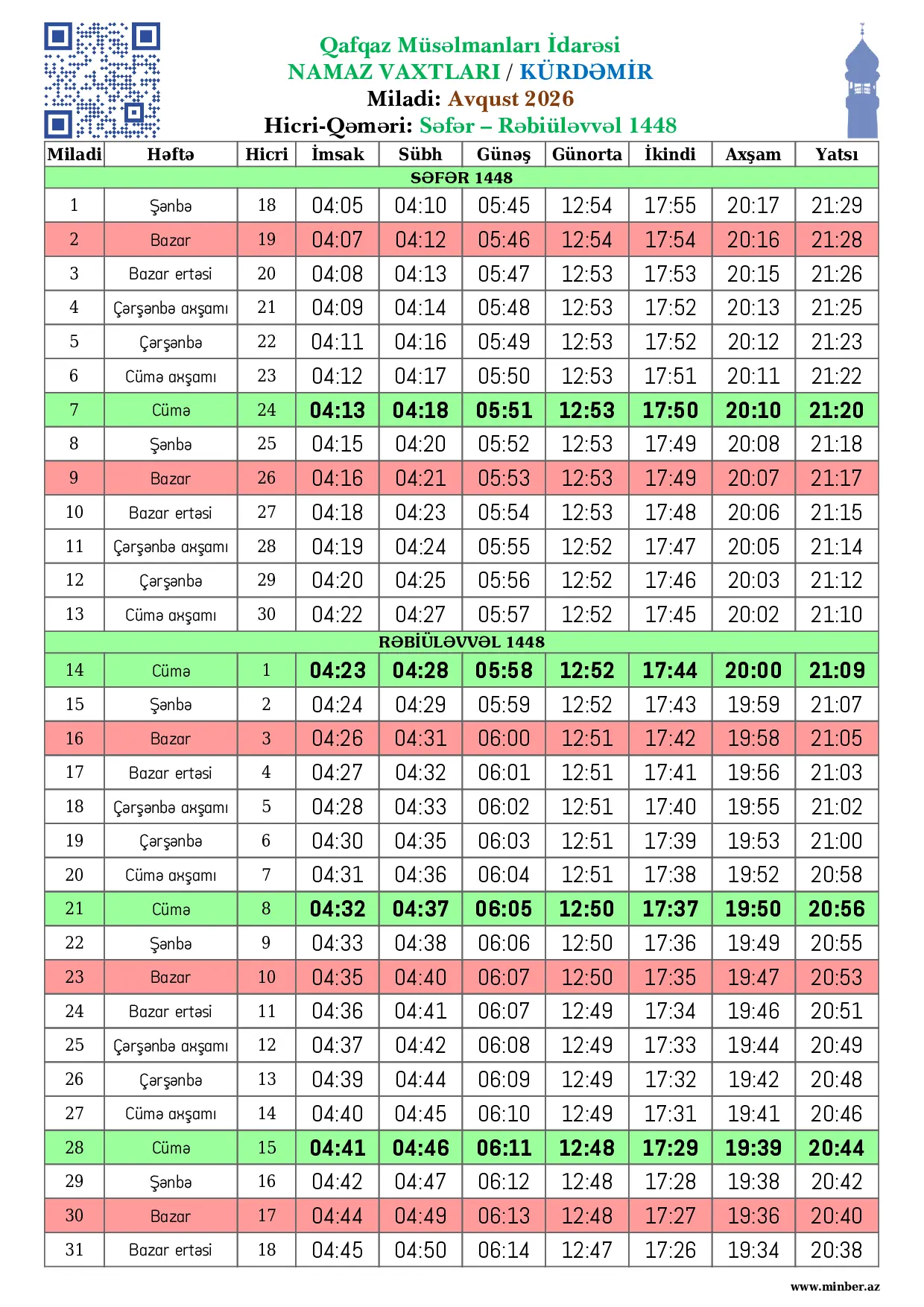 | 24 Aprel 2026 | Cümə | 7 Zilqədə 1447 | 04:22 | 04:27 | 05:56 | 12:46 | 17:36 | 19:51 | 20:58 |