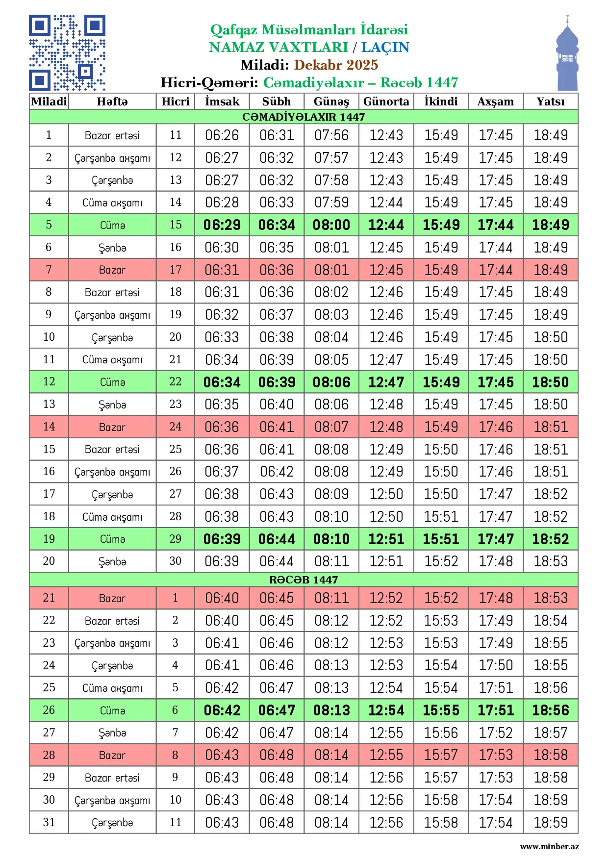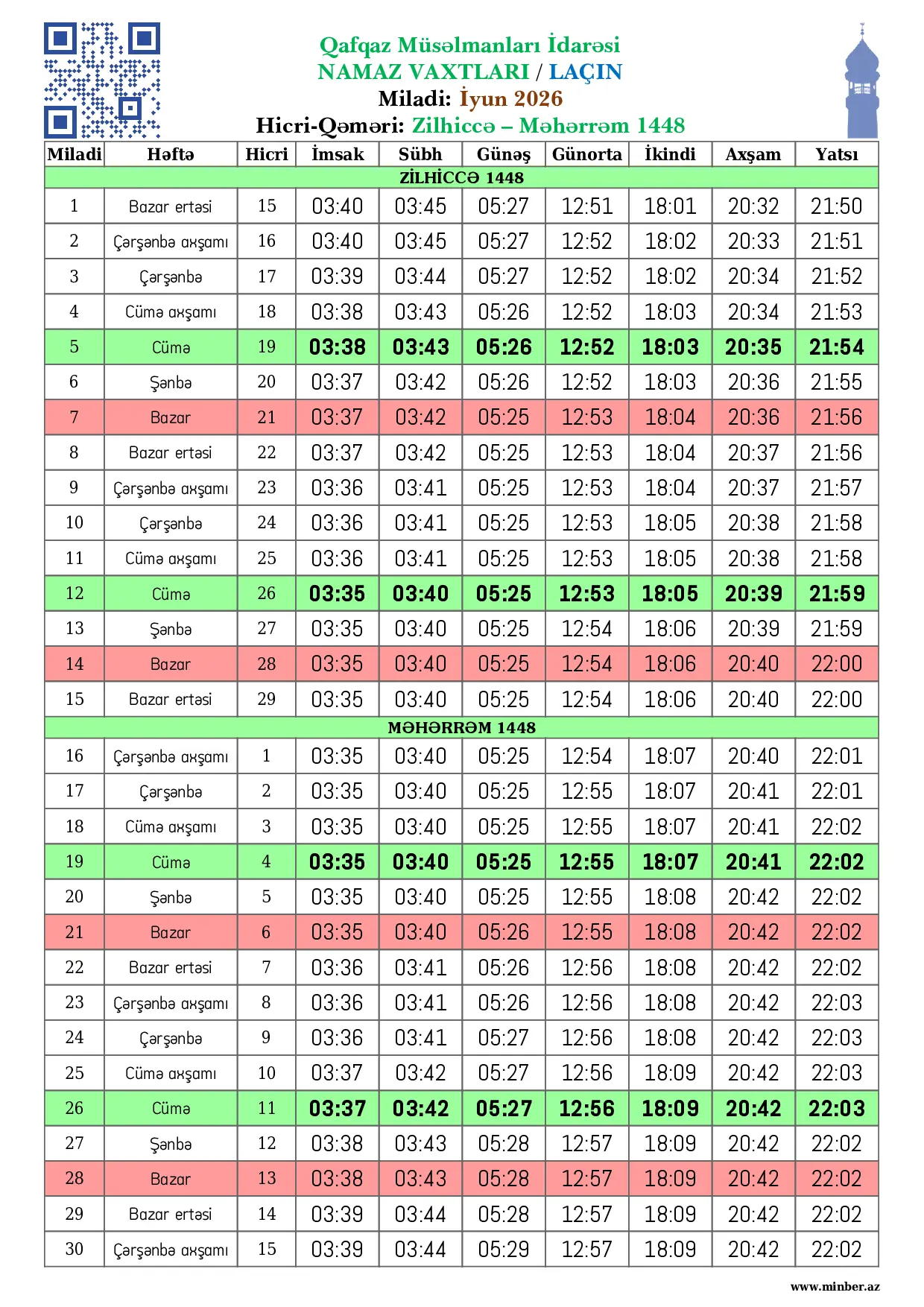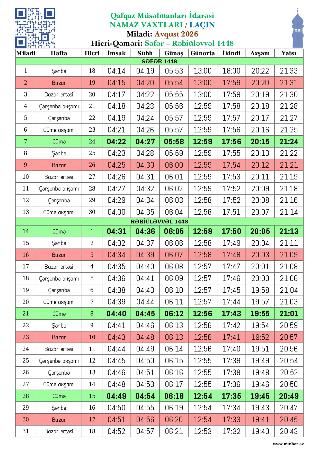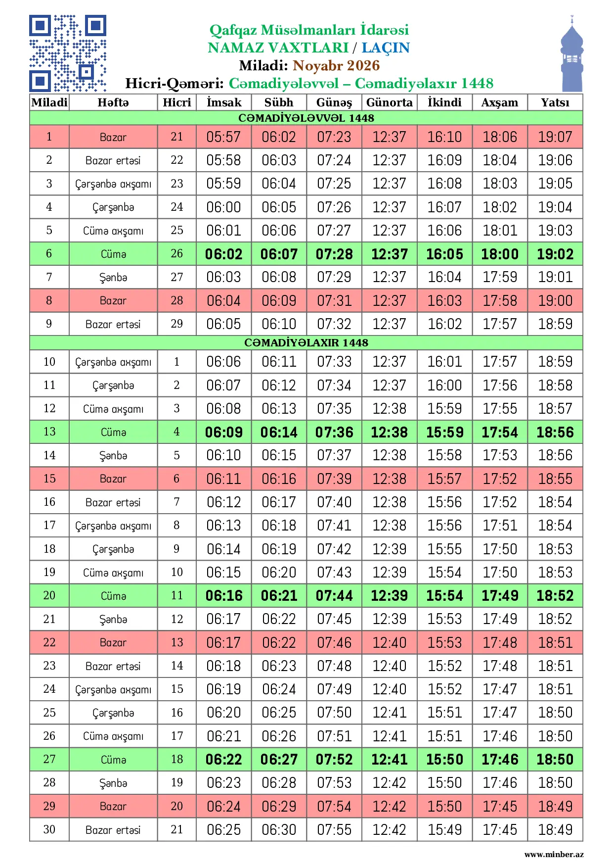 Miladi Həftə Hicri İmsak Sübh namazı Günəş Günorta namazı İkindi namazı Axşam namazı Yatsı namazı
