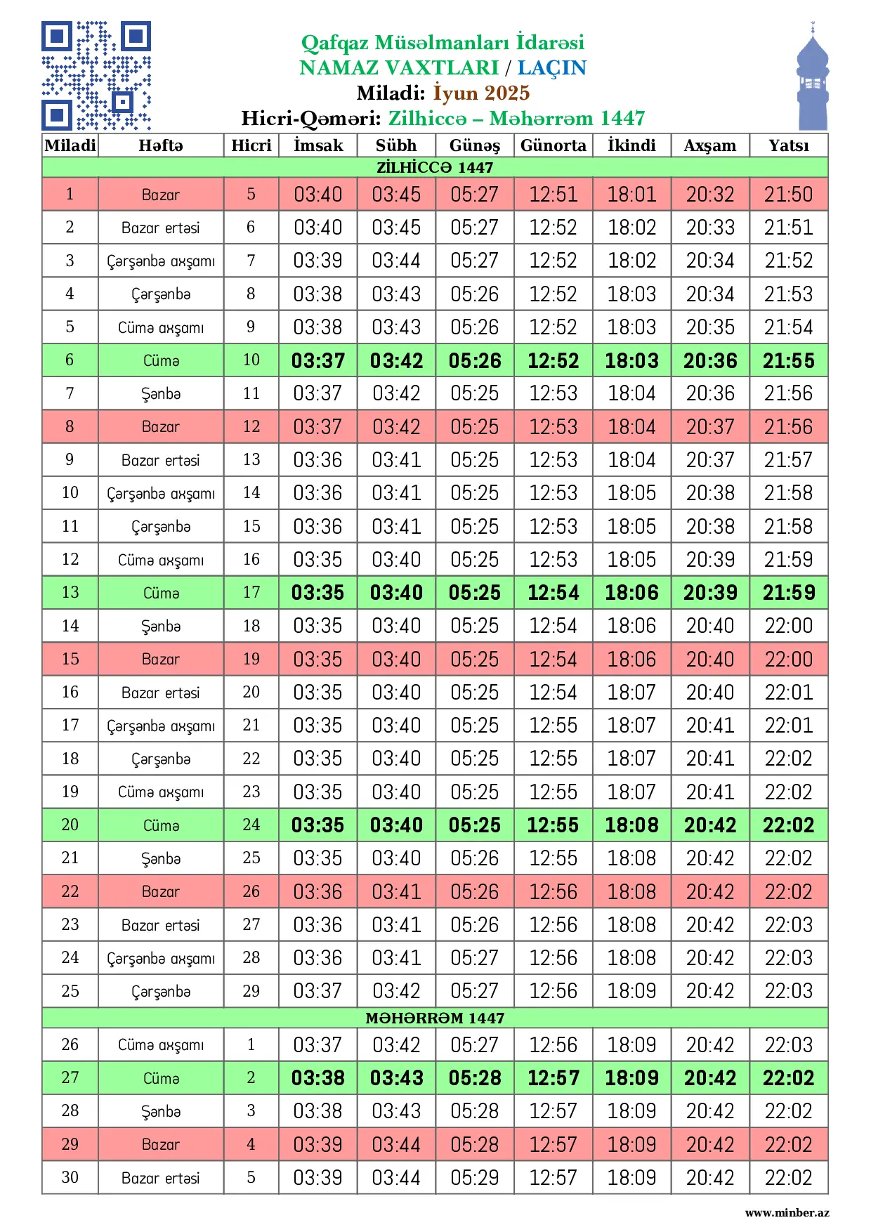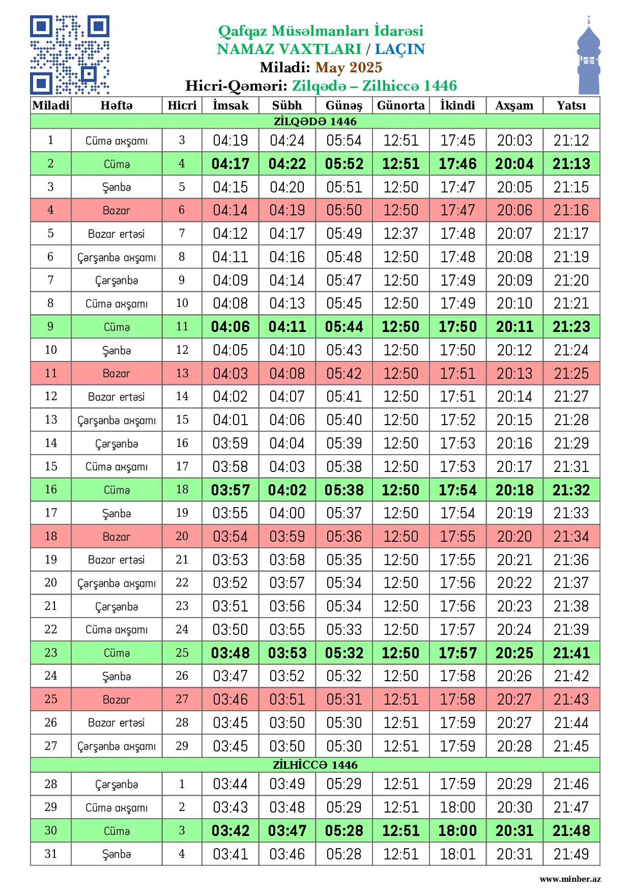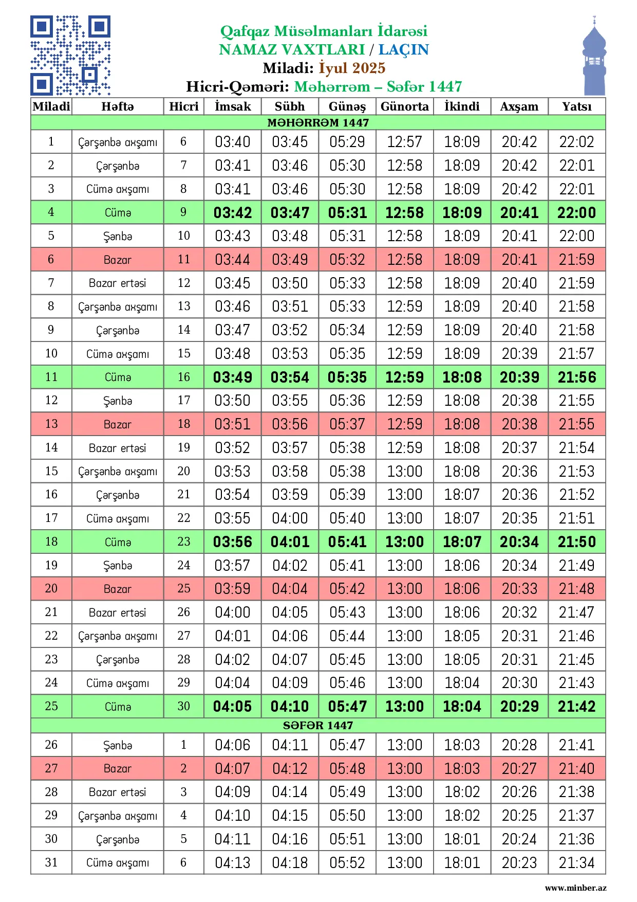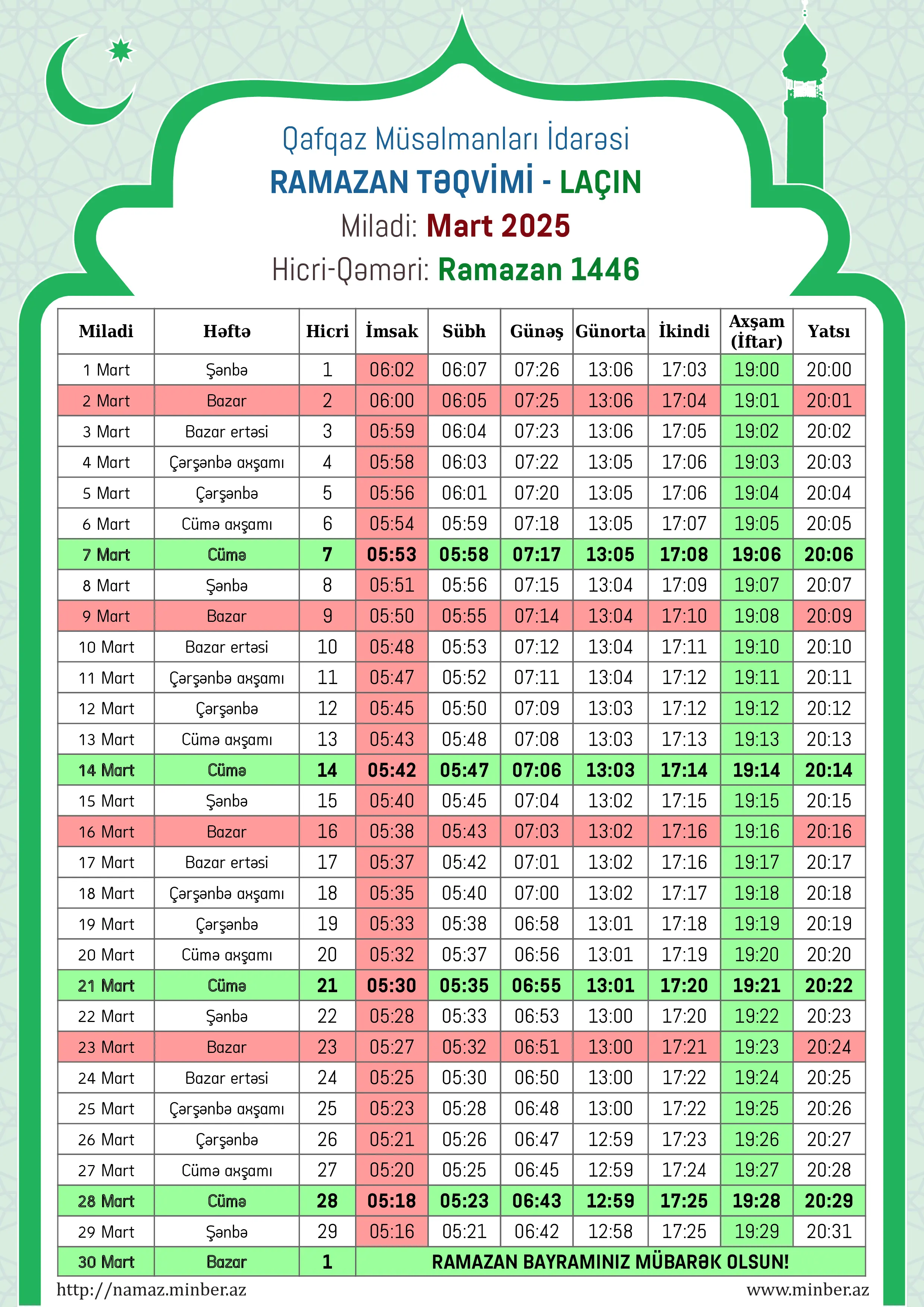 Miladi Həftə Hicri İmsak Sübh namazı Günəş Günorta namazı İkindi namazı Axşam namazı Yatsı namazı