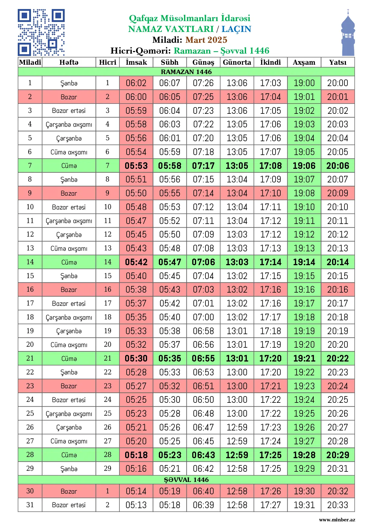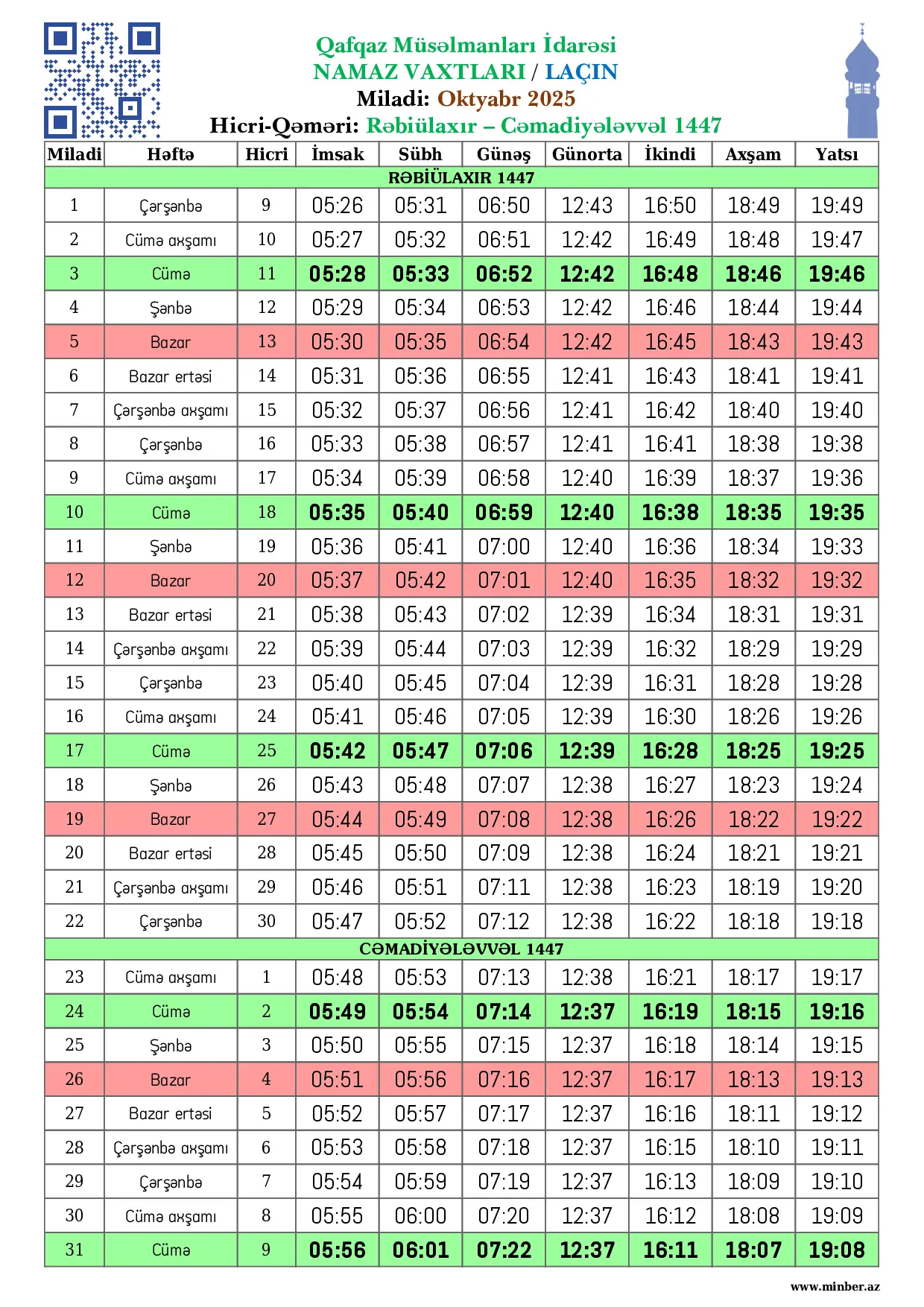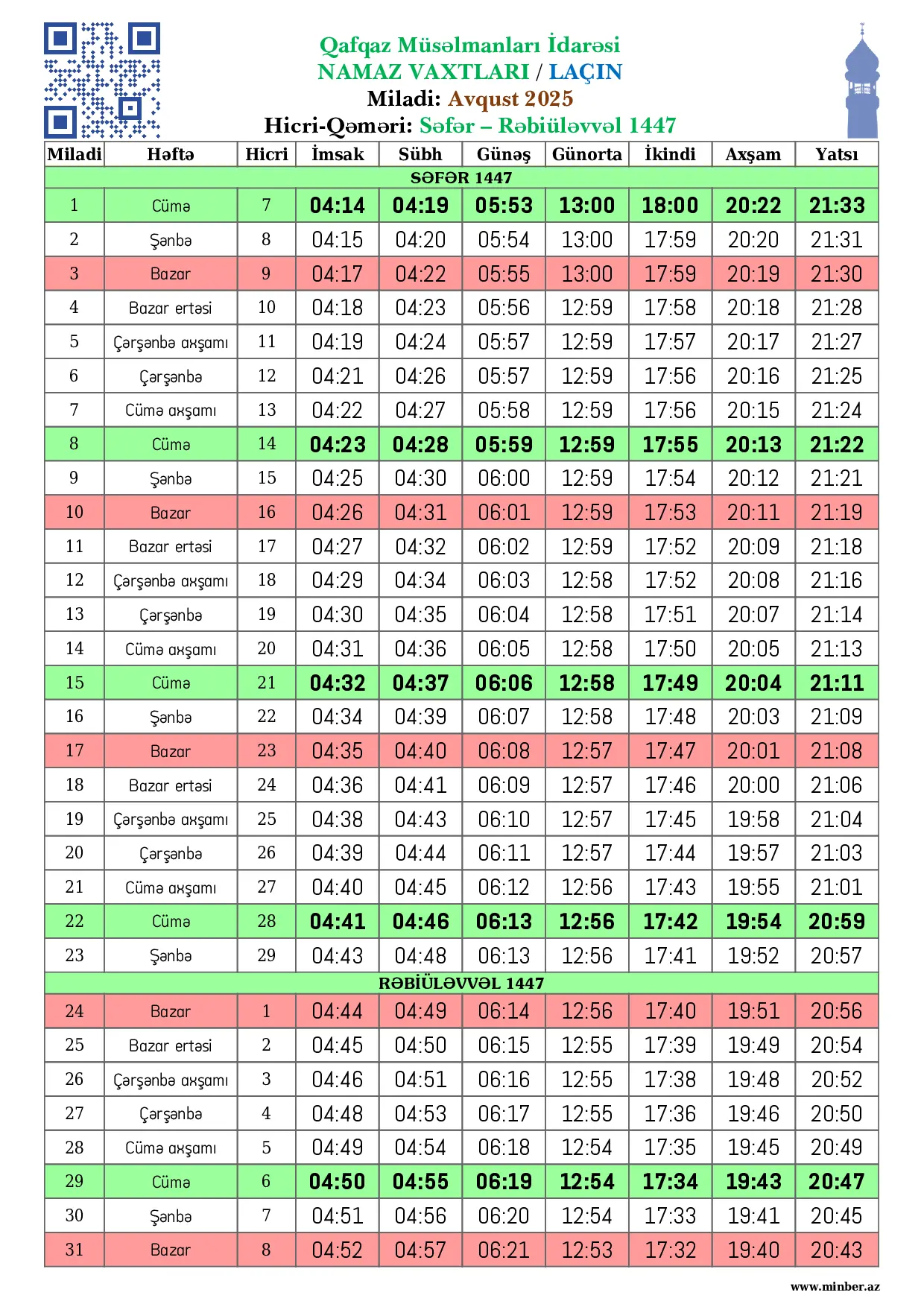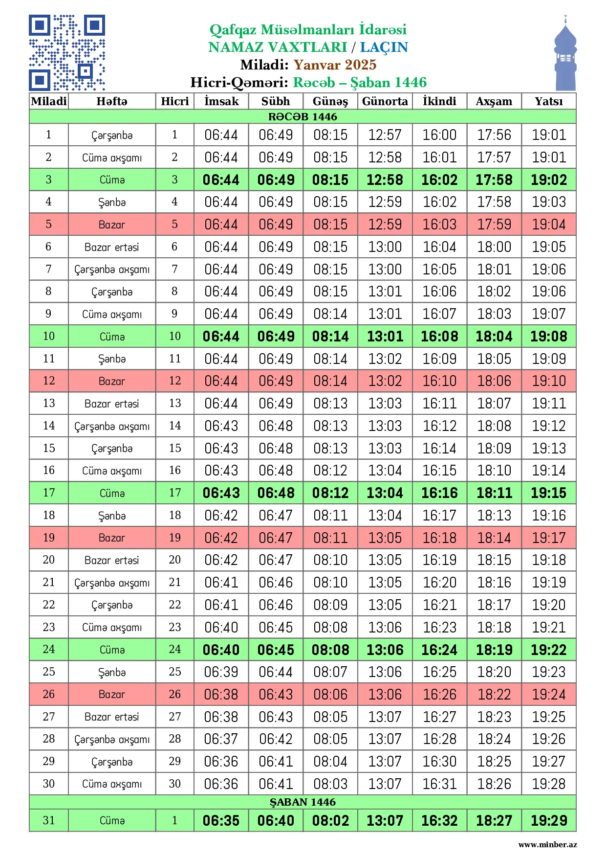 Miladi Həftə Hicri İmsak Sübh namazı Günəş Günorta namazı İkindi namazı Axşam namazı Yatsı namazı