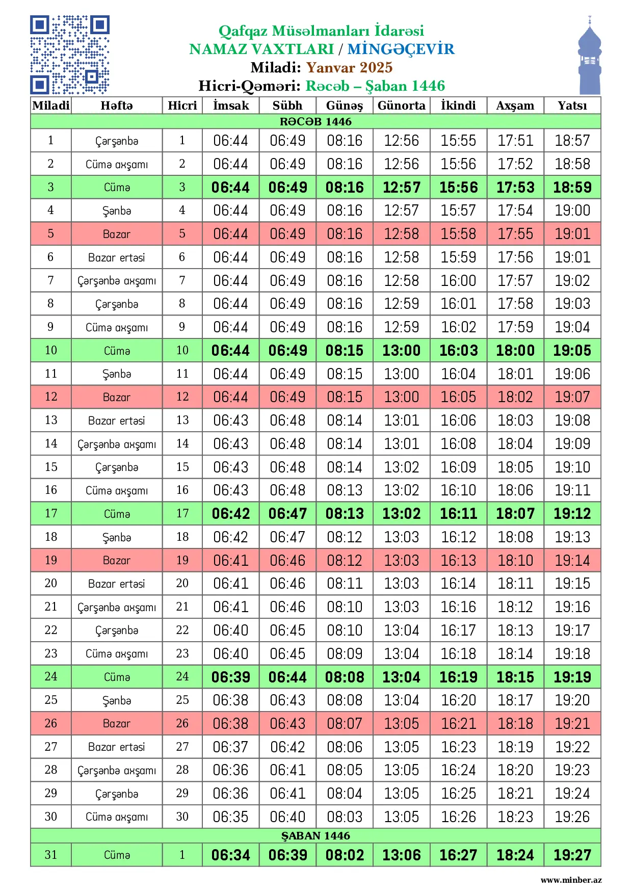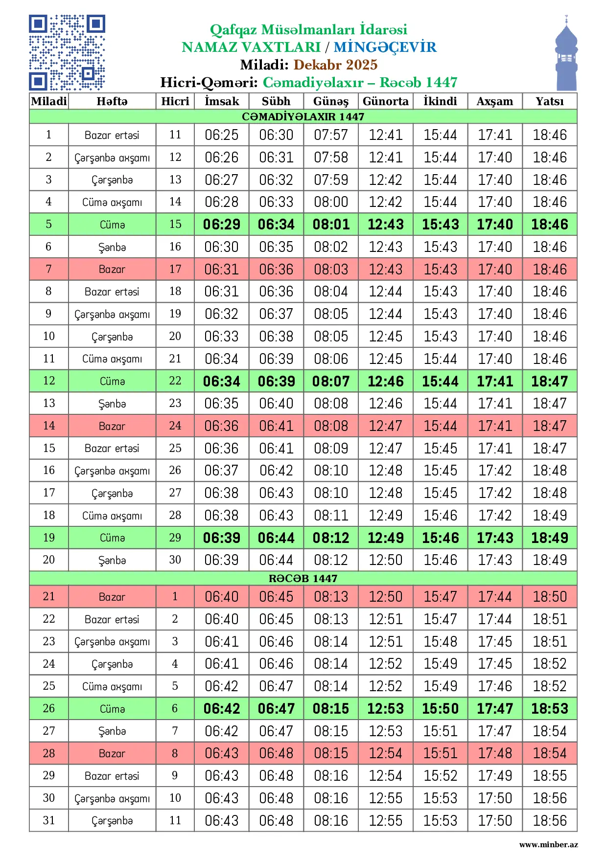| 16 Noyabr 2025 | Bazar | 25 Cəmadiyələvvəl 1447 | 06:11 | 06:16 | 07:40 | 12:36 | 15:52 | 17:48 | 18:52 |