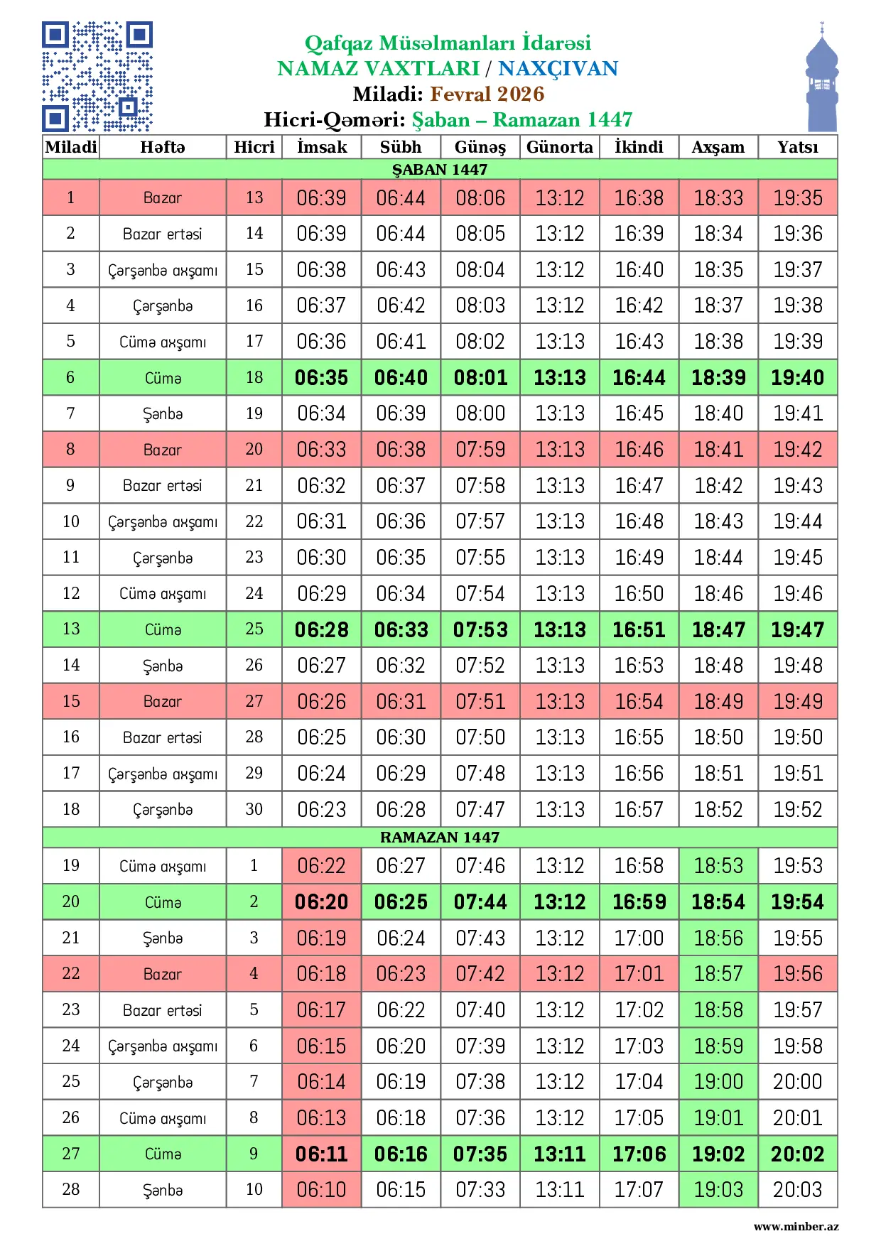 | 26 Fevral 2026 | Cümə axşamı | 8 Ramazan 1447 | 06:13 | 06:18 | 07:36 | 13:12 | 17:05 | 19:01 | 20:01 |