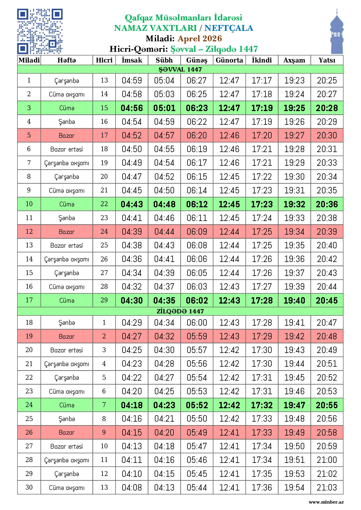 | Miladi | Həftə | Hicri | İmsak | Sübh namazı | Günəş | Günorta namazı | İkindi namazı | Axşam namazı | Yatsı namazı |