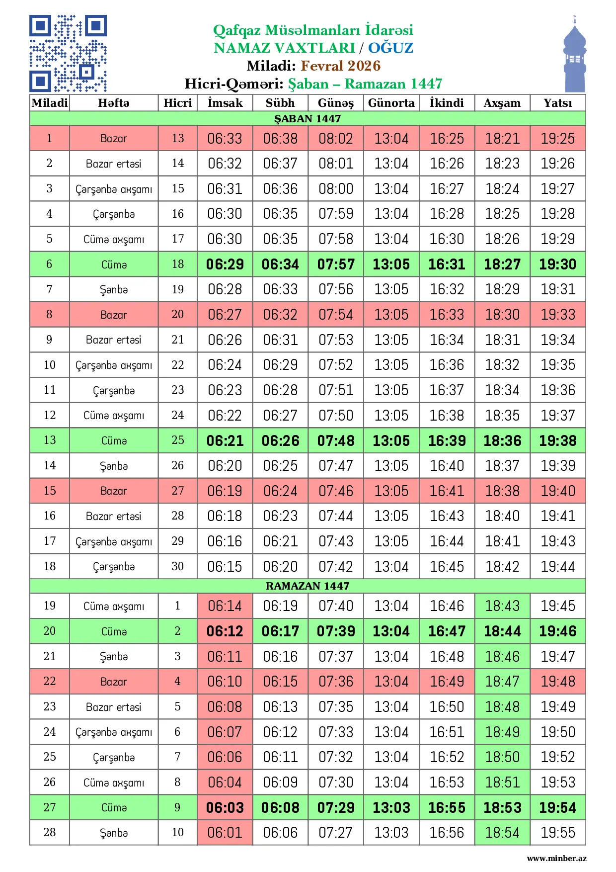 | 7 Fevral 2026 | Şənbə | 19 Şaban 1447 | 06:28 | 06:33 | 07:56 | 13:05 | 16:32 | 18:29 | 19:31 |