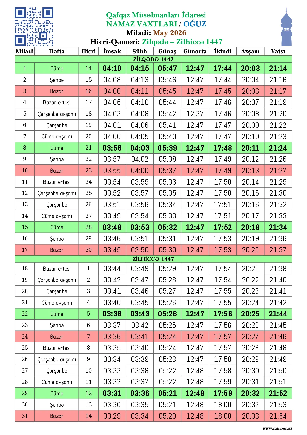 | Miladi | Həftə | Hicri | İmsak | Sübh namazı | Günəş | Günorta namazı | İkindi namazı | Axşam namazı | Yatsı namazı |