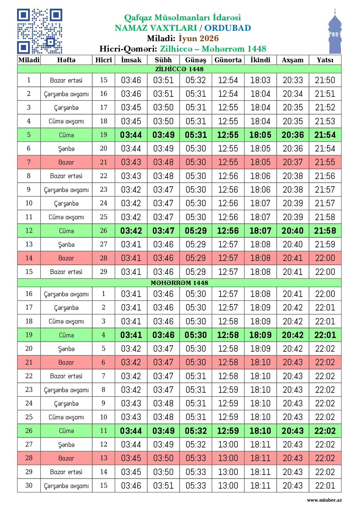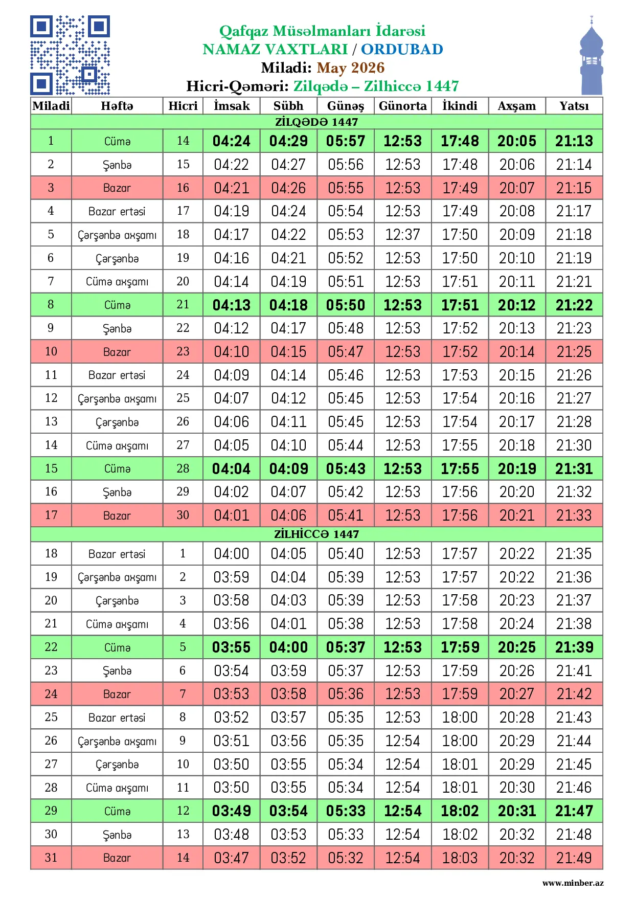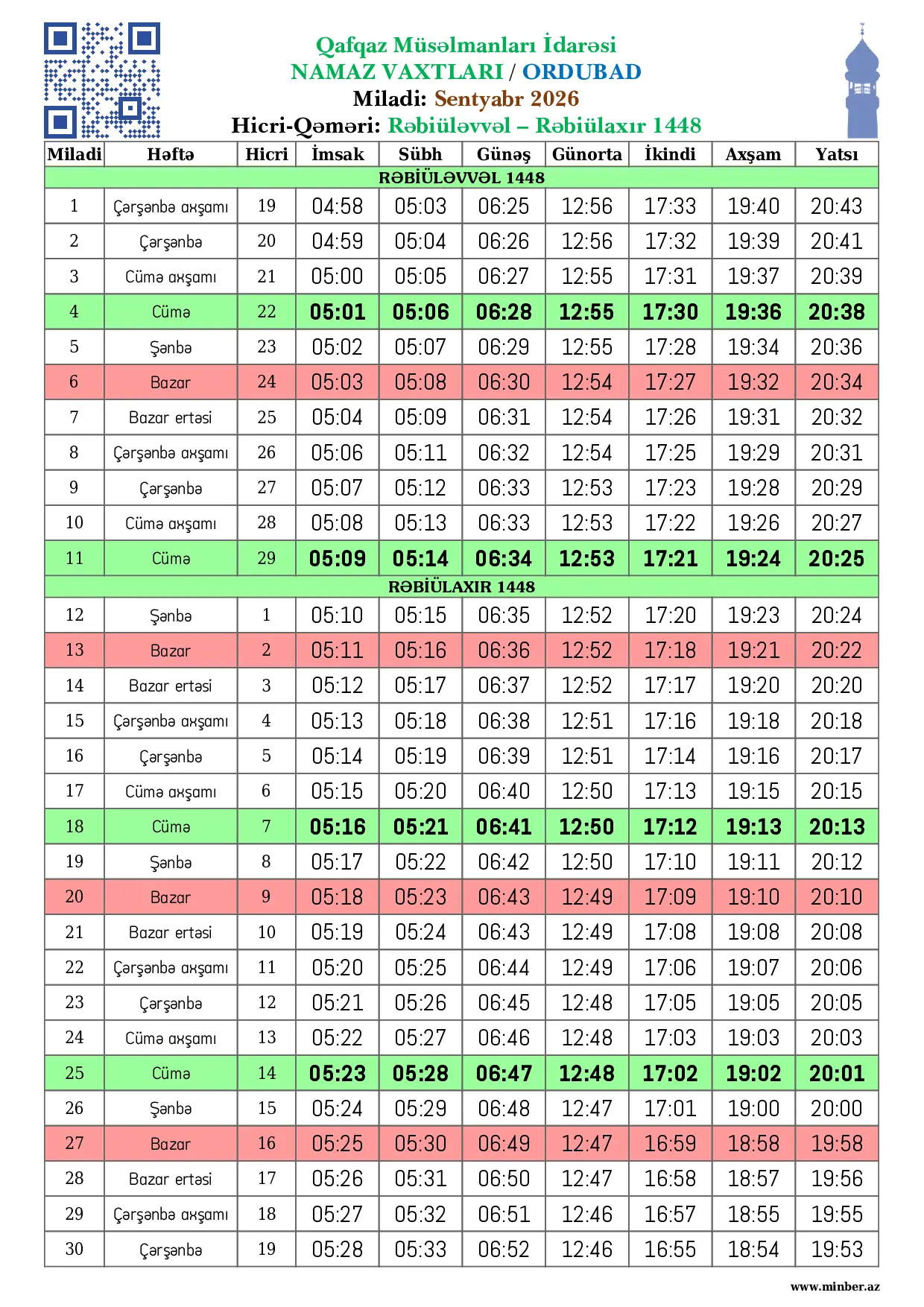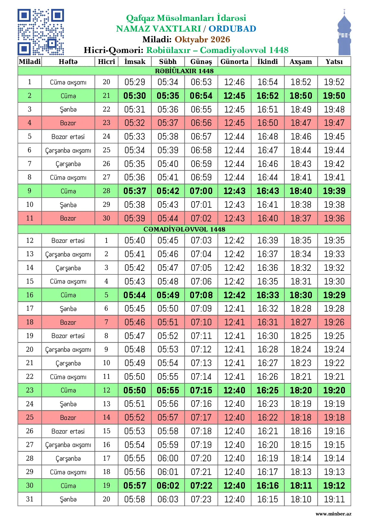 | 28 Fevral 2026 | Şənbə | 10 Ramazan 1447 | 06:08 | 06:13 | 07:31 | 13:09 | 17:05 | 19:01 | 20:01 |