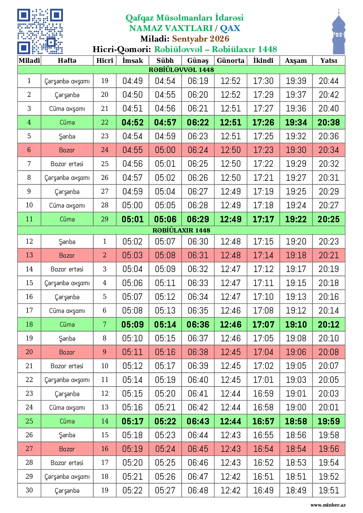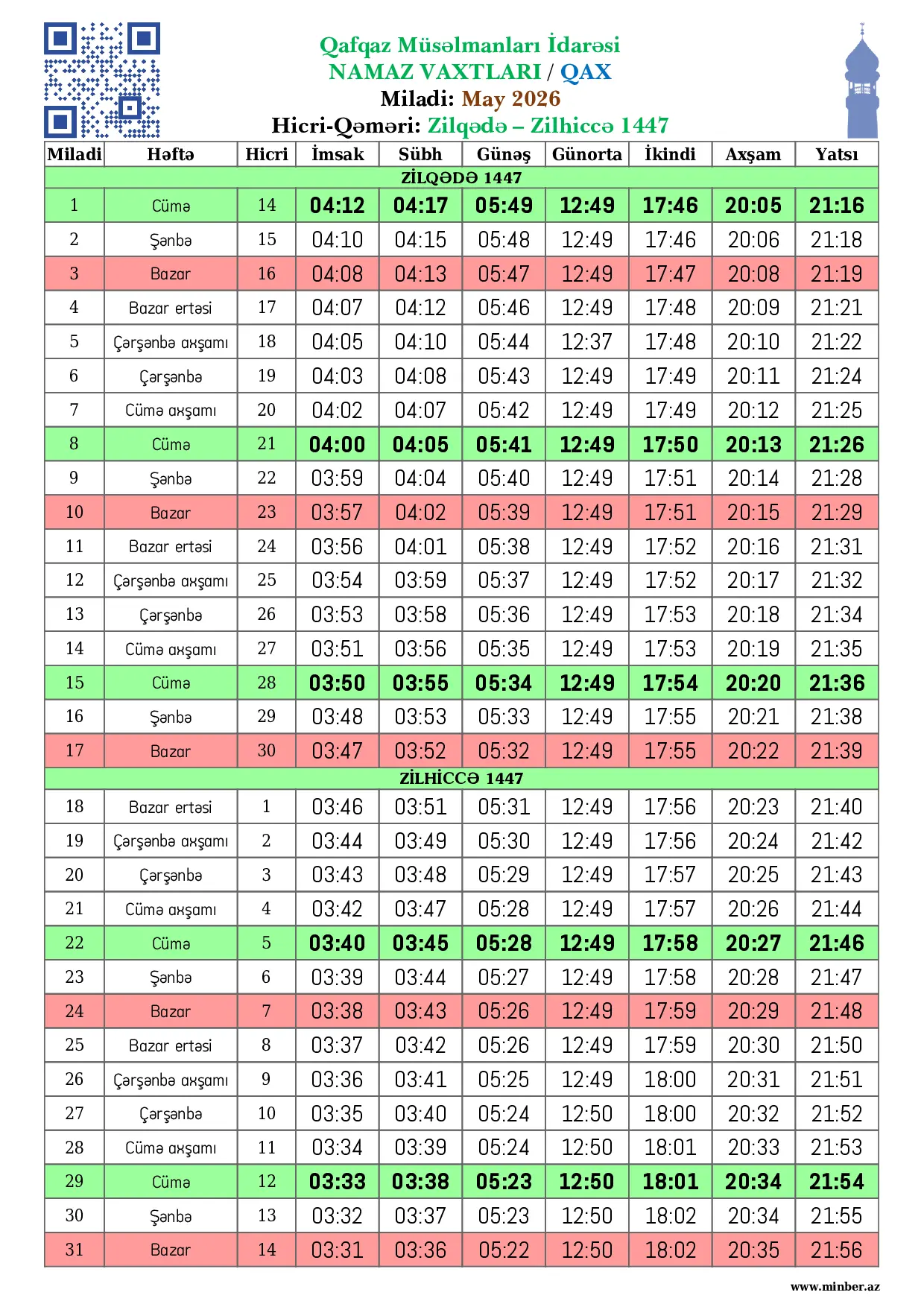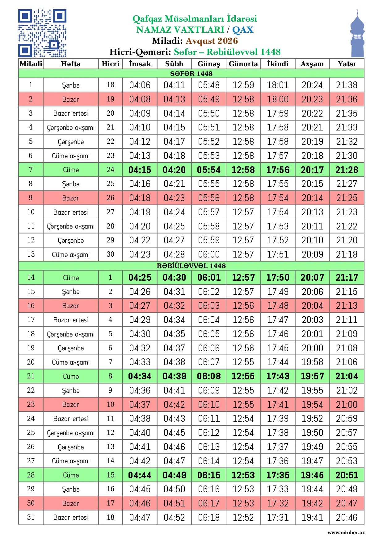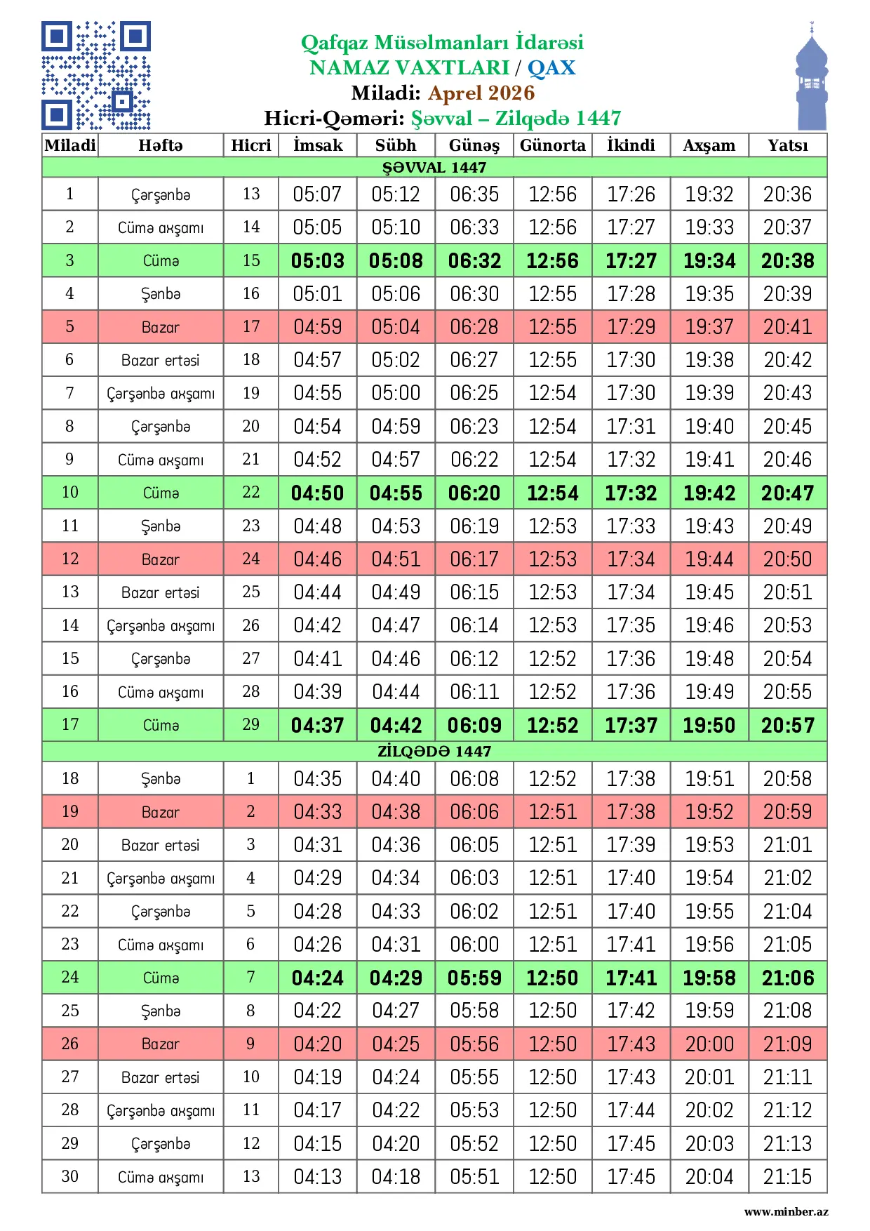 | 25 Aprel 2026 | Şənbə | 8 Zilqədə 1447 | 04:22 | 04:27 | 05:58 | 12:50 | 17:42 | 19:59 | 21:08 |
