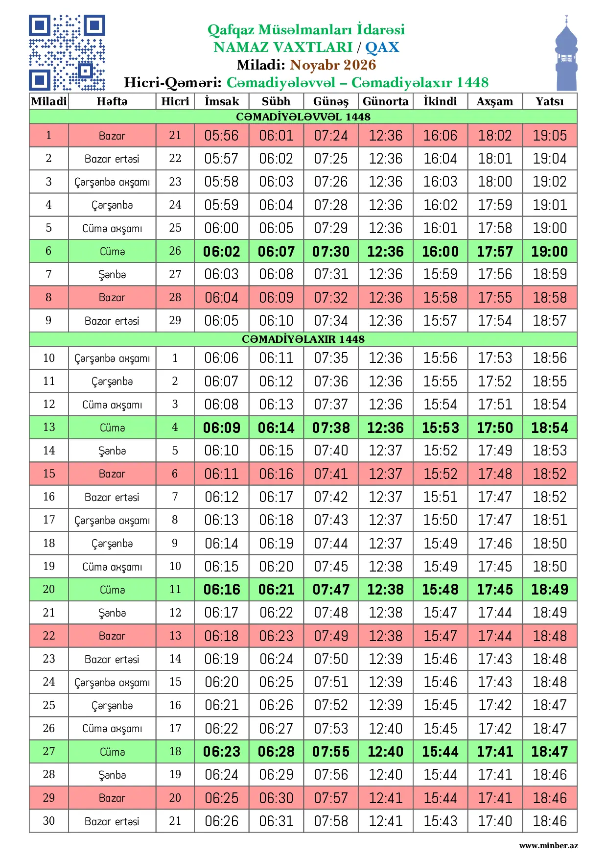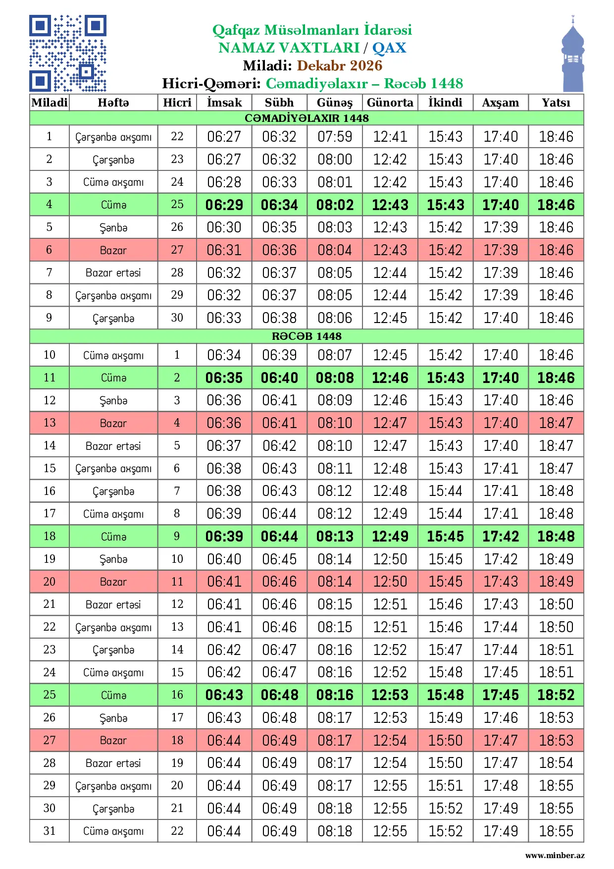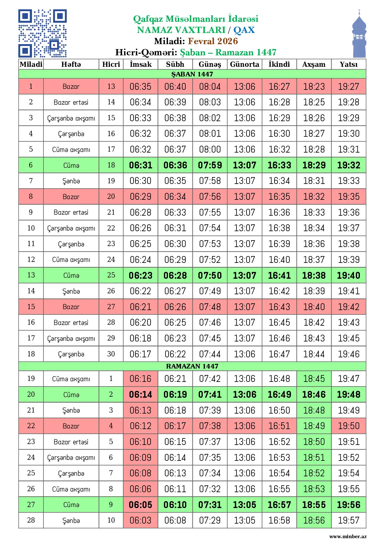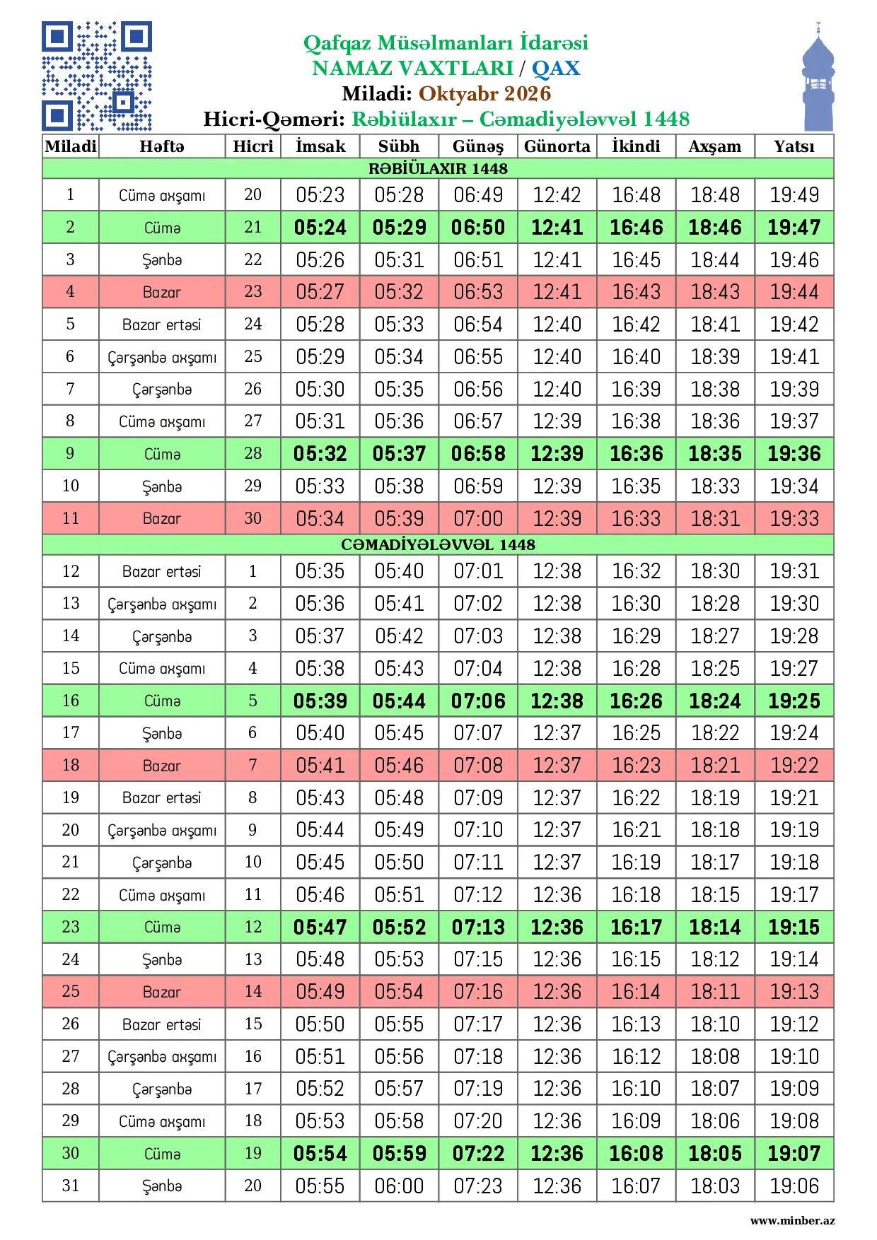 | 25 Aprel 2026 | Şənbə | 8 Zilqədə 1447 | 04:22 | 04:27 | 05:58 | 12:50 | 17:42 | 19:59 | 21:08 |