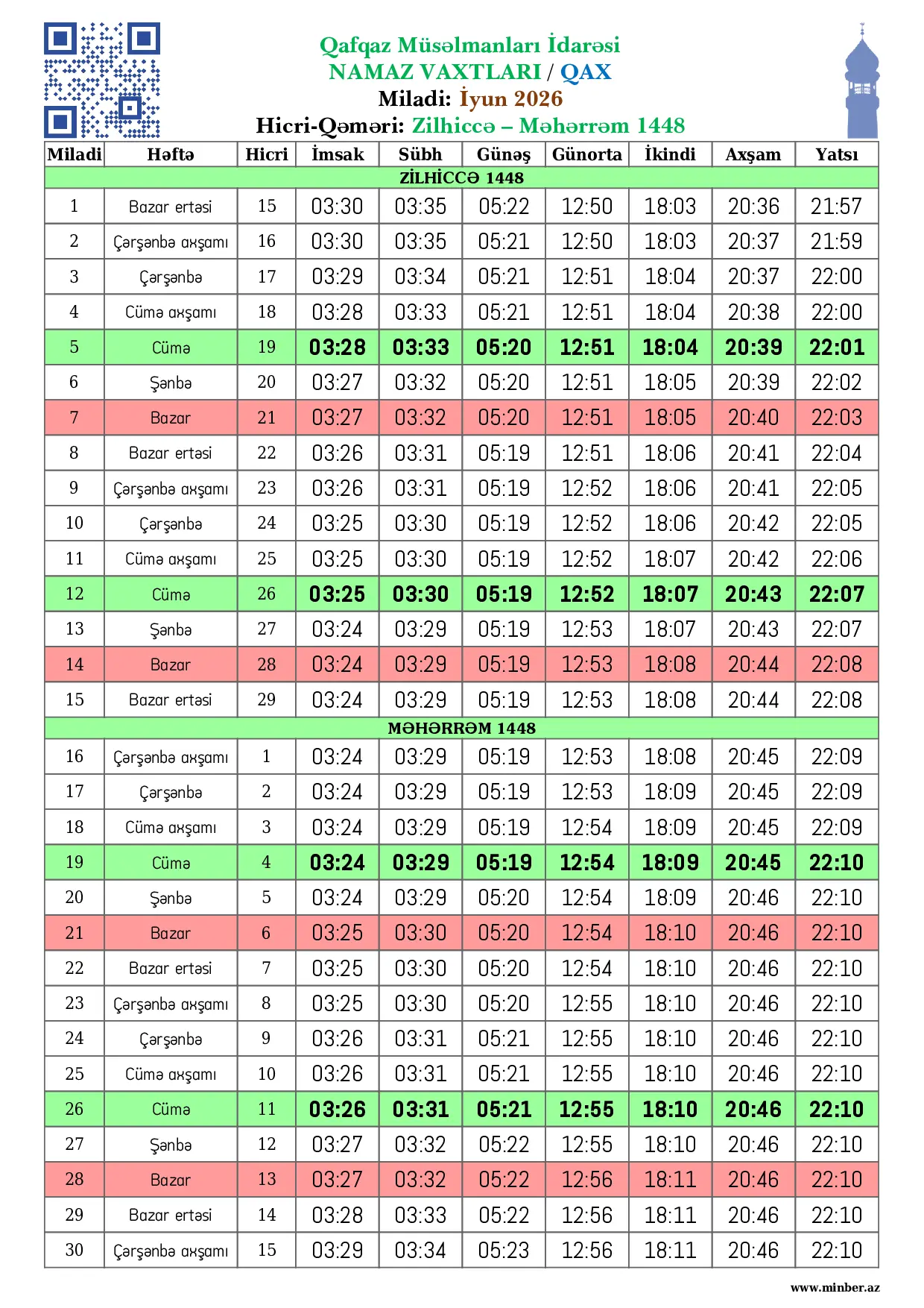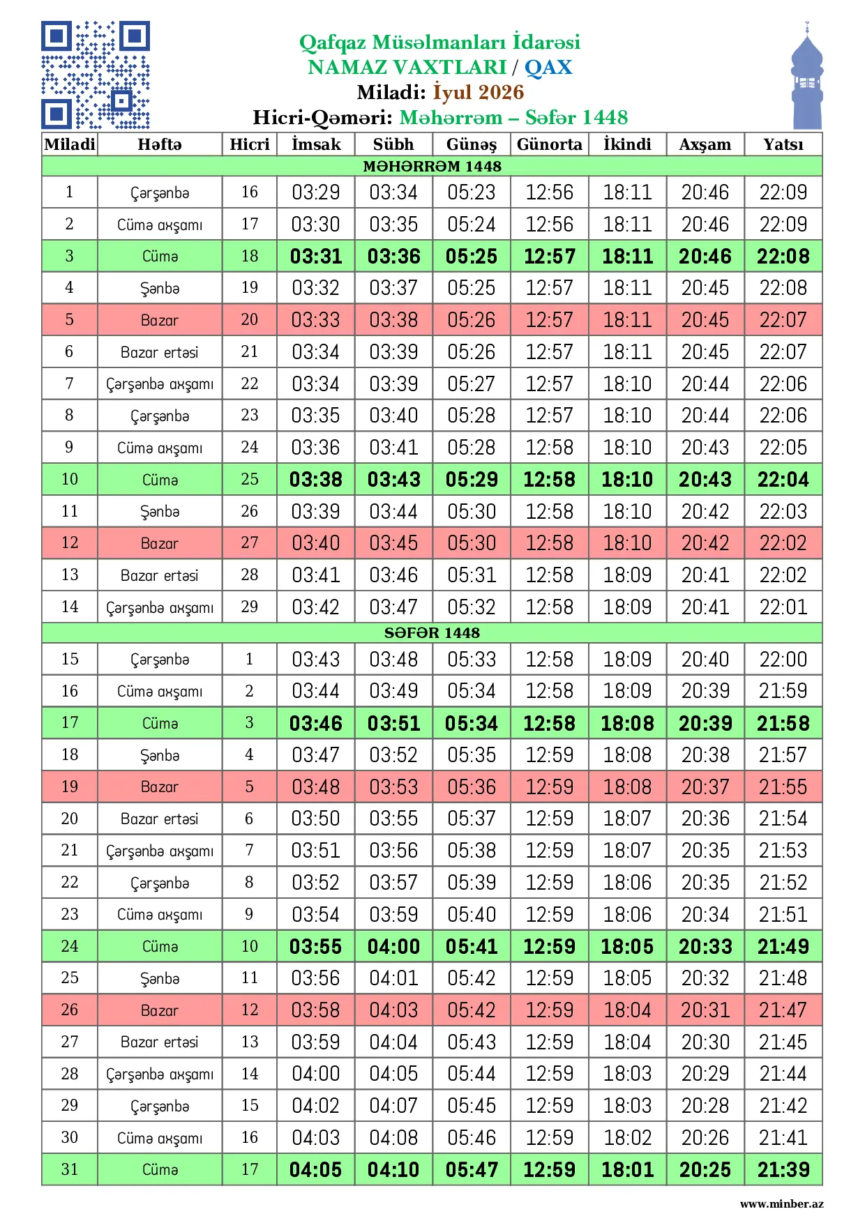 | Miladi | Həftə | Hicri | İmsak | Sübh namazı | Günəş | Günorta namazı | İkindi namazı | Axşam namazı | Yatsı namazı |