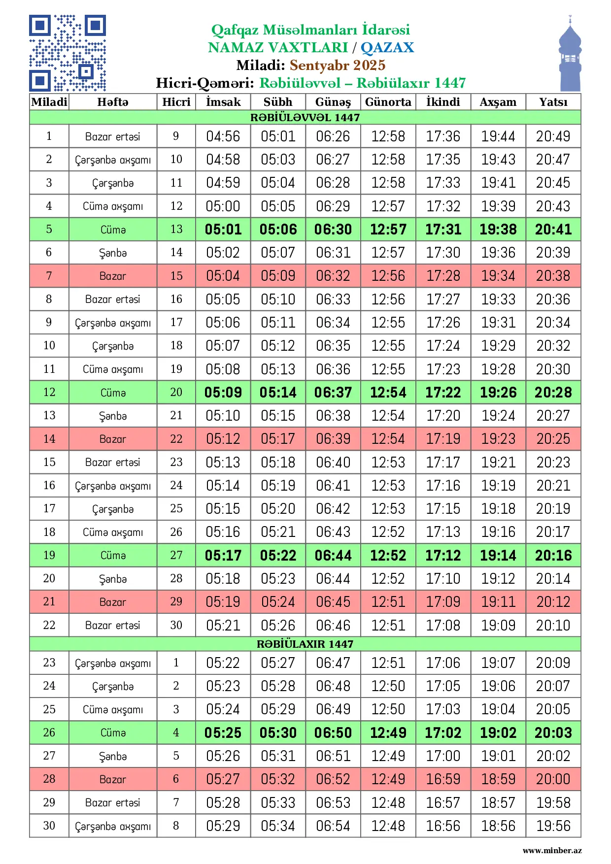 | 17 Noyabr 2025 | Bazar ertəsi | 26 Cəmadiyələvvəl 1447 | 06:19 | 06:24 | 07:48 | 12:43 | 15:58 | 17:54 | 18:58 |