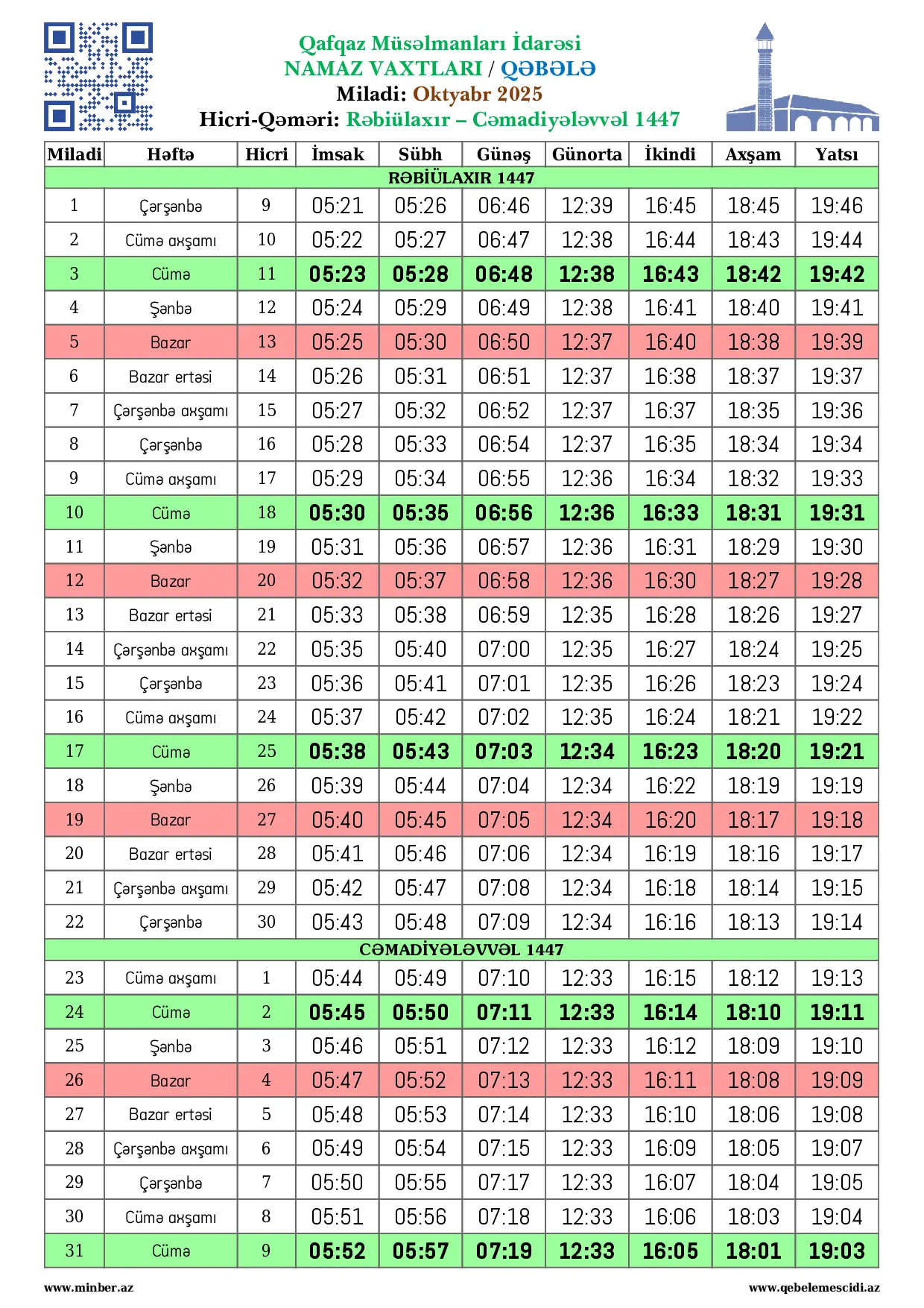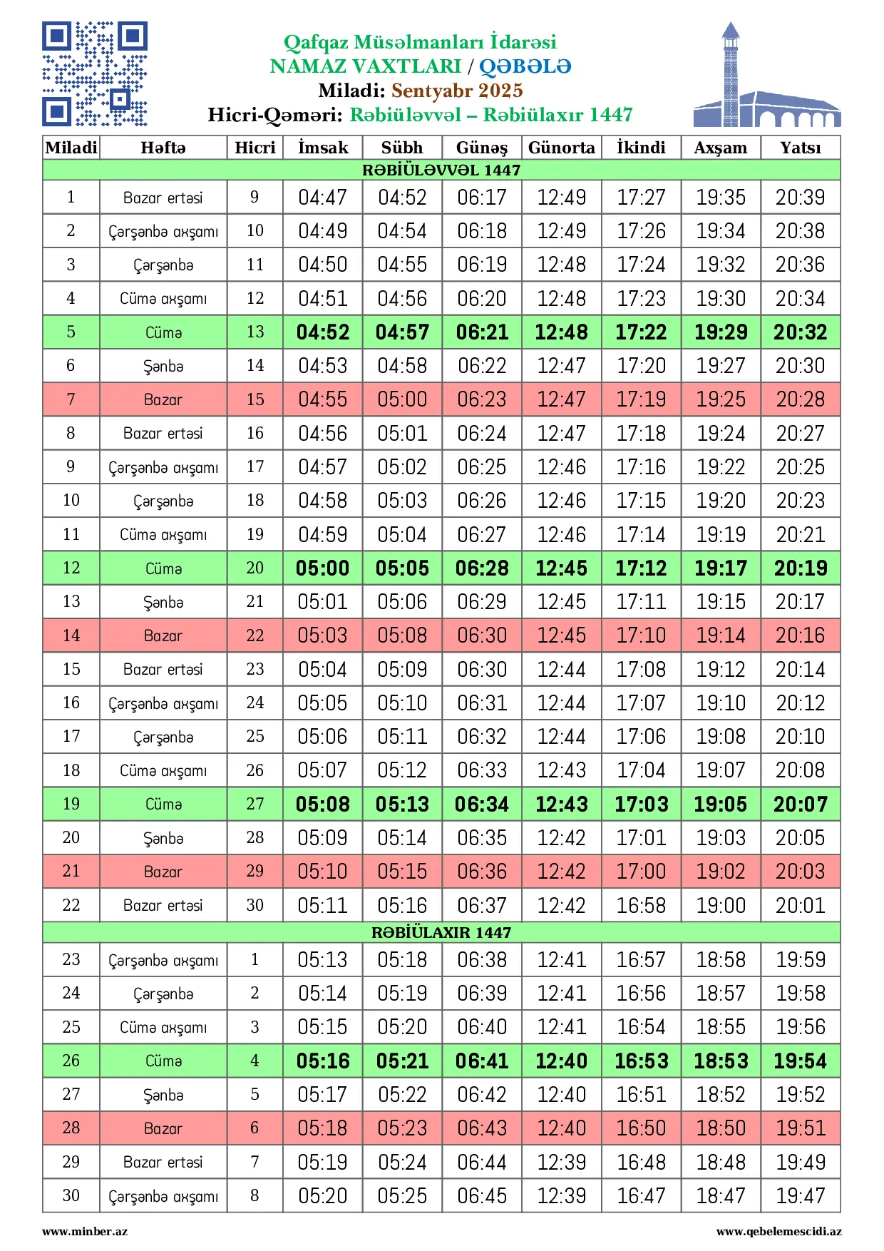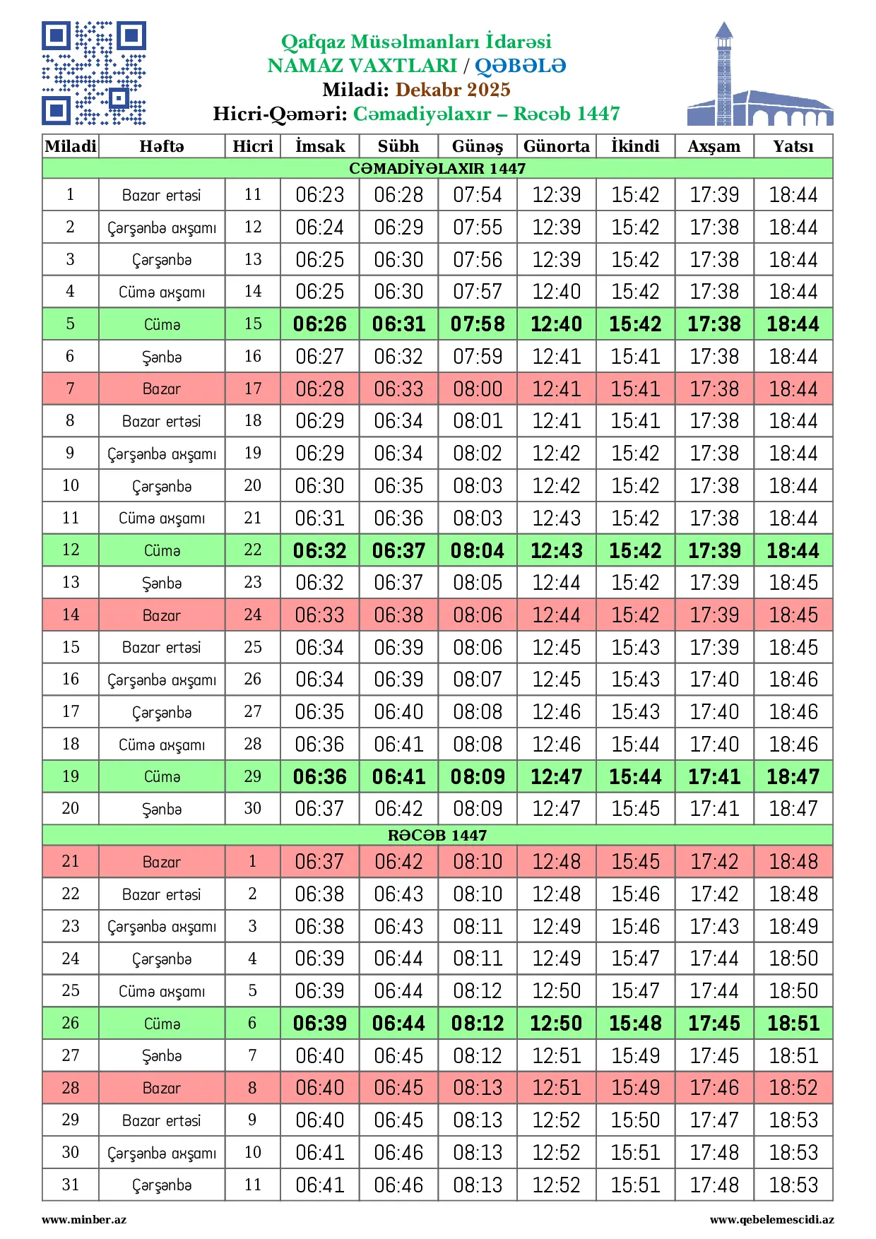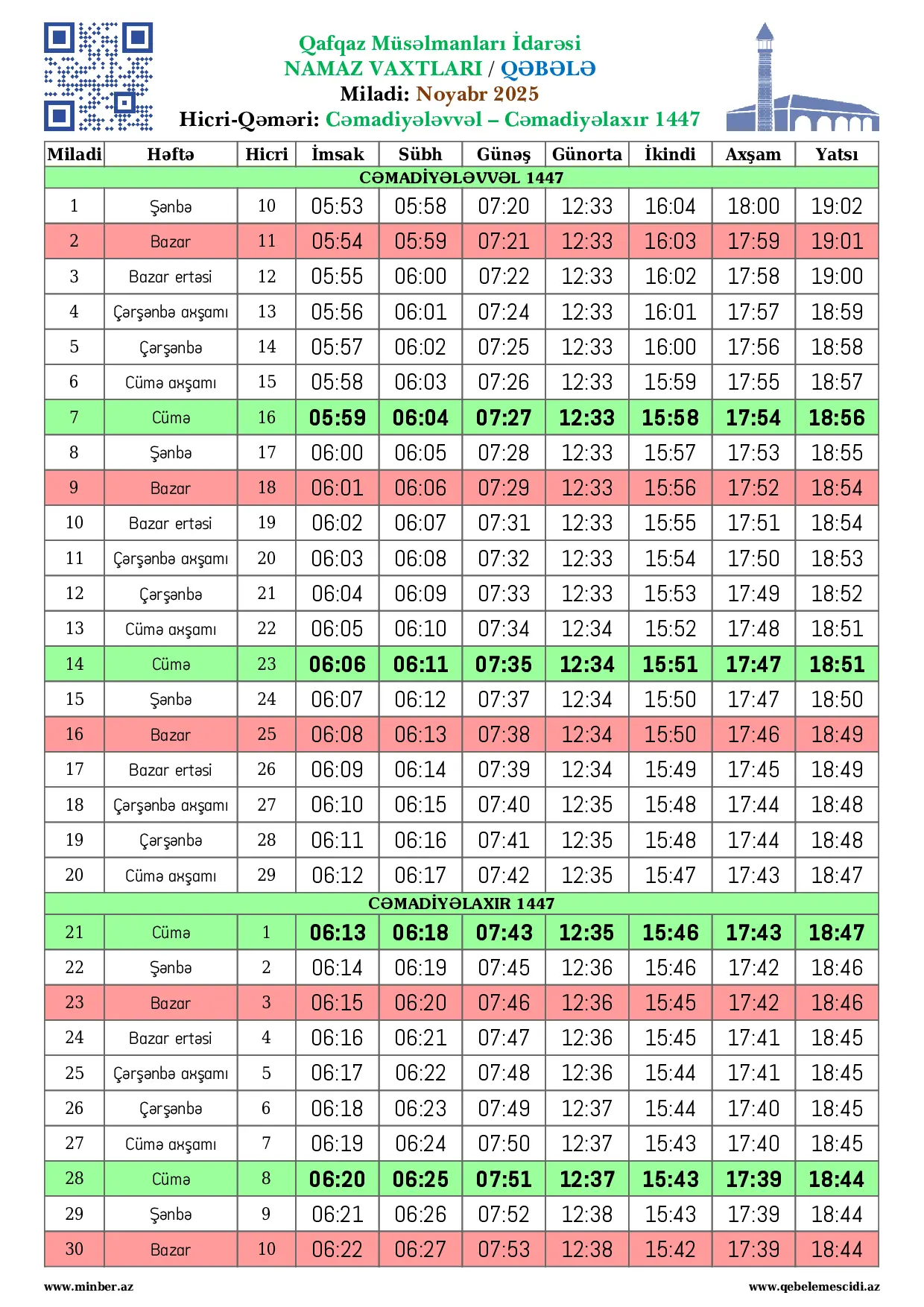 | 17 Noyabr 2025 | Bazar ertəsi | 26 Cəmadiyələvvəl 1447 | 06:09 | 06:14 | 07:39 | 12:34 | 15:49 | 17:45 | 18:49 |