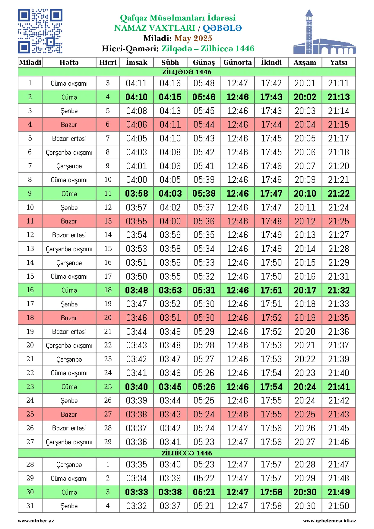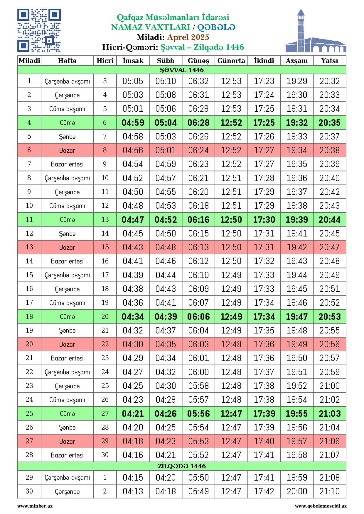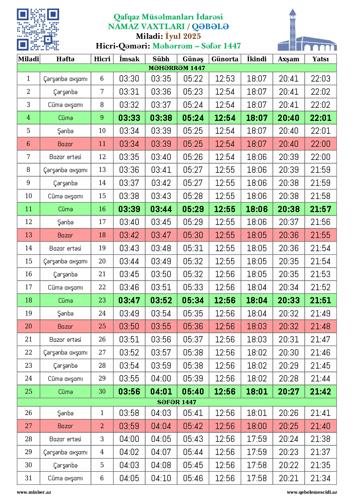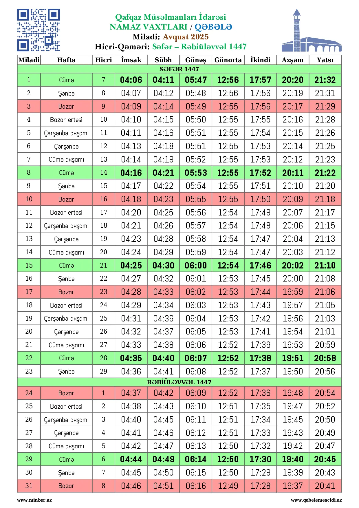 | 17 Noyabr 2025 | Bazar ertəsi | 26 Cəmadiyələvvəl 1447 | 06:09 | 06:14 | 07:39 | 12:34 | 15:49 | 17:45 | 18:49 |