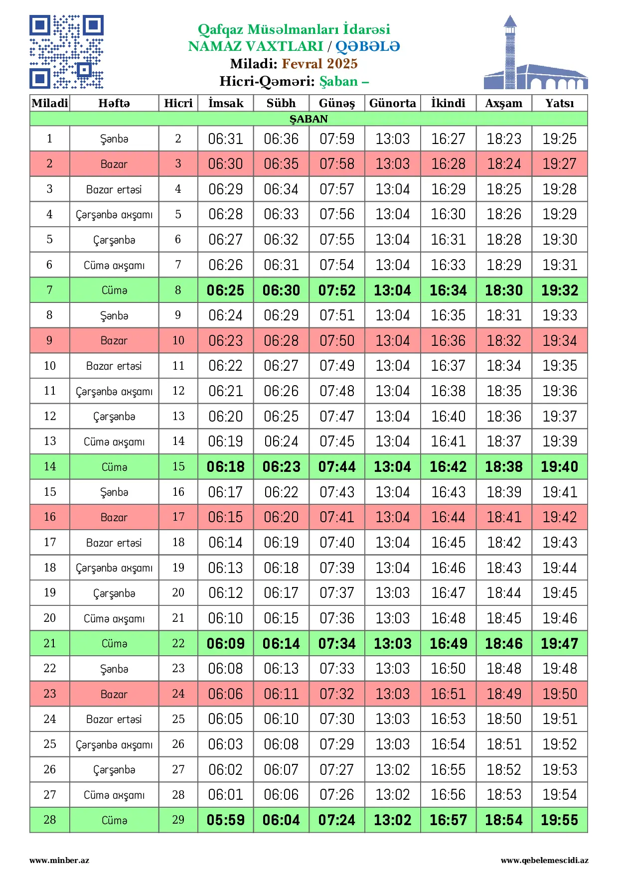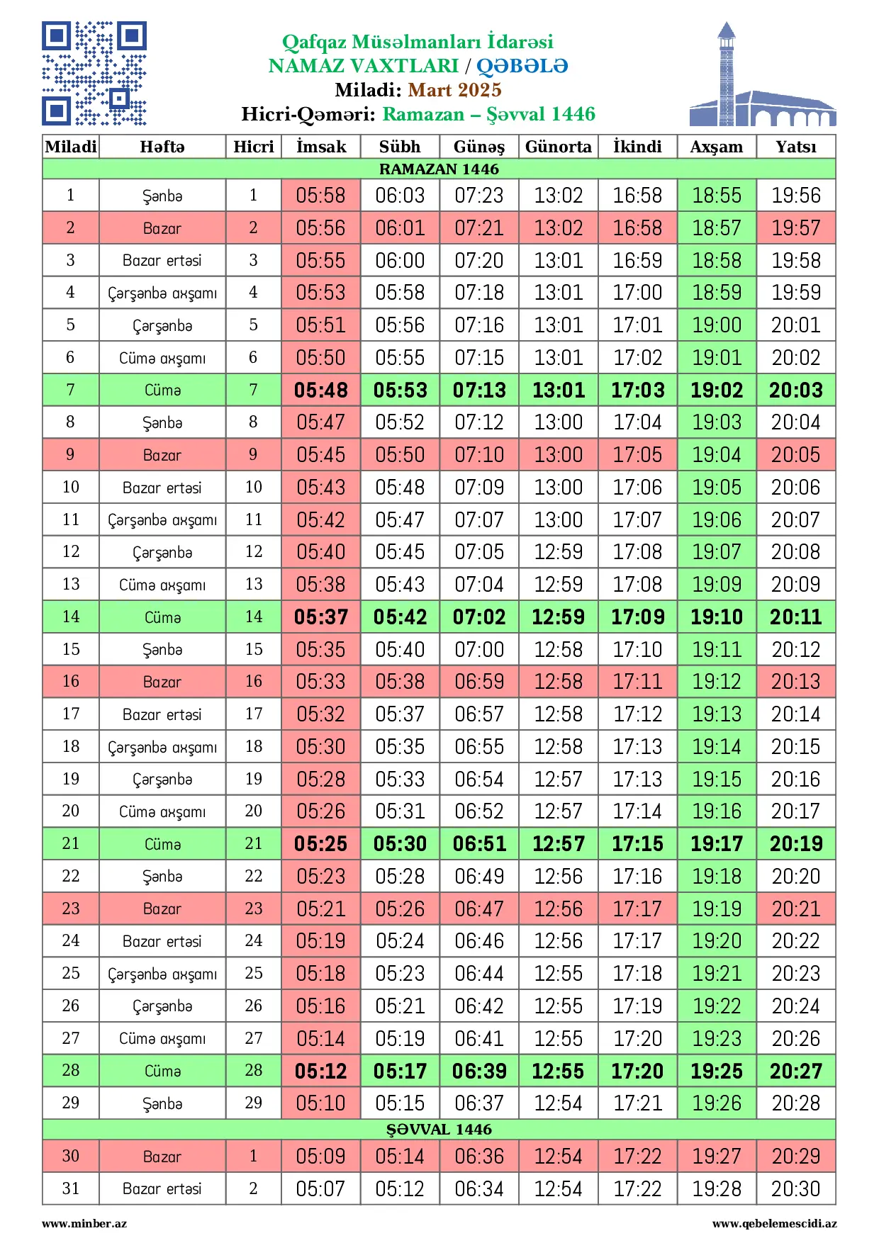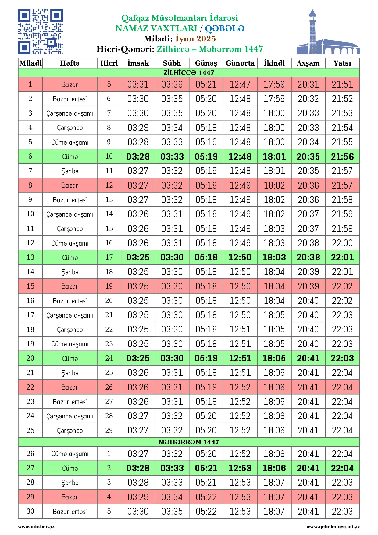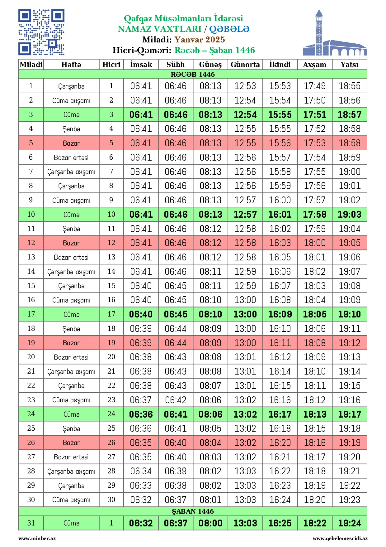 | 17 Noyabr 2025 | Bazar ertəsi | 26 Cəmadiyələvvəl 1447 | 06:09 | 06:14 | 07:39 | 12:34 | 15:49 | 17:45 | 18:49 |