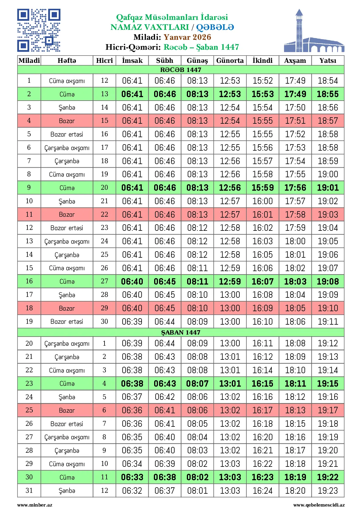 | 5 Yanvar 2026 | Bazar ertəsi | 16 Rəcəb 1447 | 06:41 | 06:46 | 08:13 | 12:55 | 15:55 | 17:52 | 18:58 |