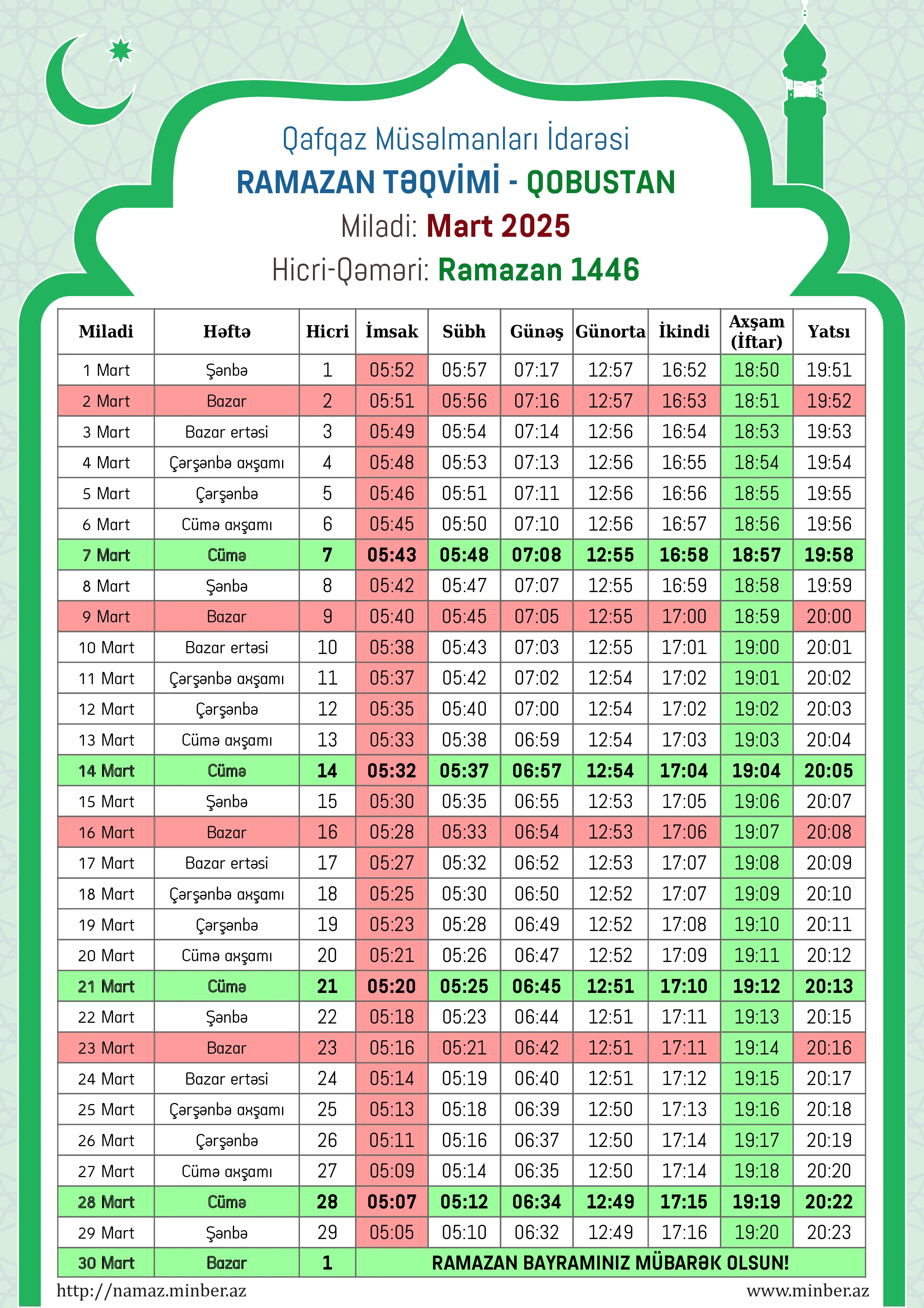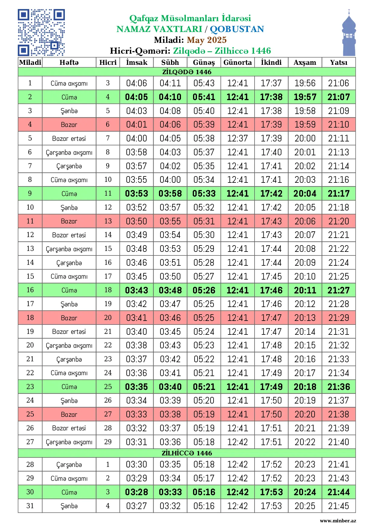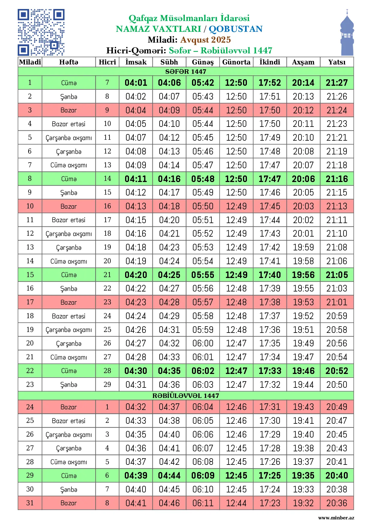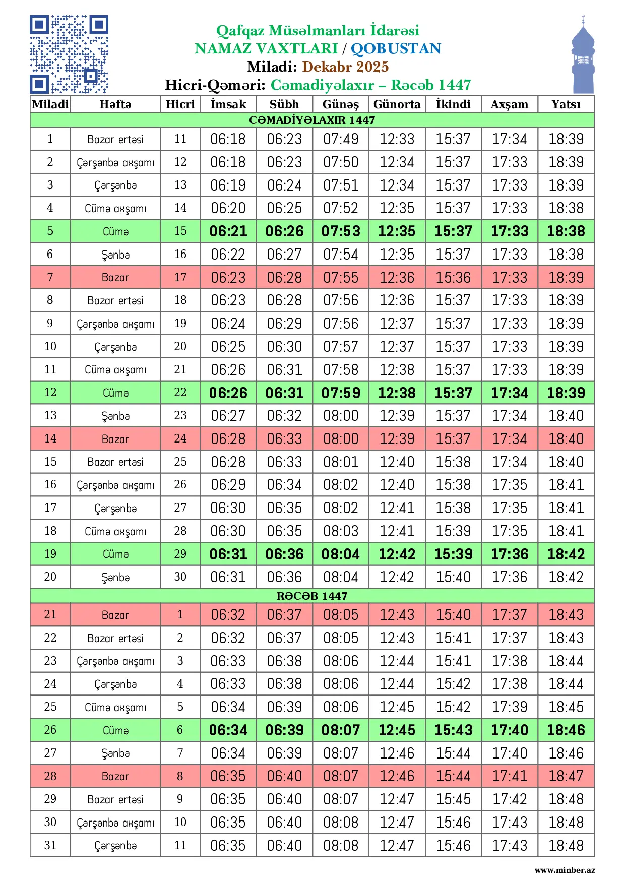 | 23 Noyabr 2025 | Bazar | 3 Cəmadiyəlaxır 1447 | 06:10 | 06:15 | 07:40 | 12:31 | 15:40 | 17:36 | 18:41 |