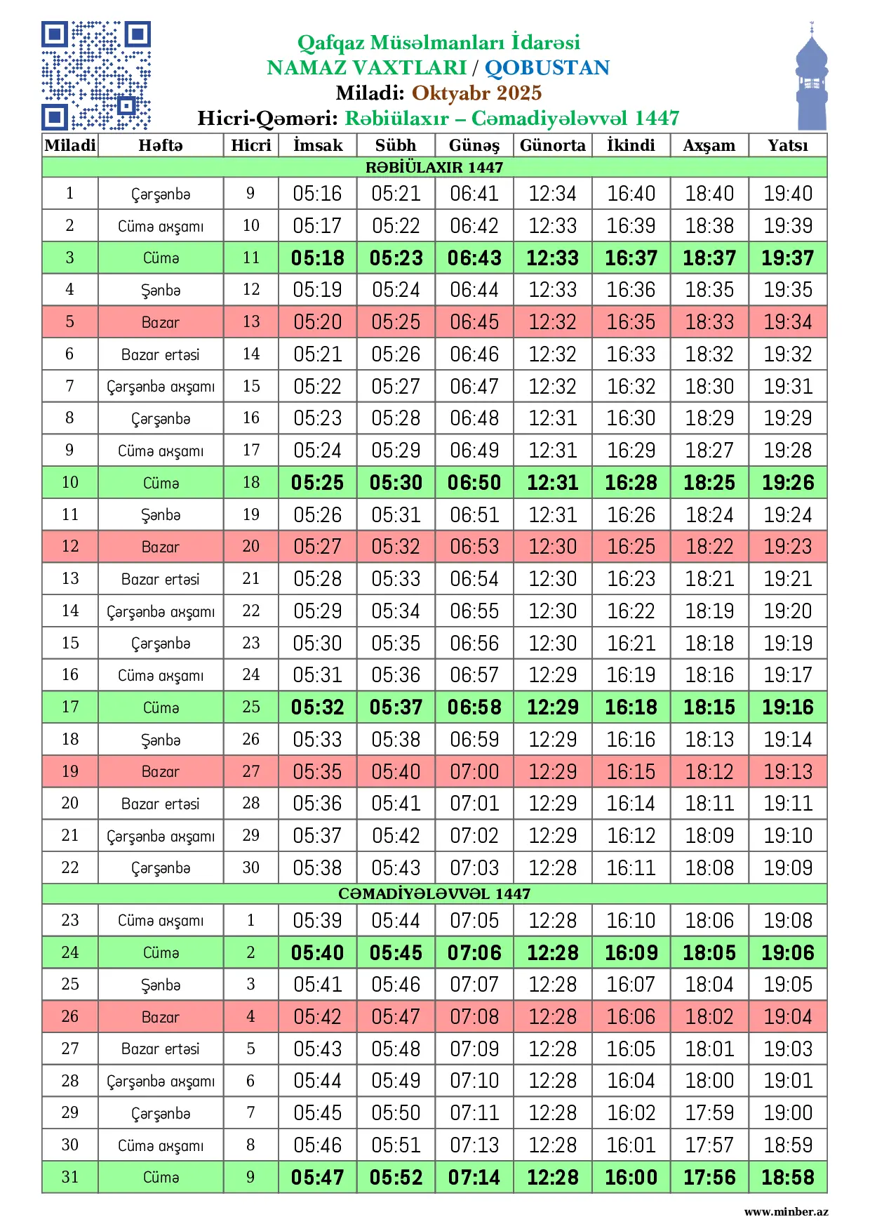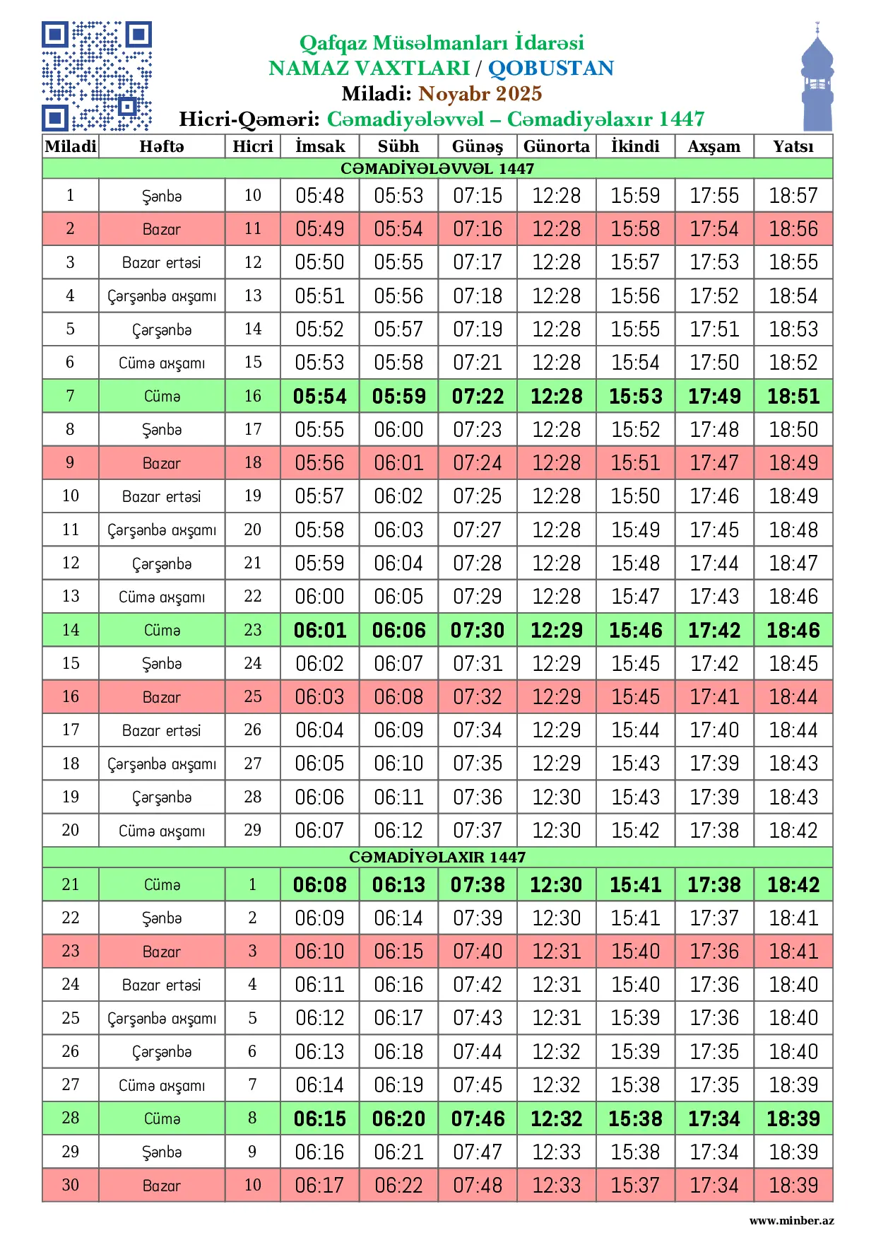 | 17 Noyabr 2025 | Bazar ertəsi | 26 Cəmadiyələvvəl 1447 | 06:04 | 06:09 | 07:34 | 12:29 | 15:44 | 17:40 | 18:44 |