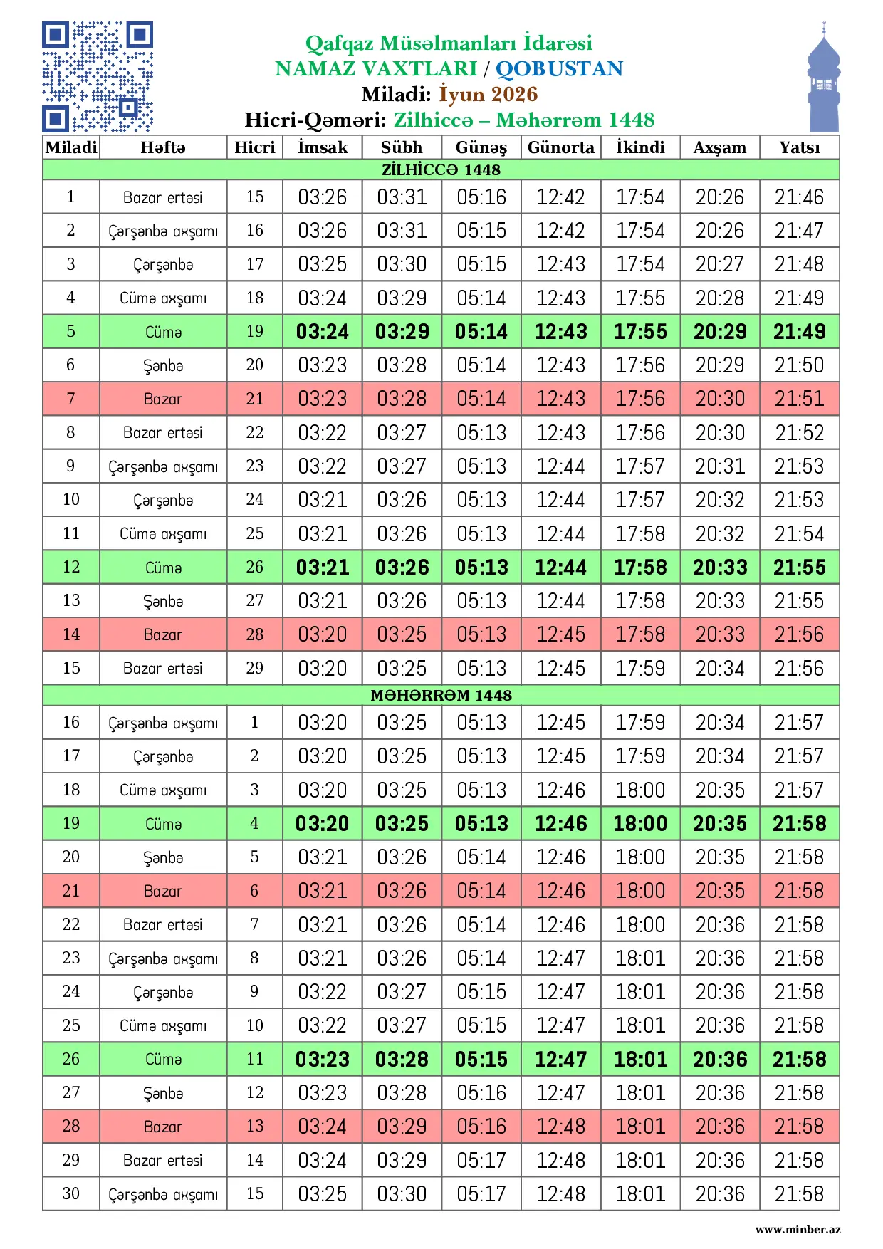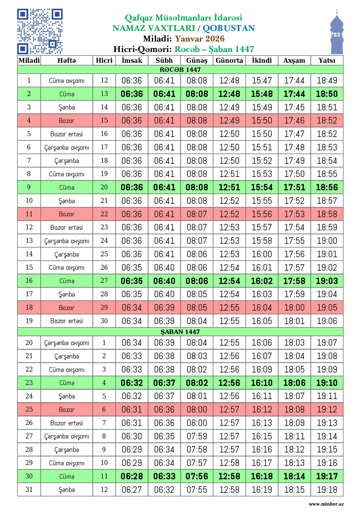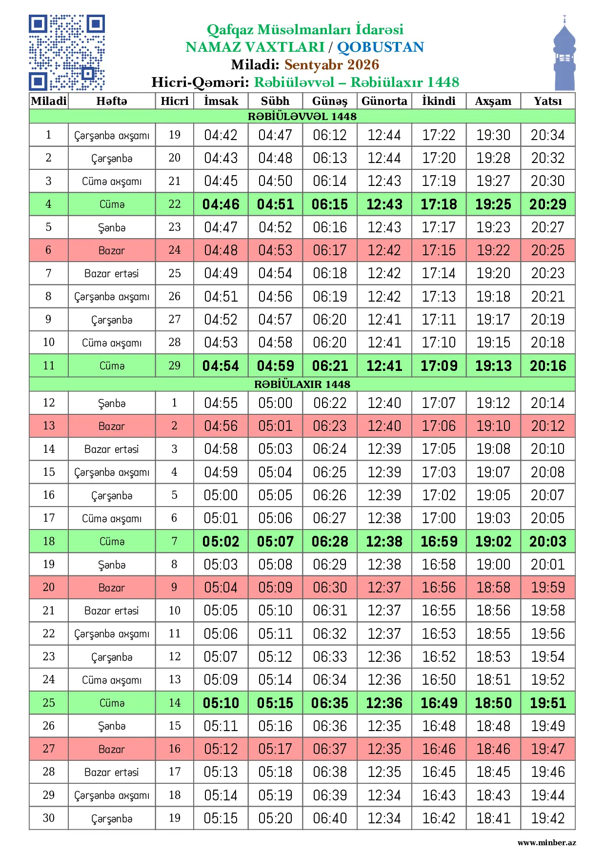 | 26 Fevral 2026 | Cümə axşamı | 8 Ramazan 1447 | 05:58 | 06:03 | 07:23 | 12:57 | 16:48 | 18:46 | 19:47 |