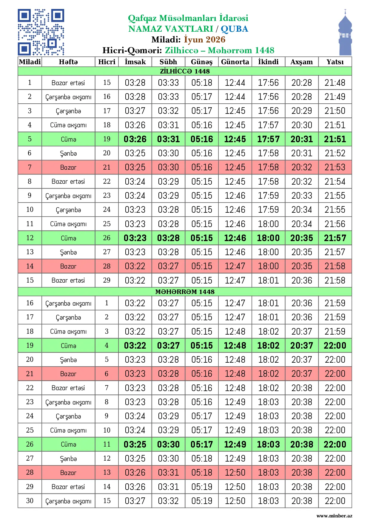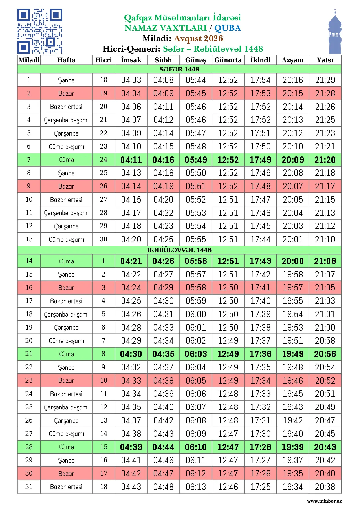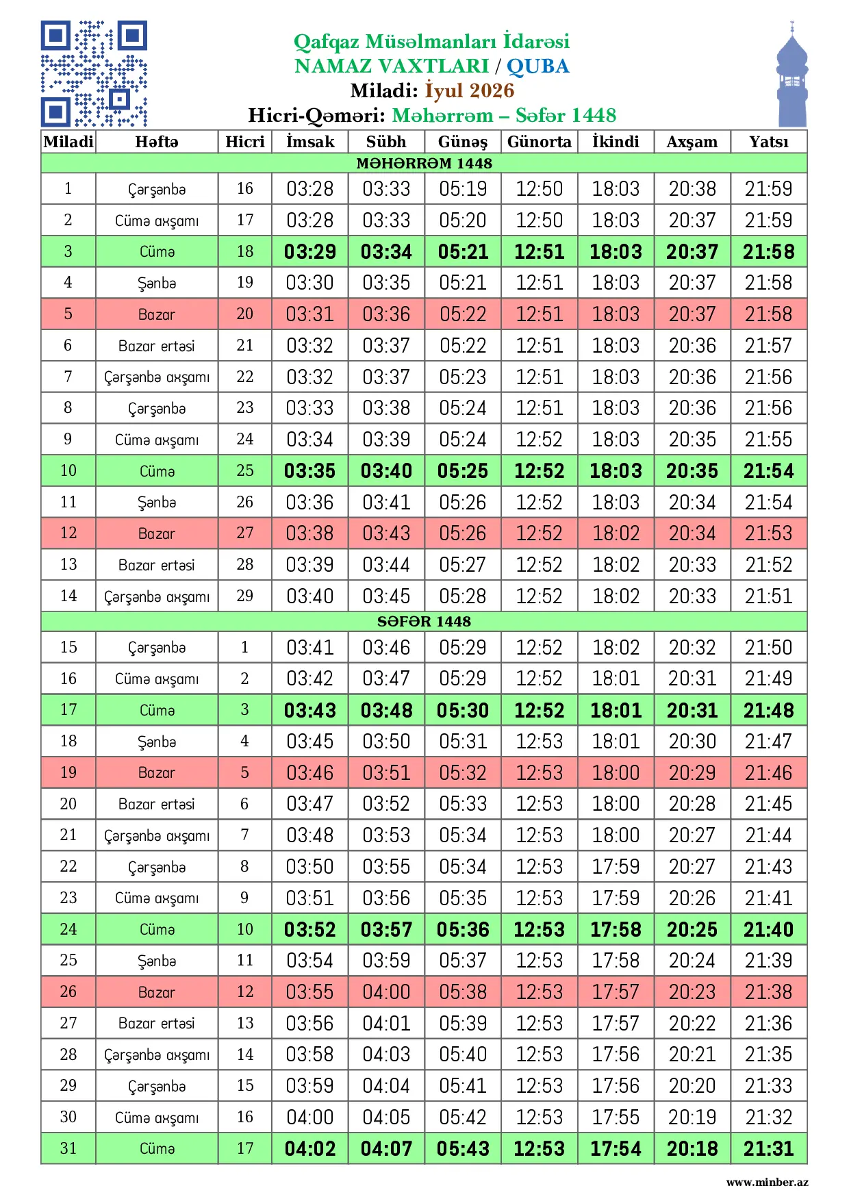 Miladi Həftə Hicri İmsak Sübh namazı Günəş Günorta namazı İkindi namazı Axşam namazı Yatsı namazı